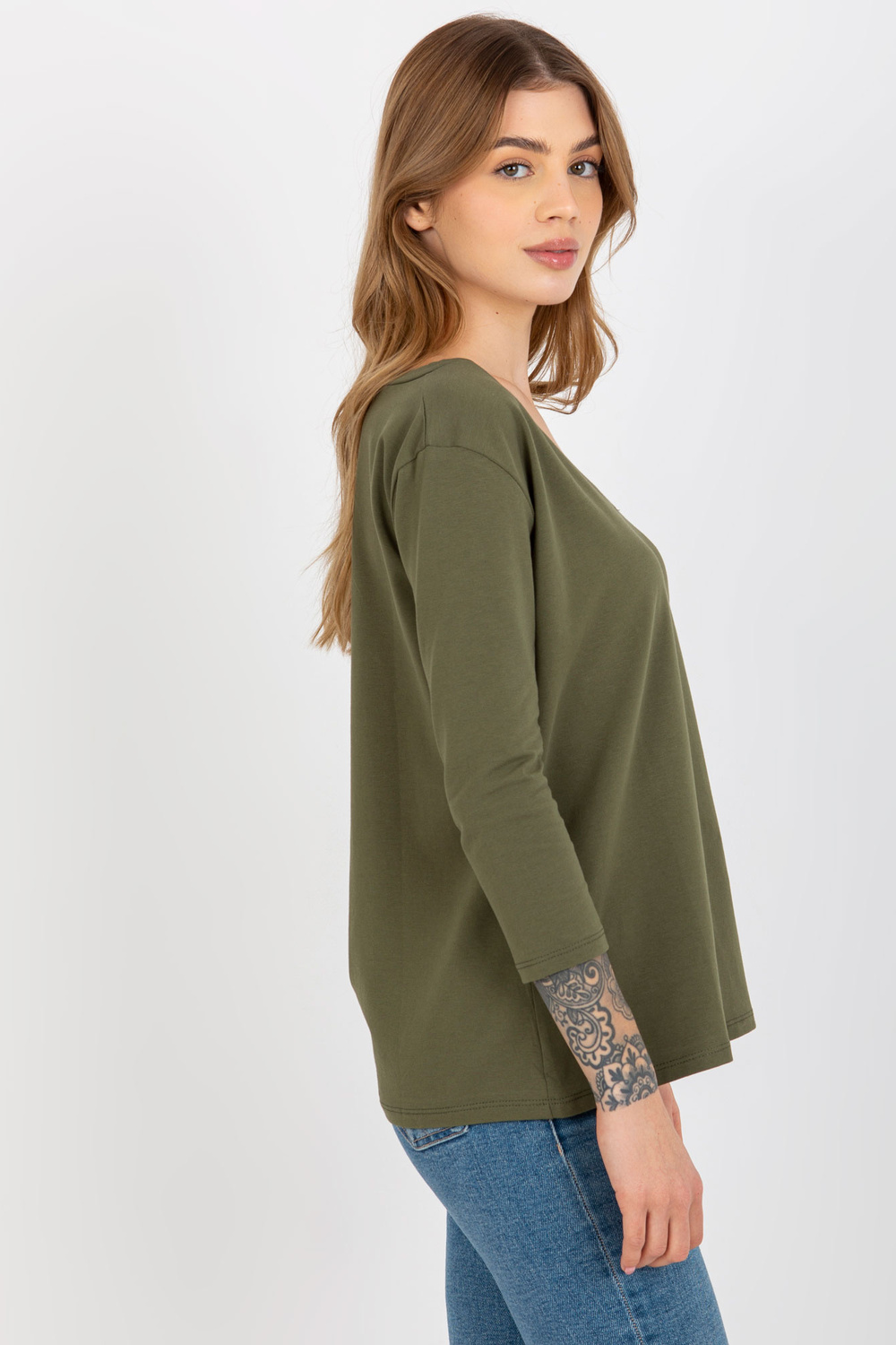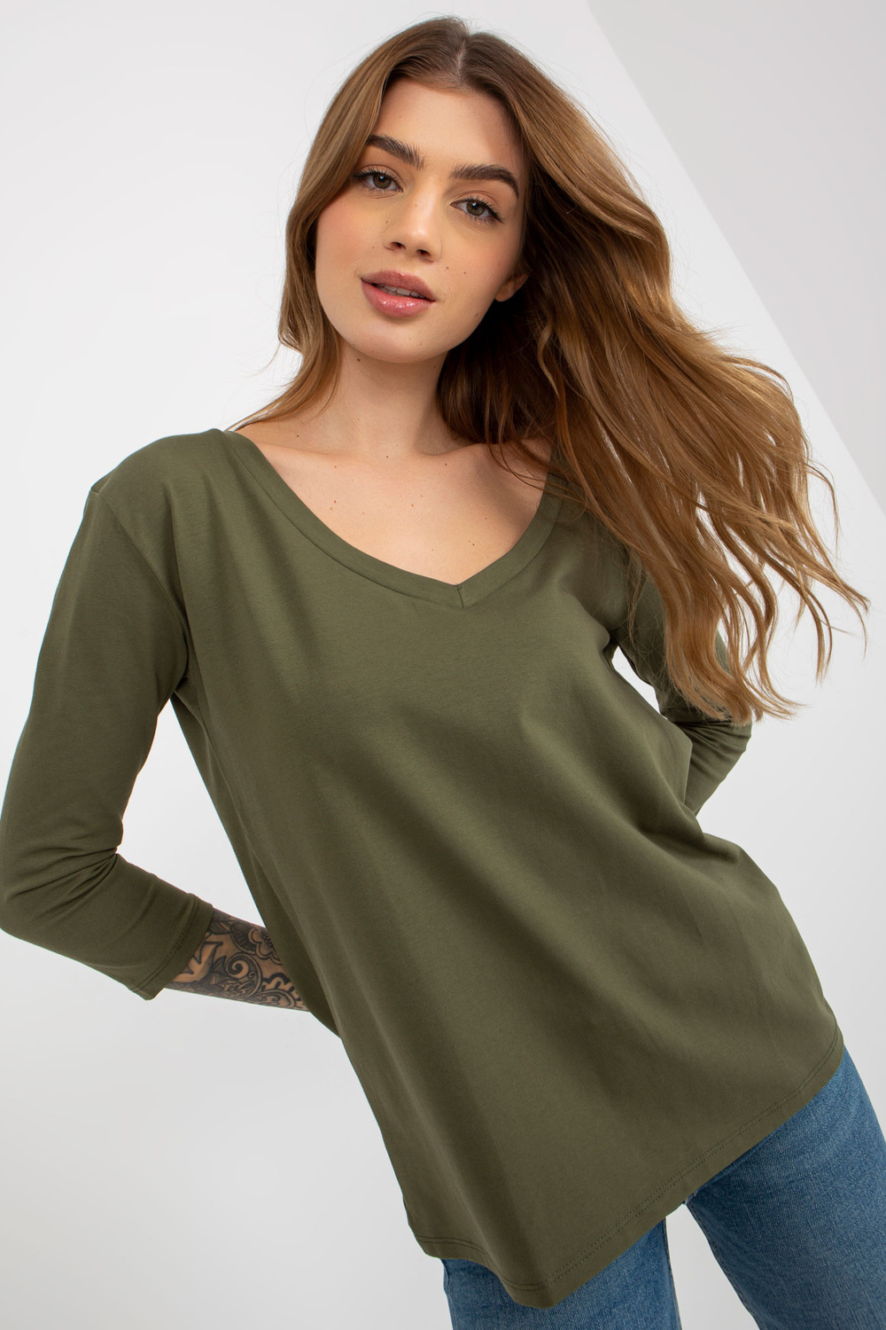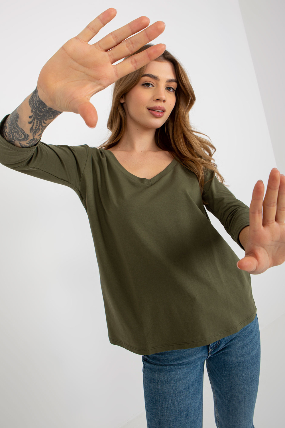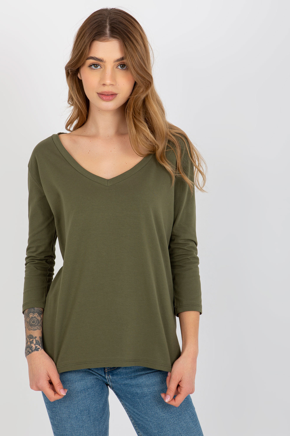 Haki krāsas kokvilnas pamata blūze ar V kakla izgriezumu.
