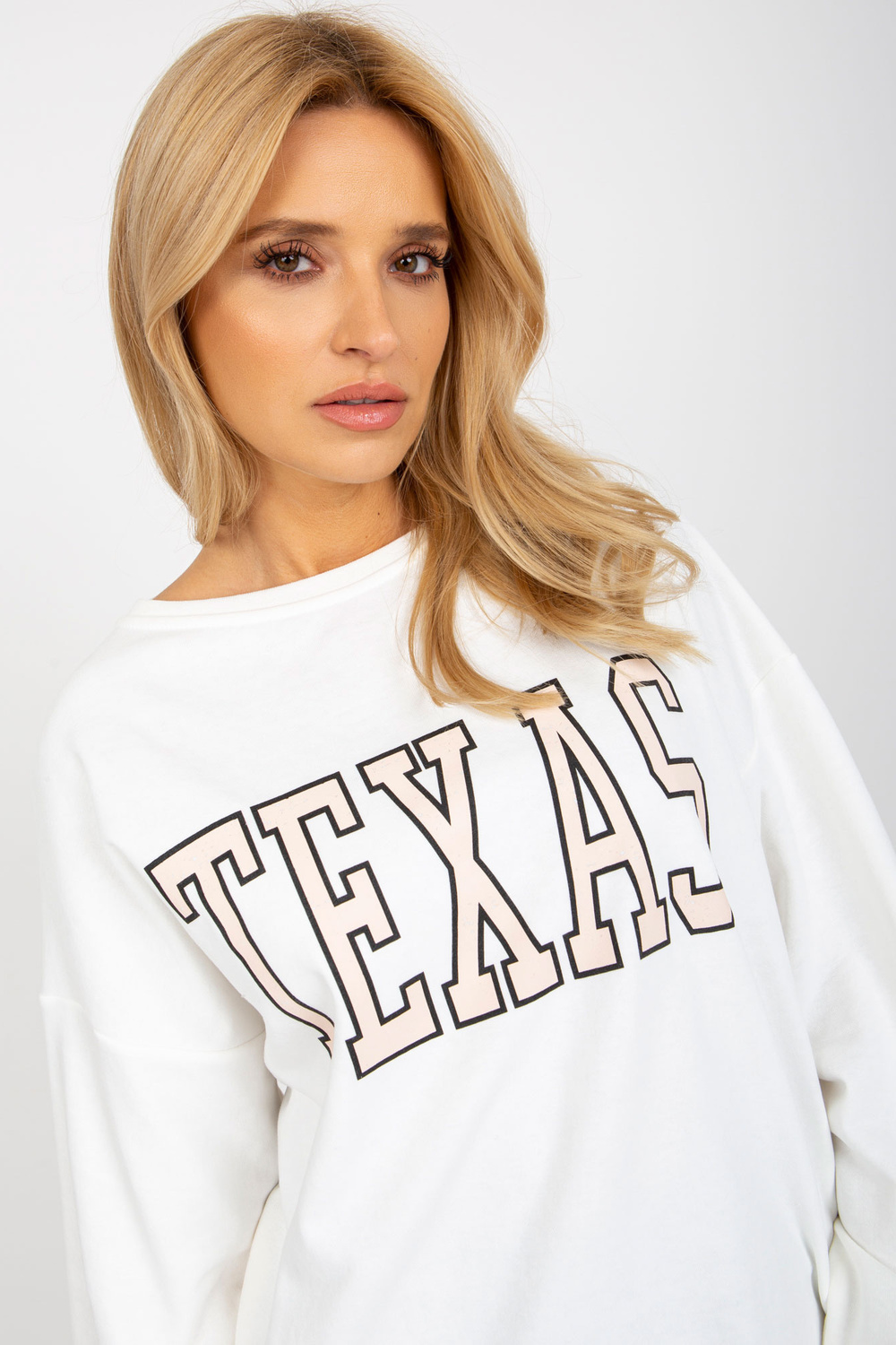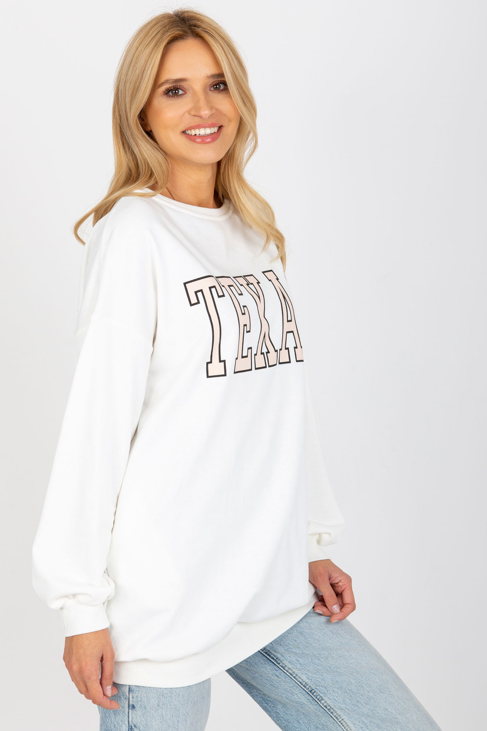 Ecru garš kokvilnas sporta krekls ar apdruku.