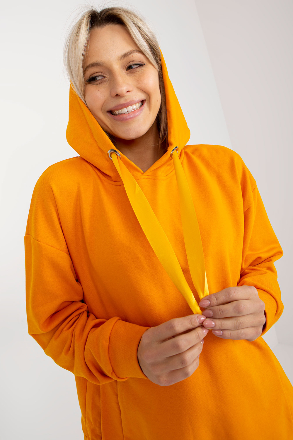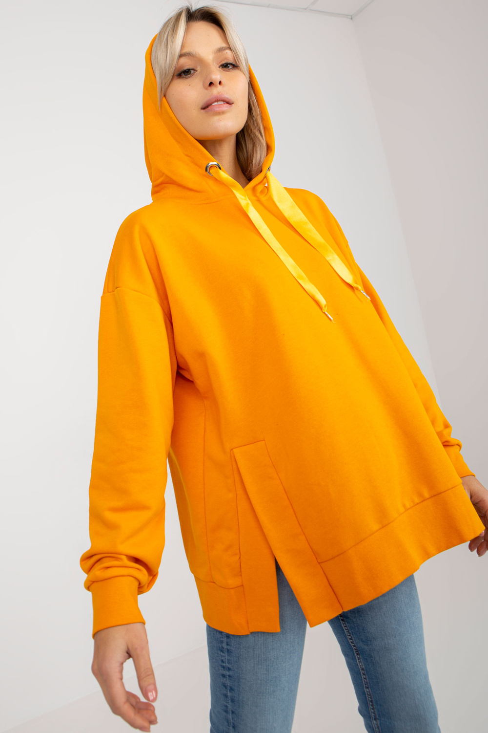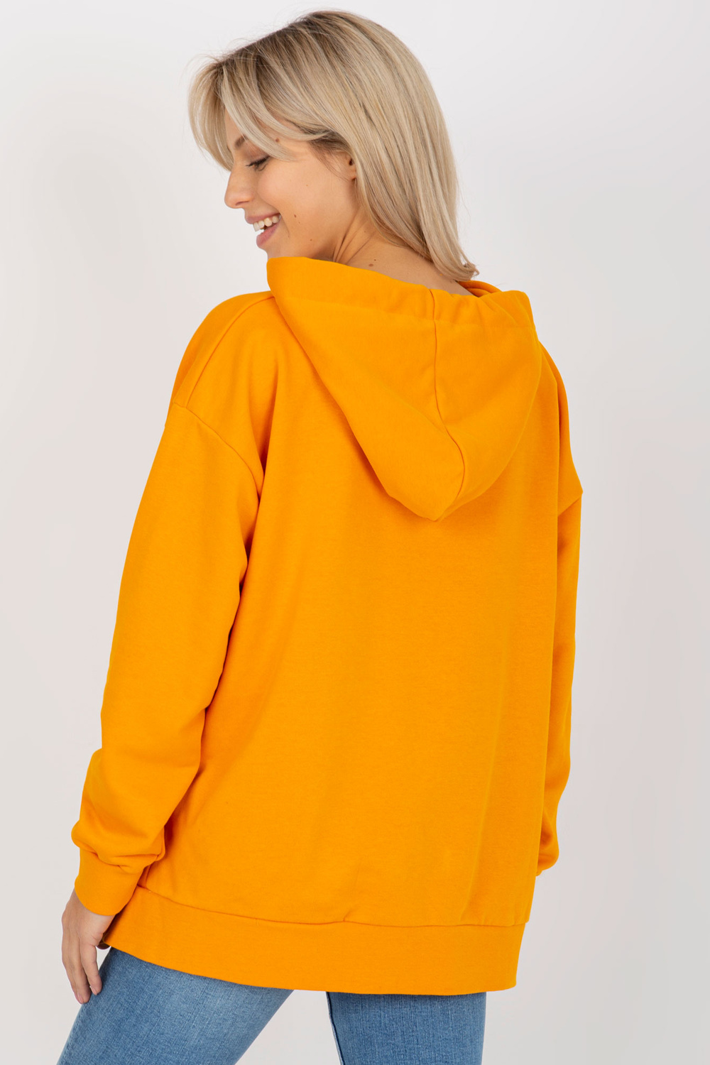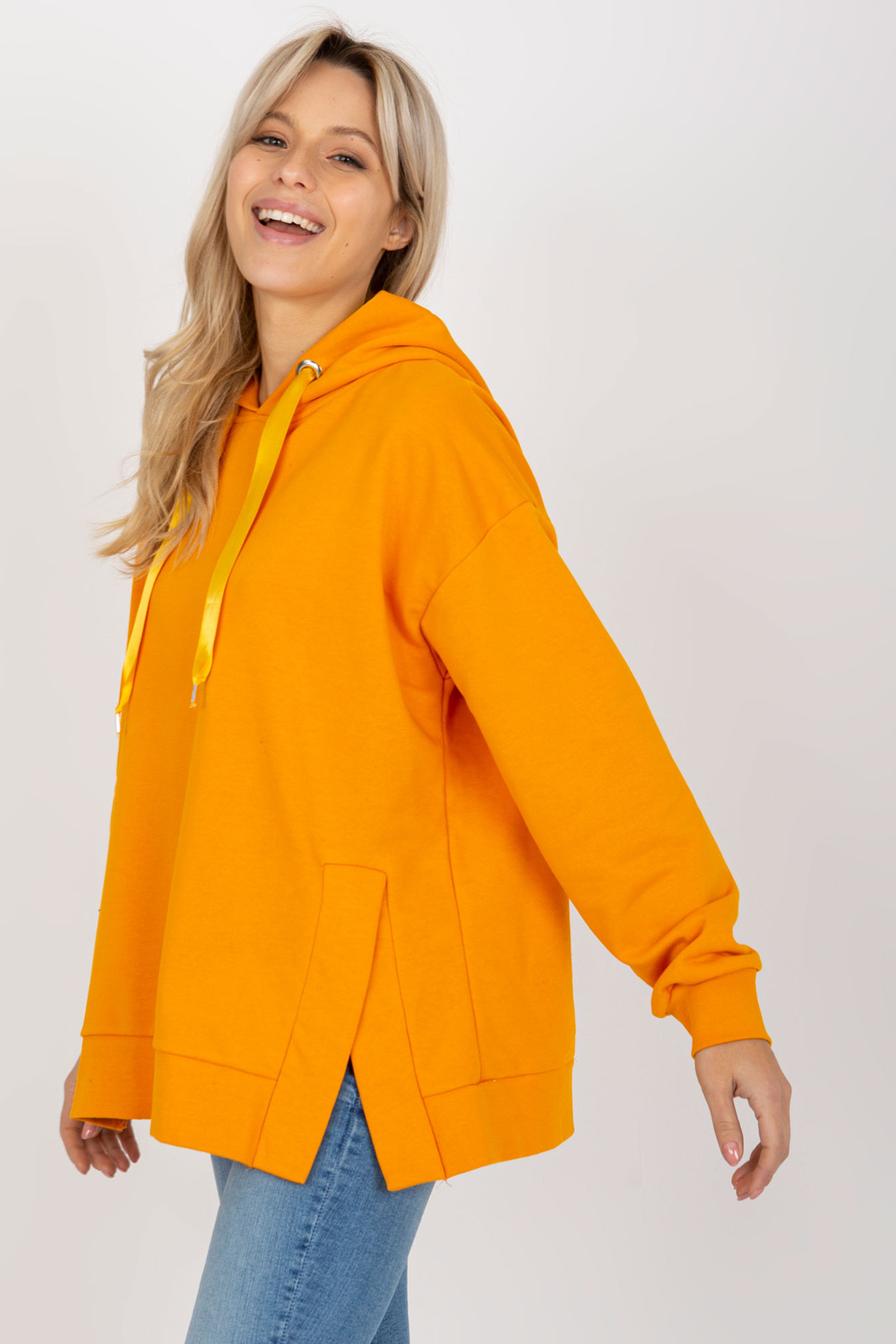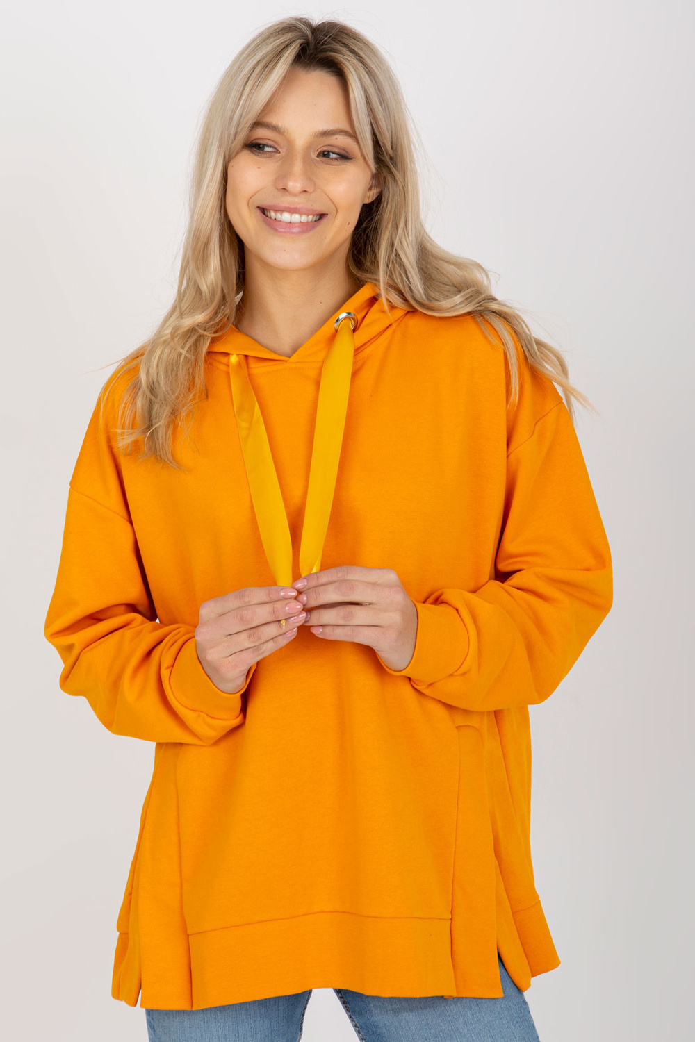Tumši dzeltens sporta krekls ar kapuci un svītrām.