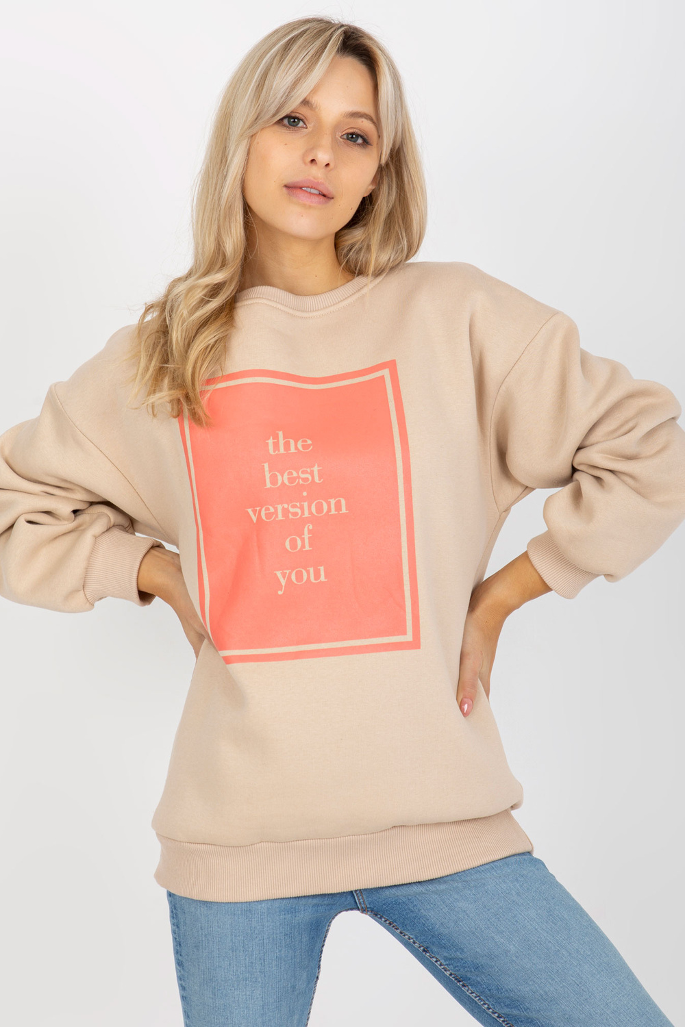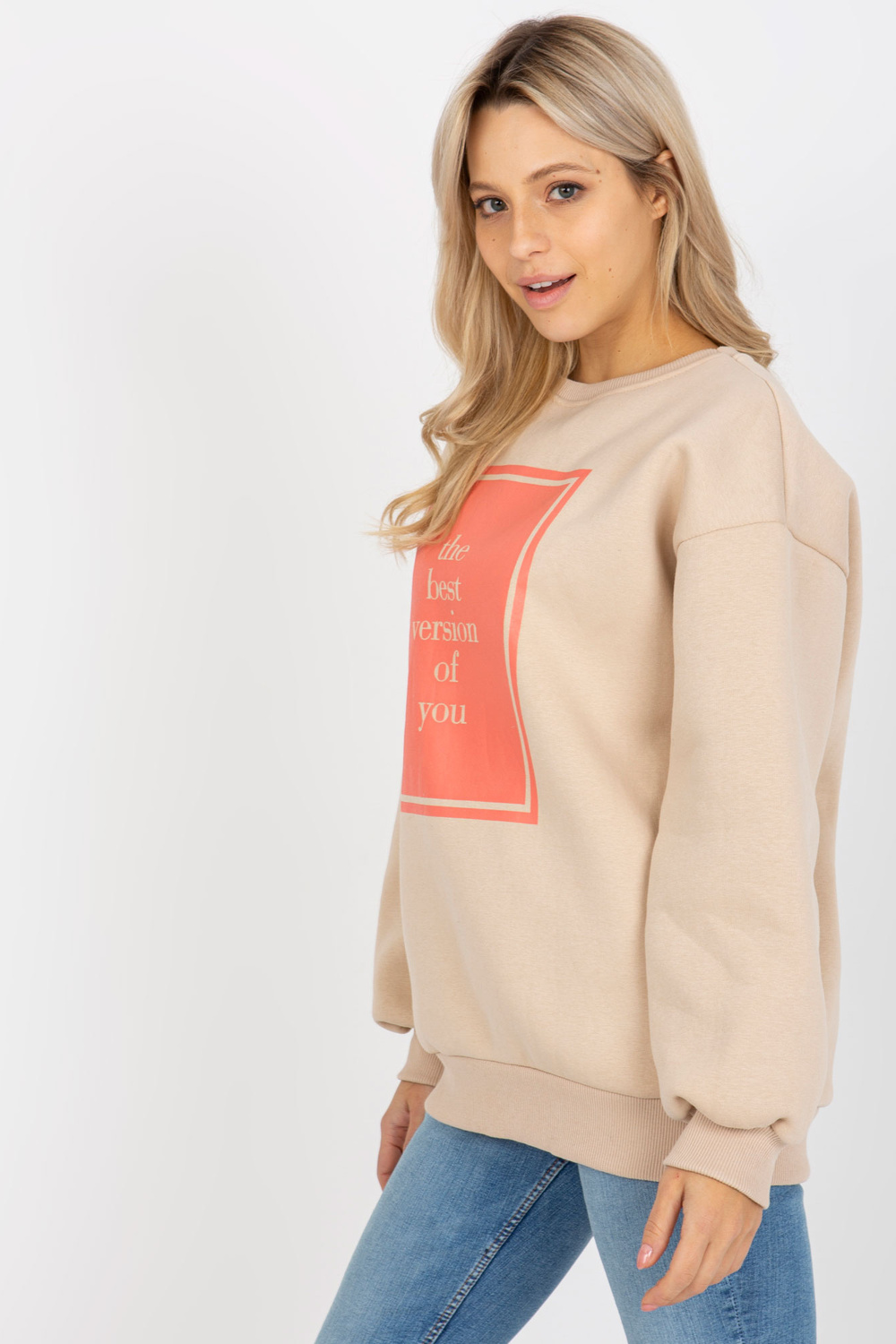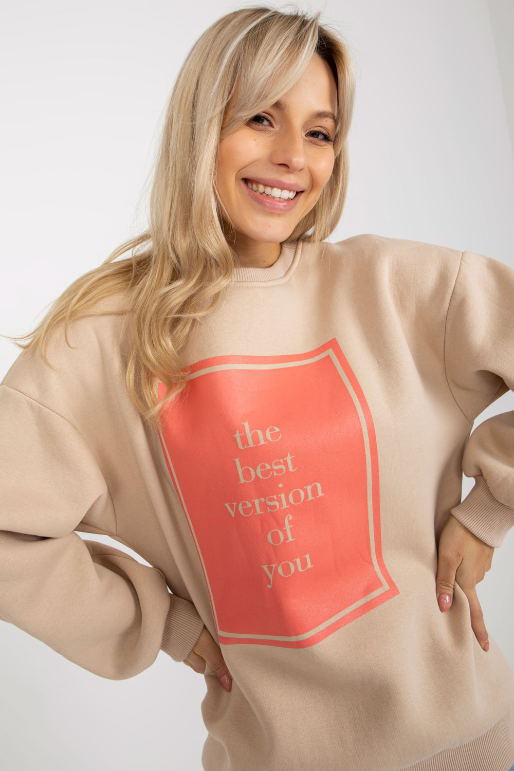 Bēšs liela izmēra sporta krekls ar apdruku.