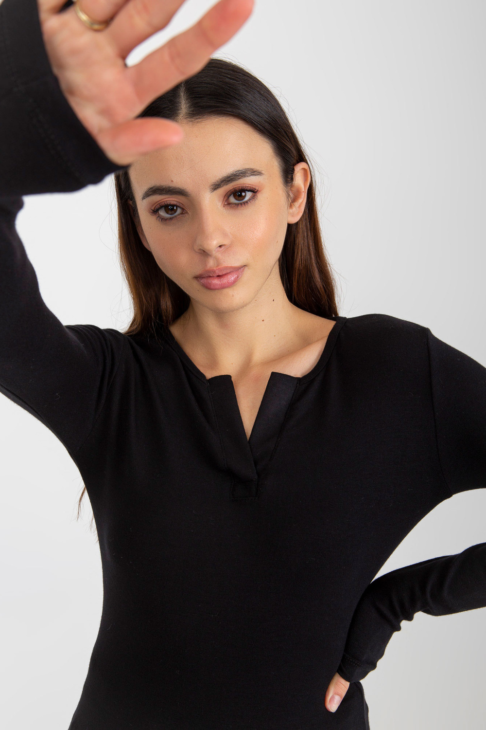 Melna viskozes ikdienas blūze ar V kakla izgriezumu.
