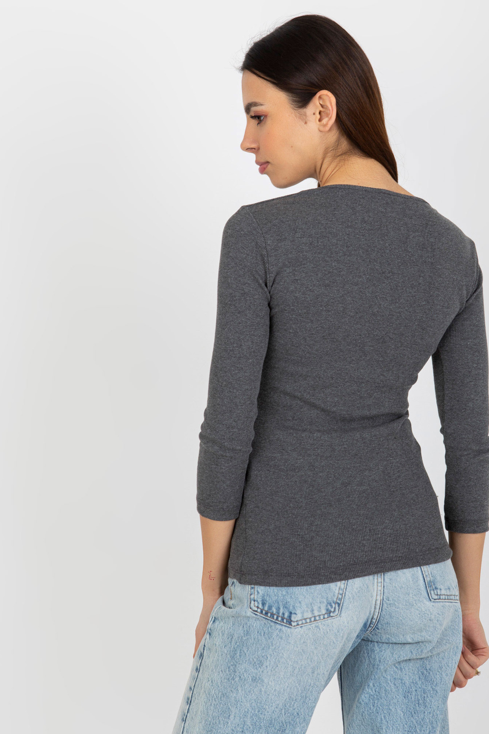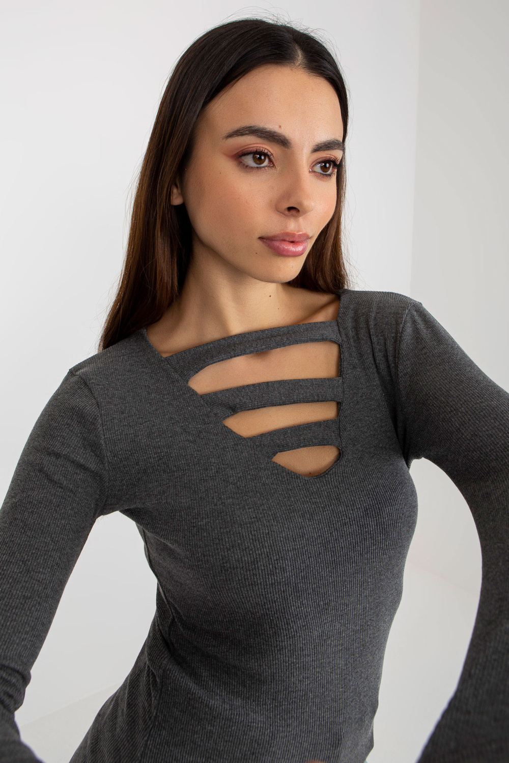 Tumši pelēka rievota blūze ar izgriezumiem kakla izgriezumā.