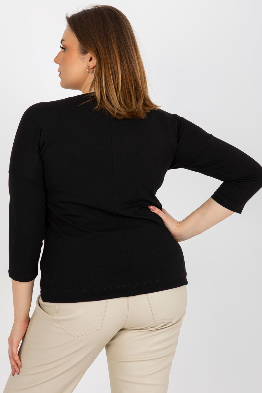 Melna liela izmēra sieviešu blūze ar apdruku un uzrakstiem. Produkta kods: RV-BZ-8470.93P Dominējošais raksts: apdruka Stils: ikdienišķs gadījums: ikdienišķs, darbam, pastaigai, pilsētā Modele valkā viena izmēra izmēru. Modeļa izmēri: augums 176 cm, bu