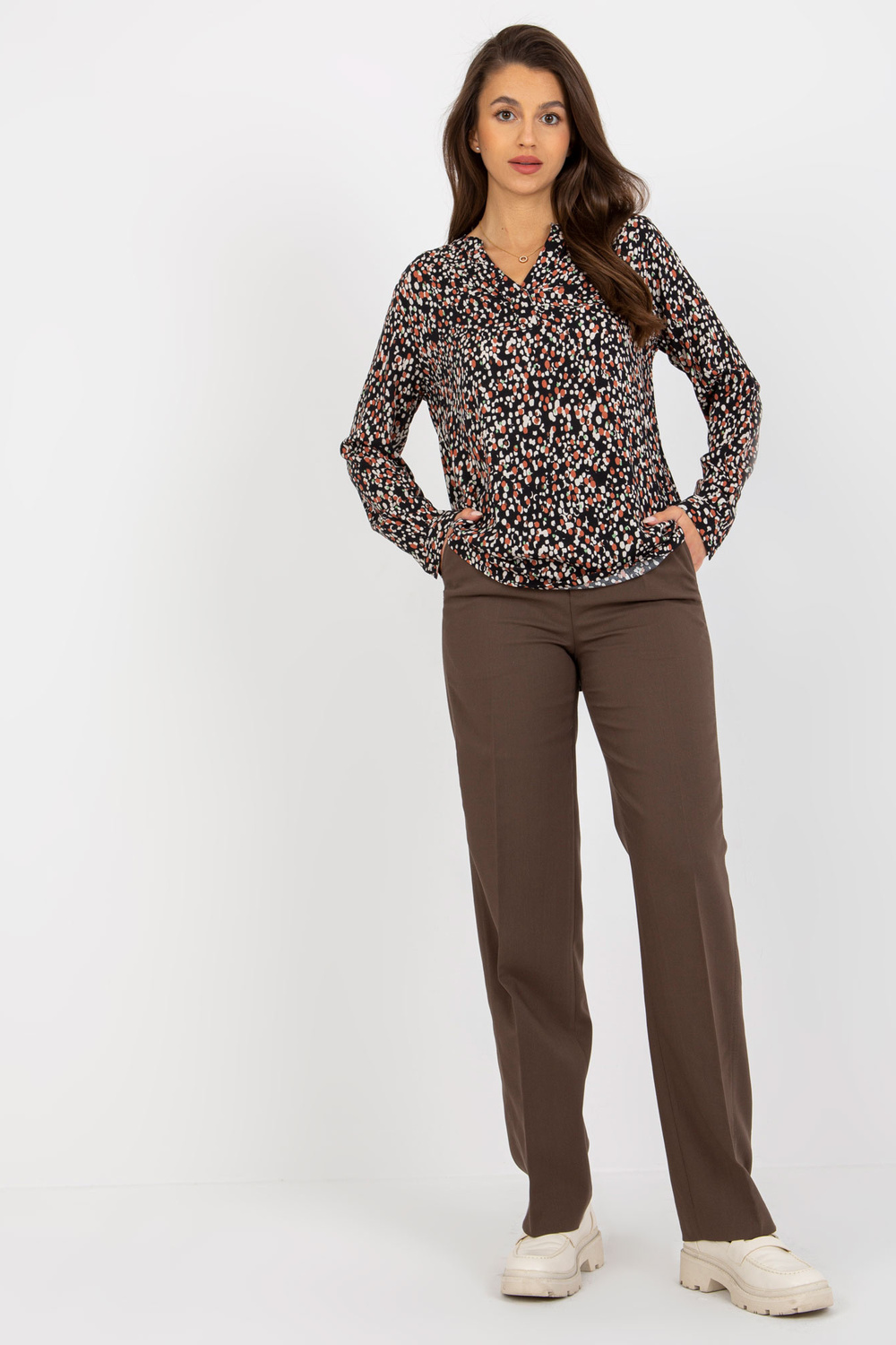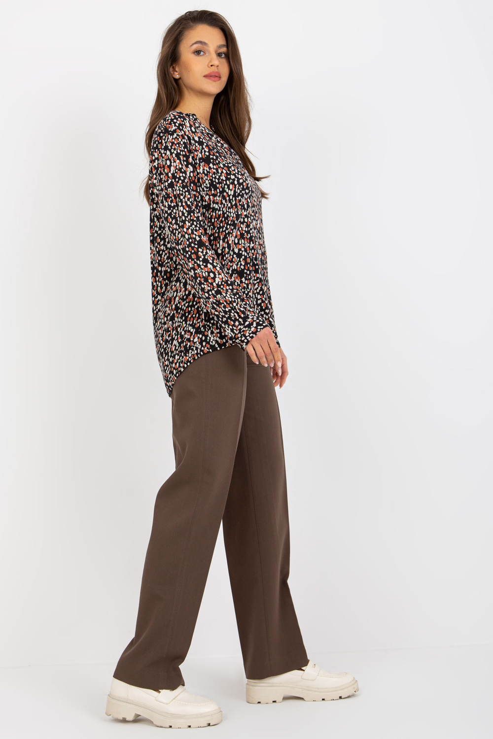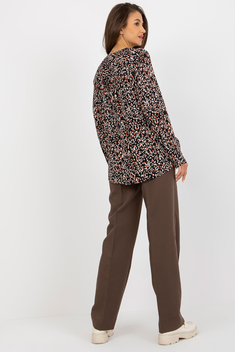 Izmēri blūze S izmēra, mērot plakana: paduses platums - 50 cm, piedurknes garums - 58 cm, kopējais garums (priekšpusē) - 63 cm, kopējais garums (aizmugurē) - 70 cm.