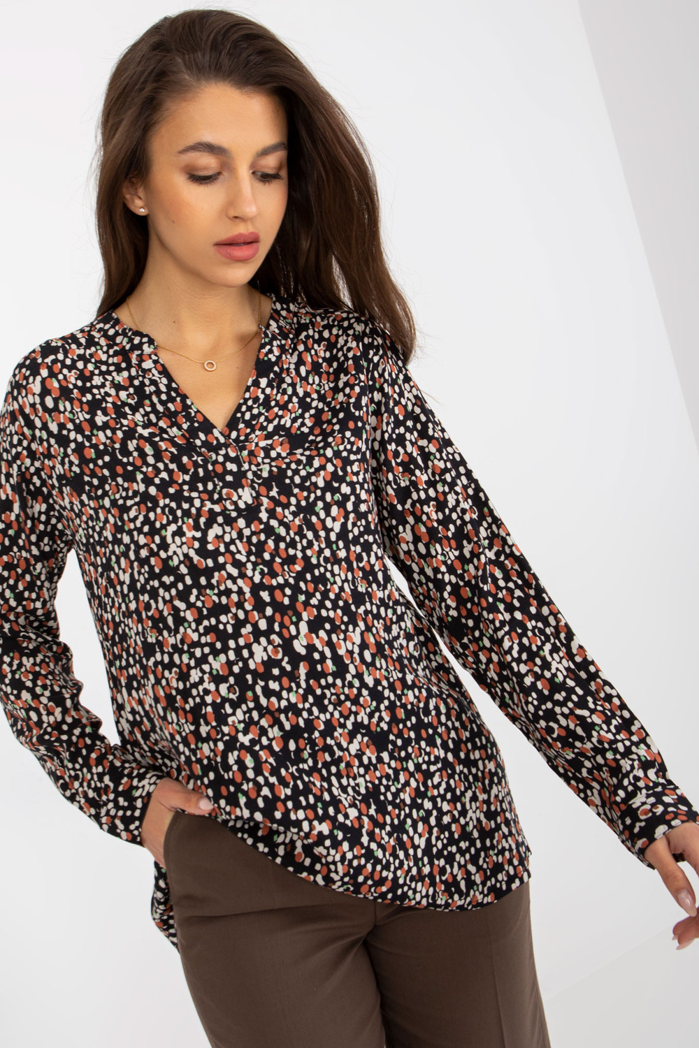 Melna blūze ar apdruku un V veida izgriezumu APAKŠLĪMENIS .