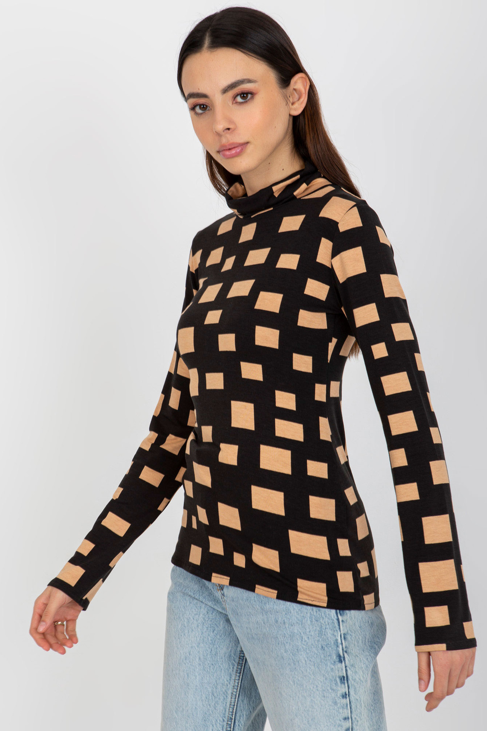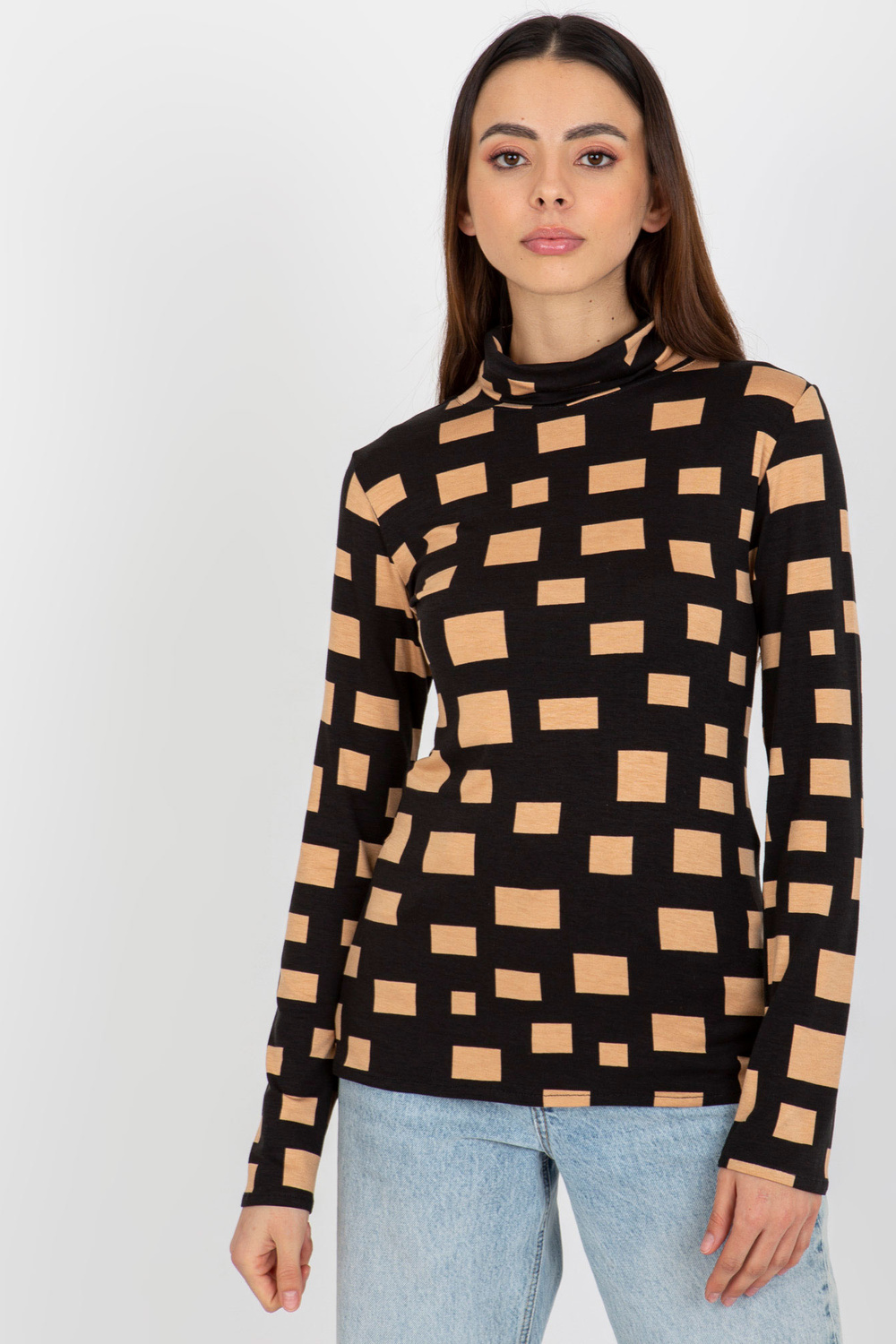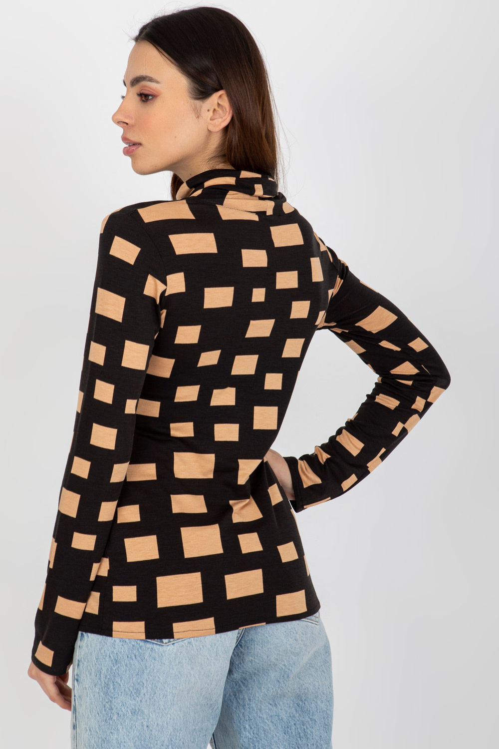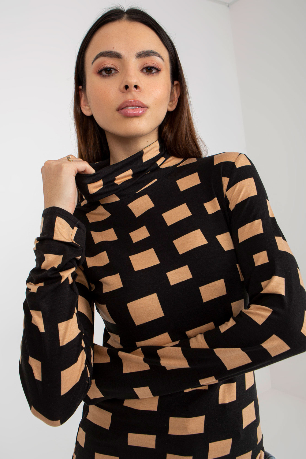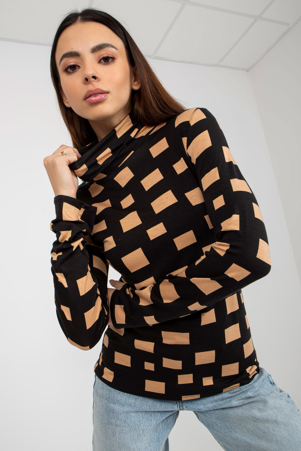 Melna un kamieļu blūze ar bruņurupuču apkakli ģeometriskā rakstā.