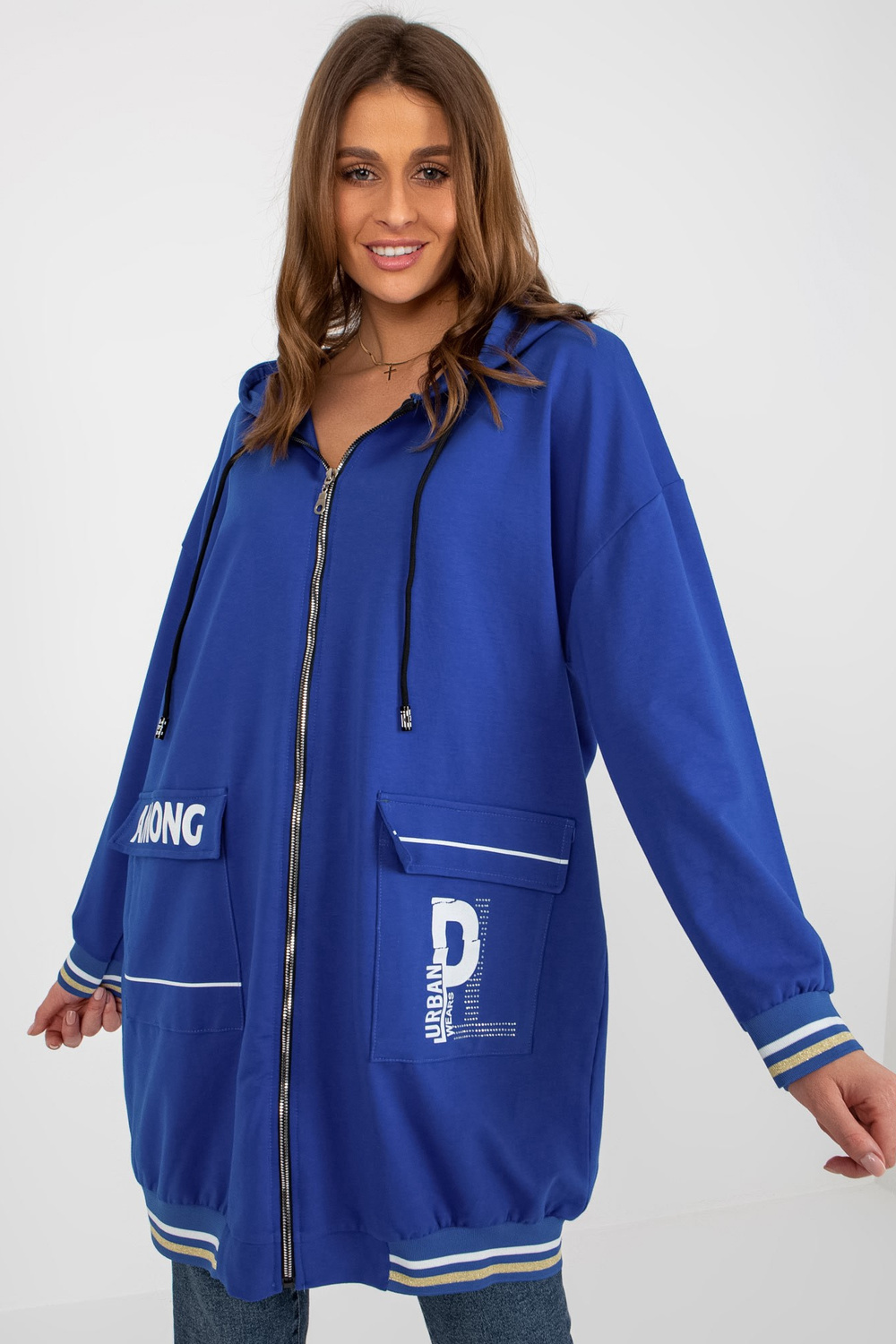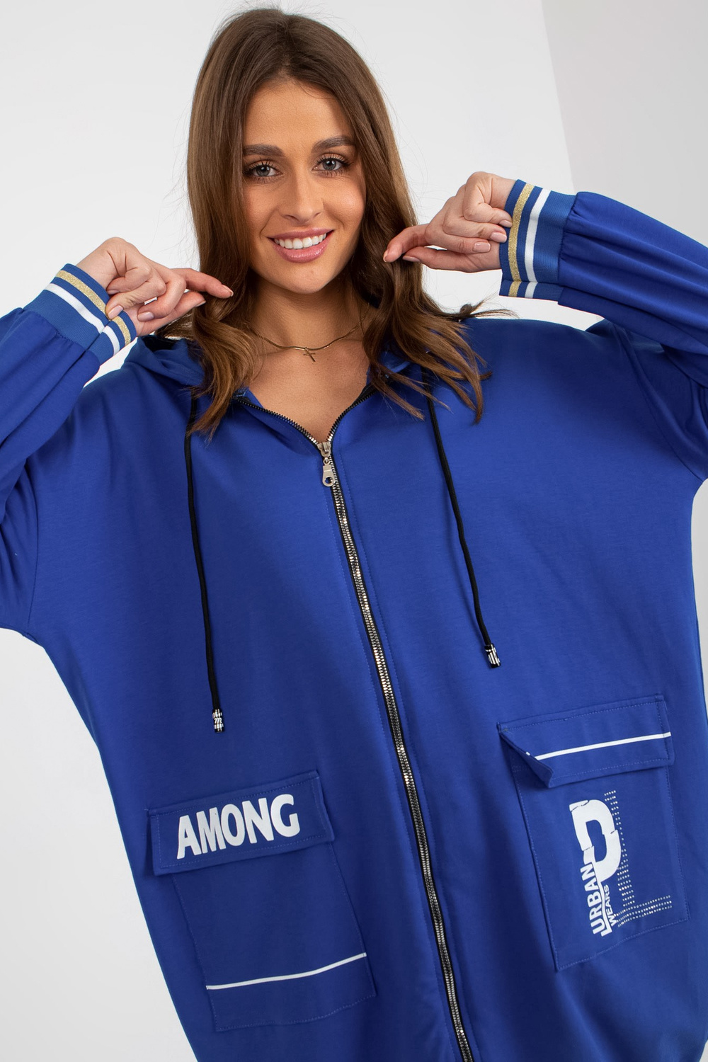 Tumši bēšs garš sporta krekls ar kapuci un uzrakstiem.