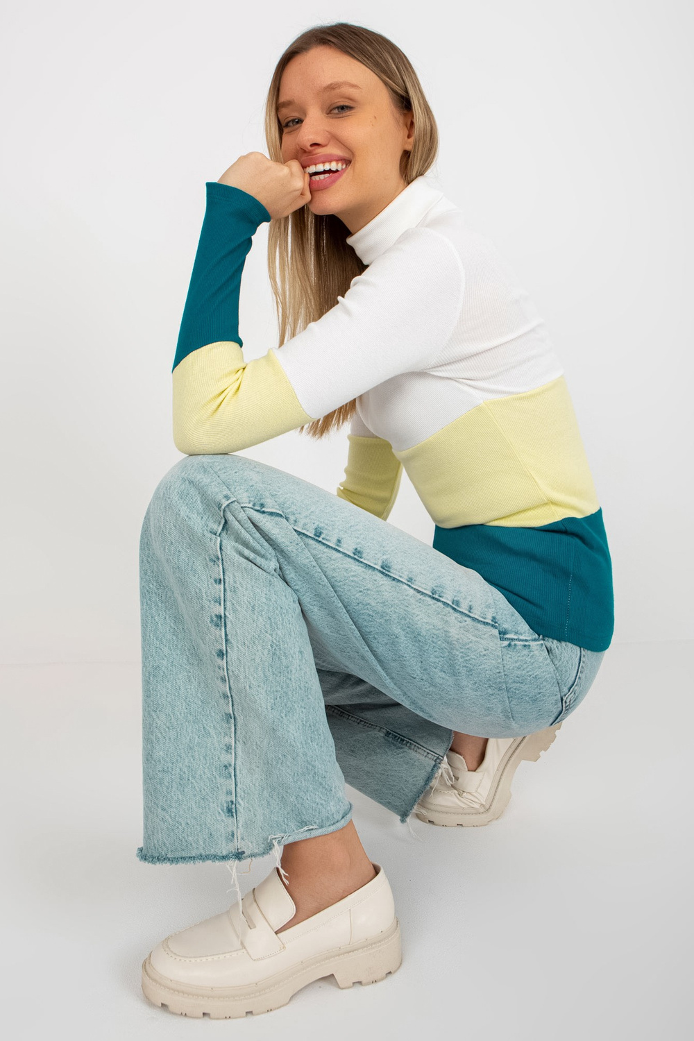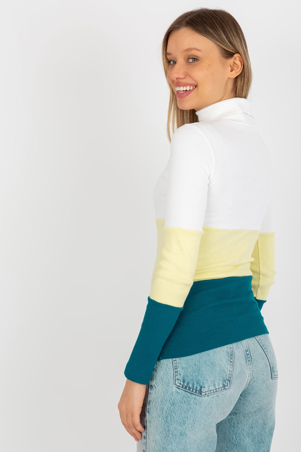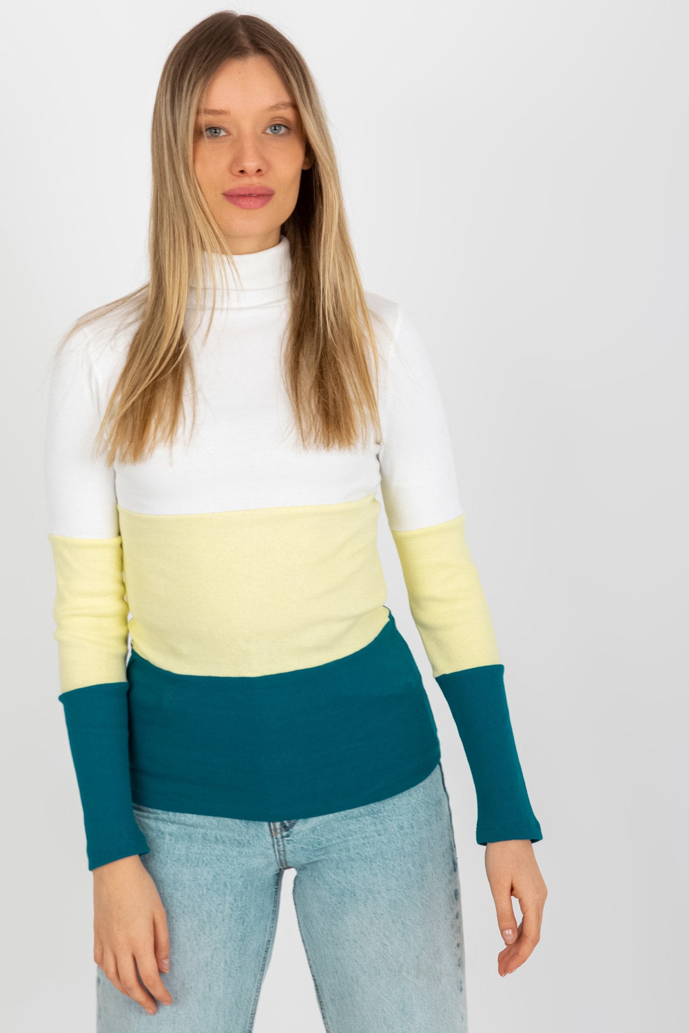 Ecru-jūras kokvilnas pamata blūze ar bruņurupuču apkakli svītrā.