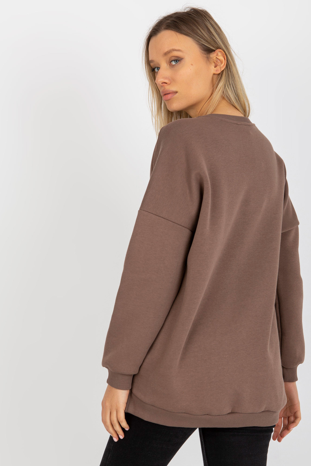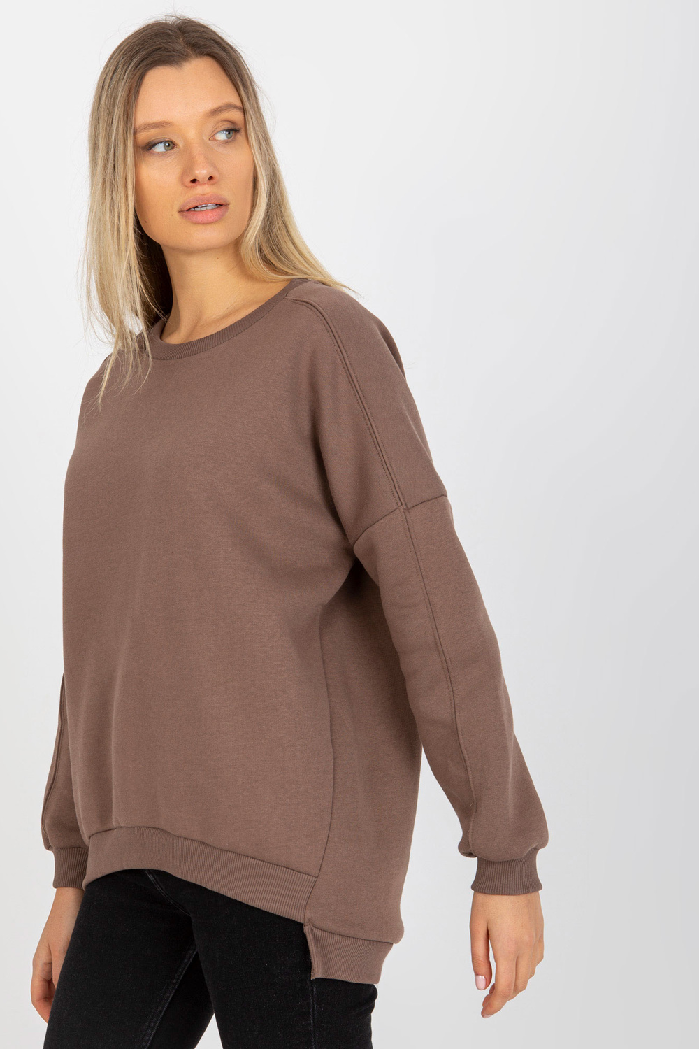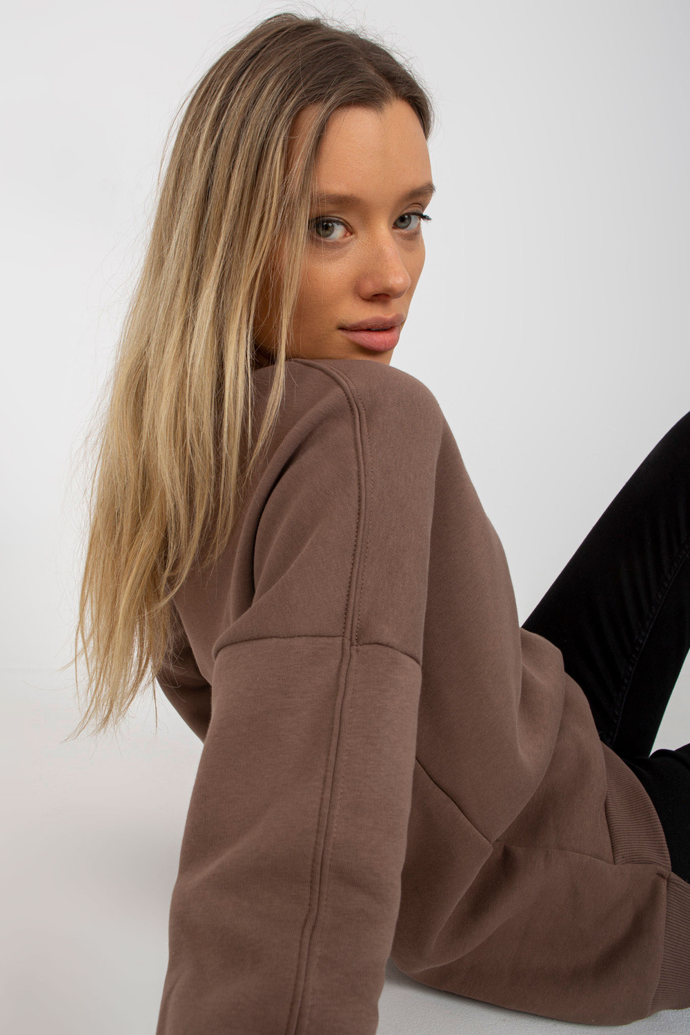 Brūnais sporta krekls ar apaļu kakla izgriezumu.