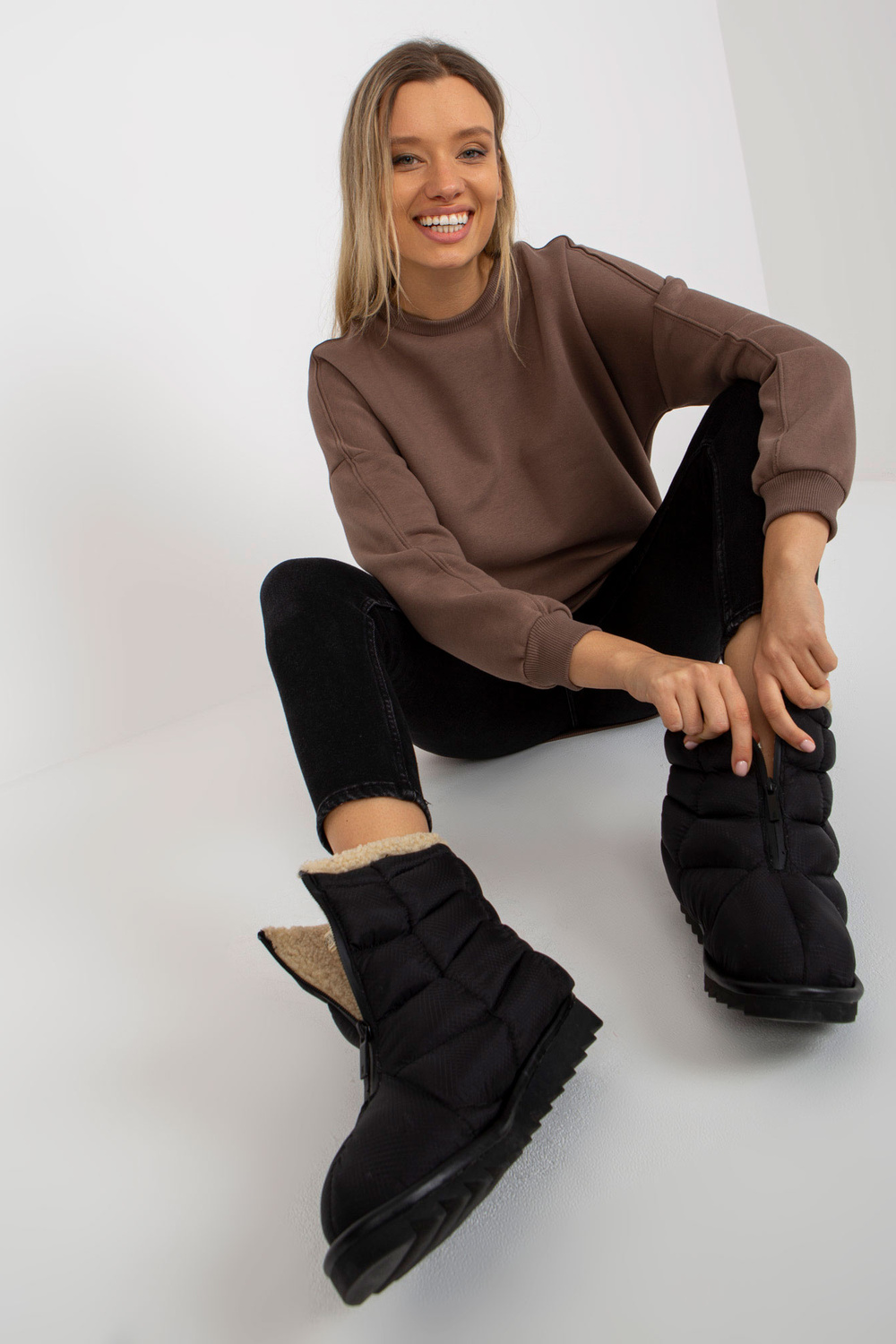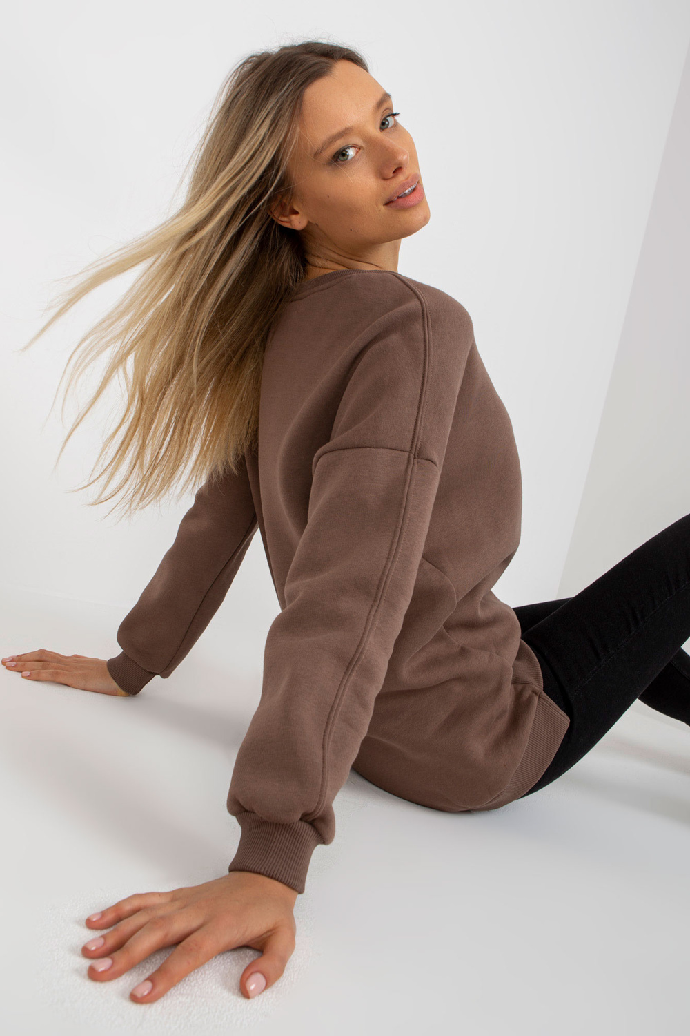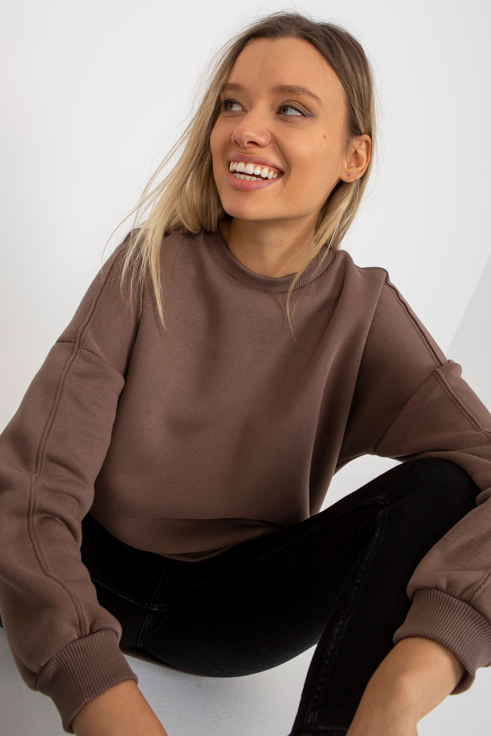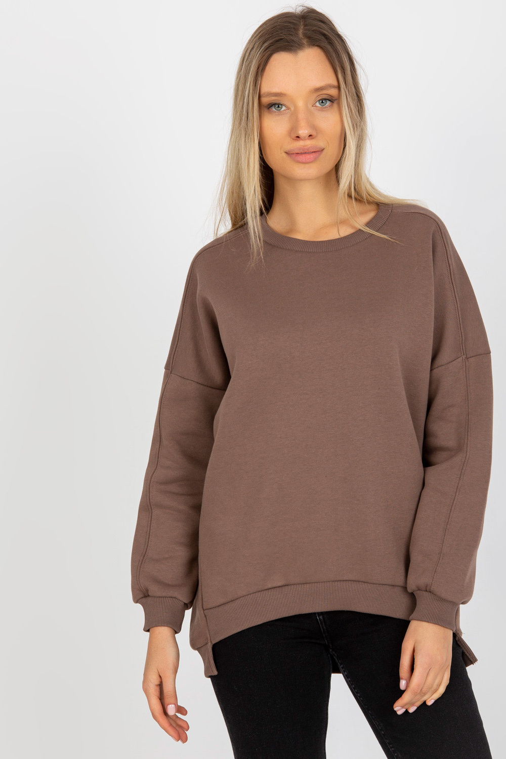 Brūnais sporta krekls ar apaļu kakla izgriezumu.