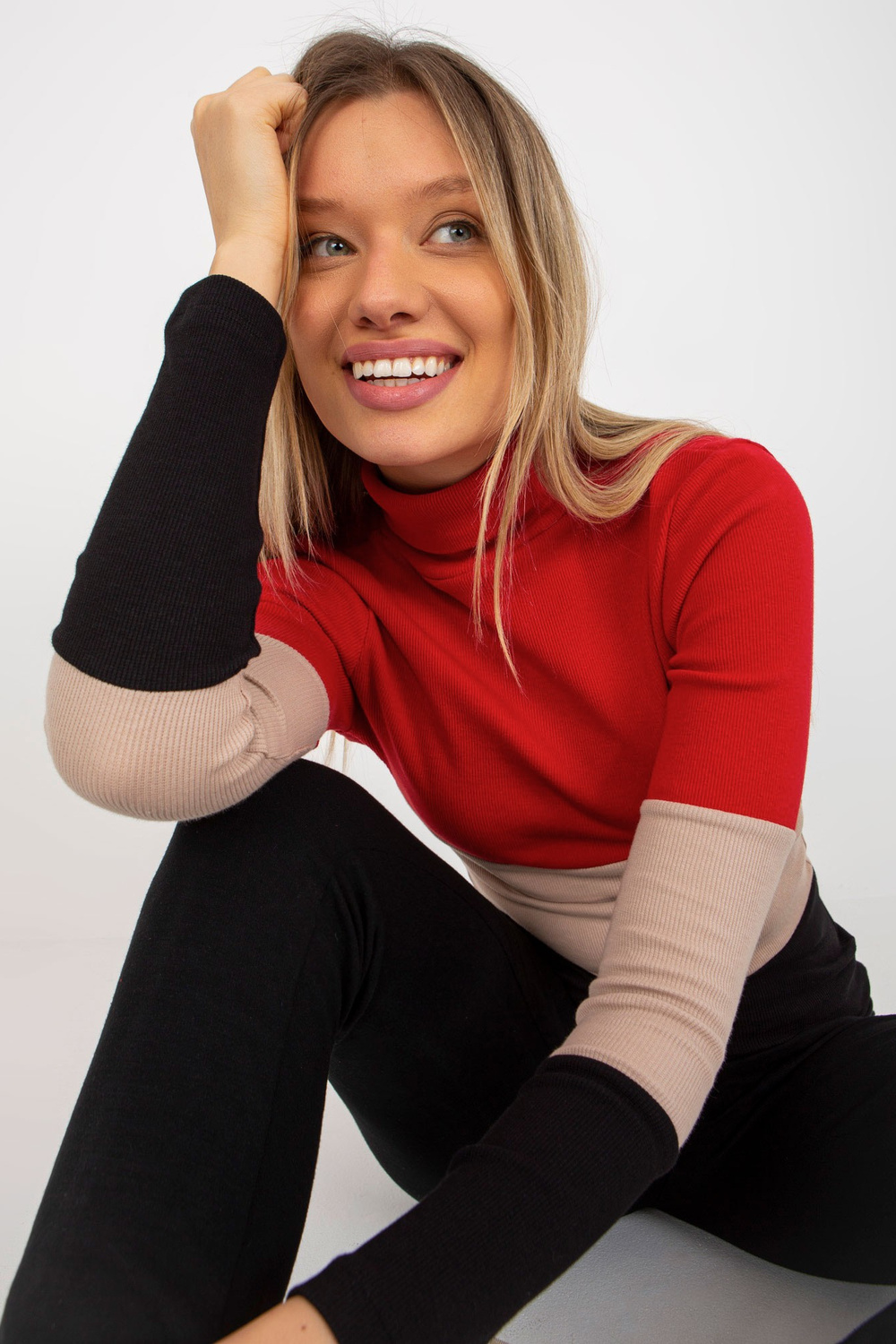 Sarkana un melna kokvilnas blūze ar bruņurupuču apkakli svītrā.