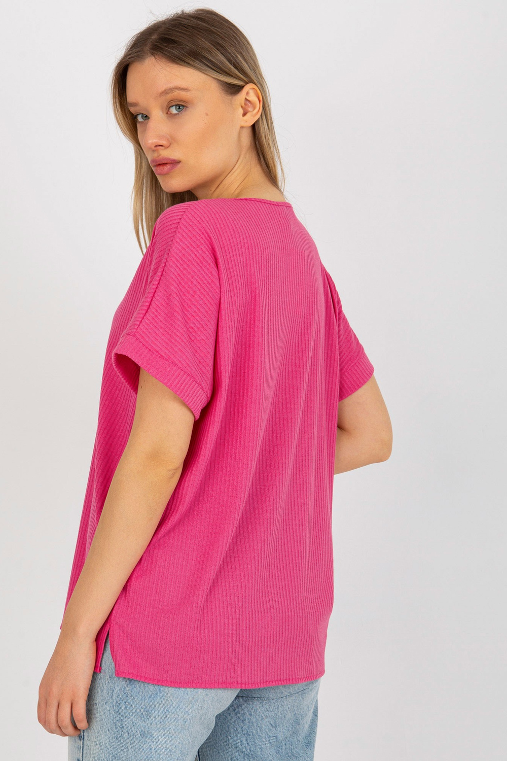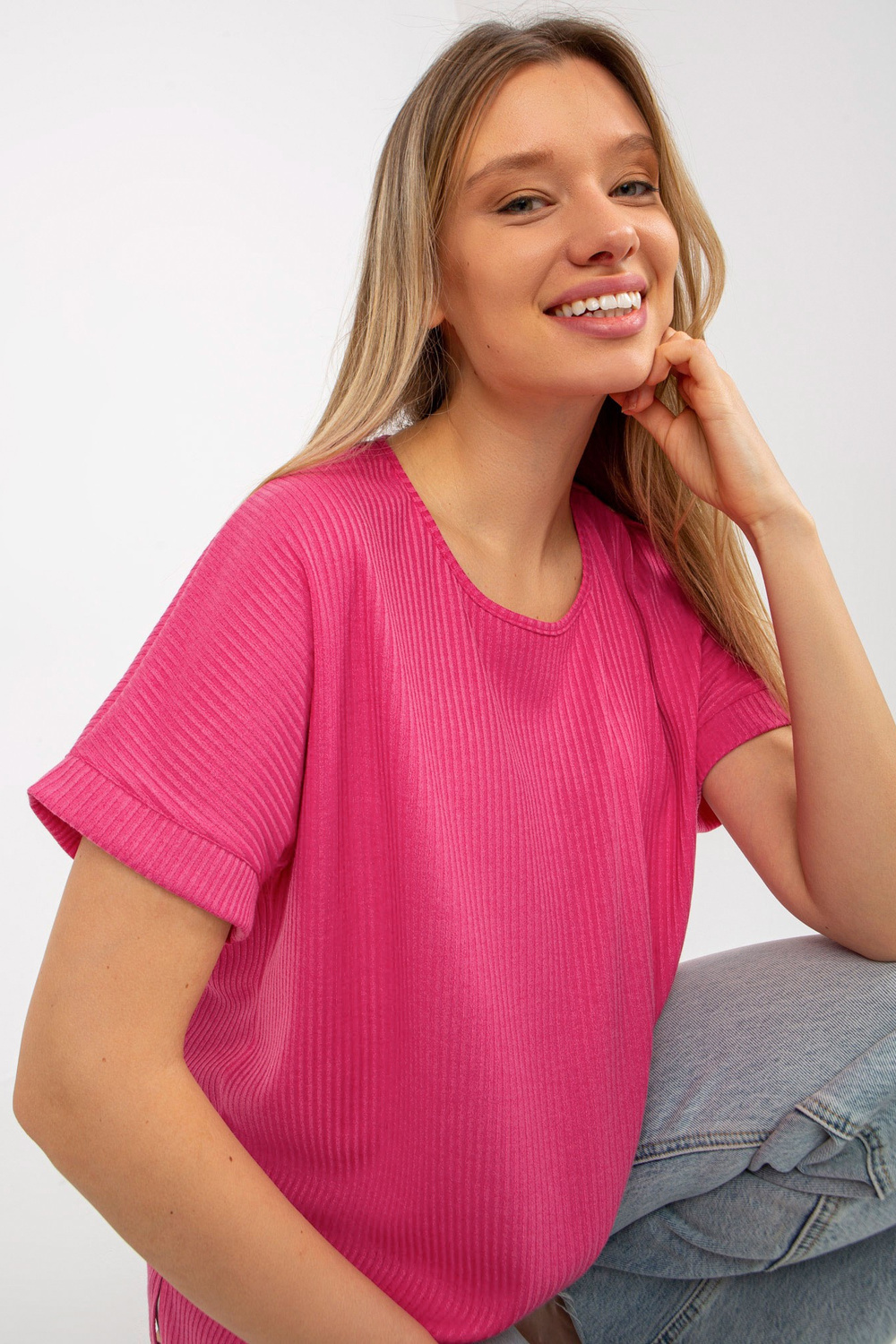 Tumši rozā liela izmēra blūze ar īsām piedurknēm svītrā.