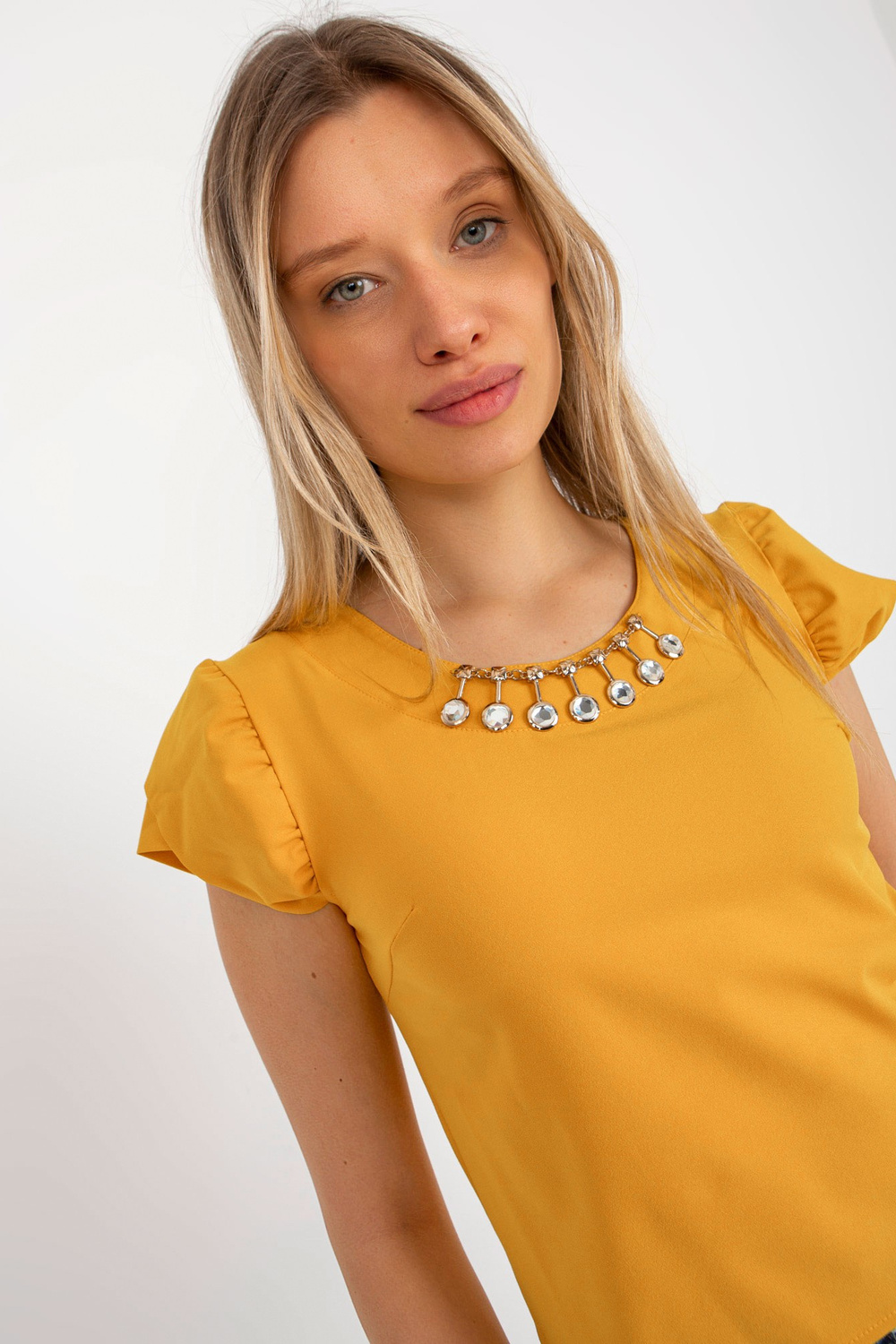 Tumši dzeltena īsa svinīga blūze ar kaklarotu.
