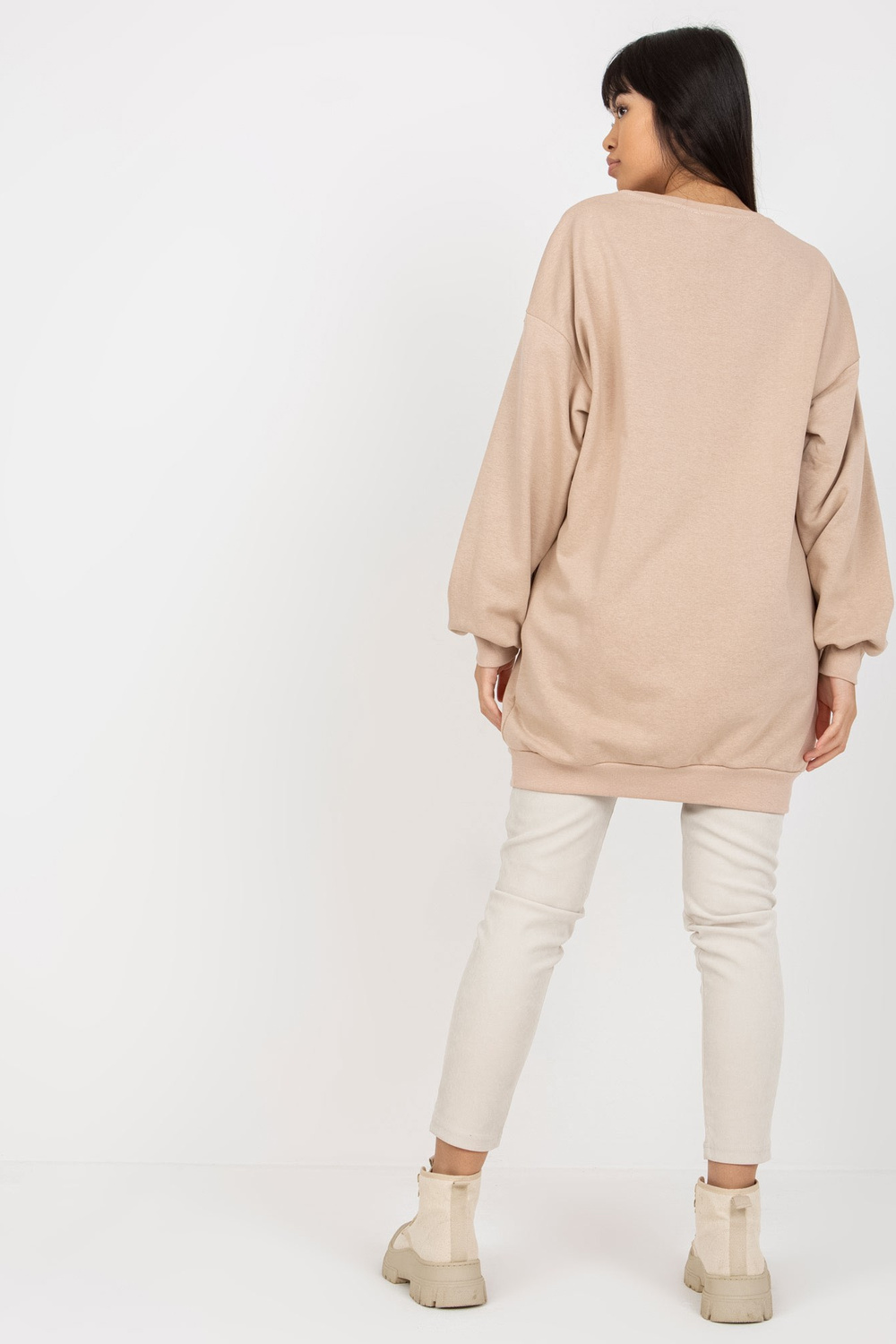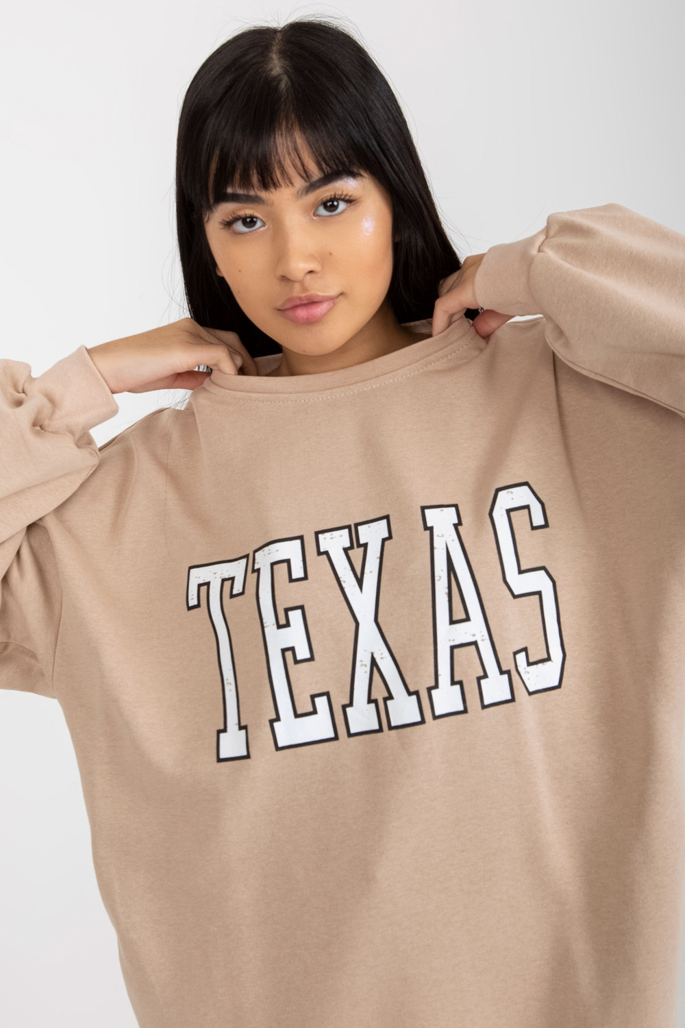 Bēšs sporta krekls ar apdruku un kabatām.