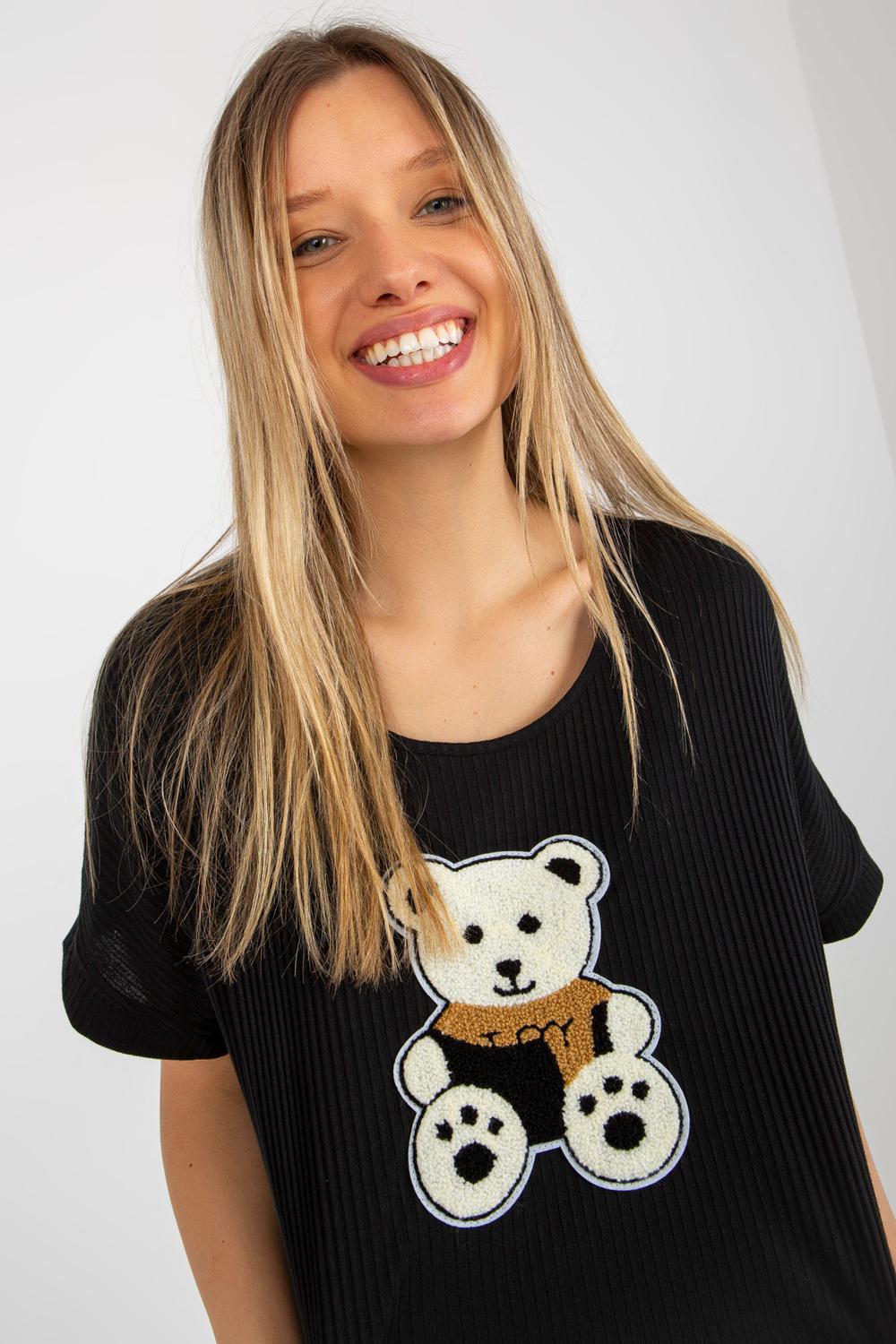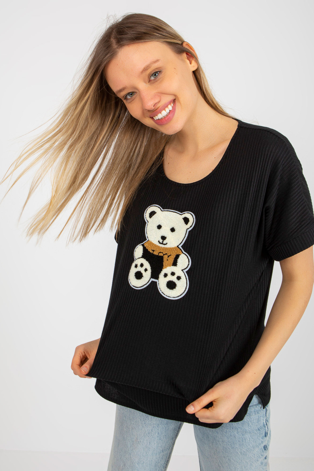 Melna sieviešu liela izmēra blūze ar svītrainu rotaļu lācīti.