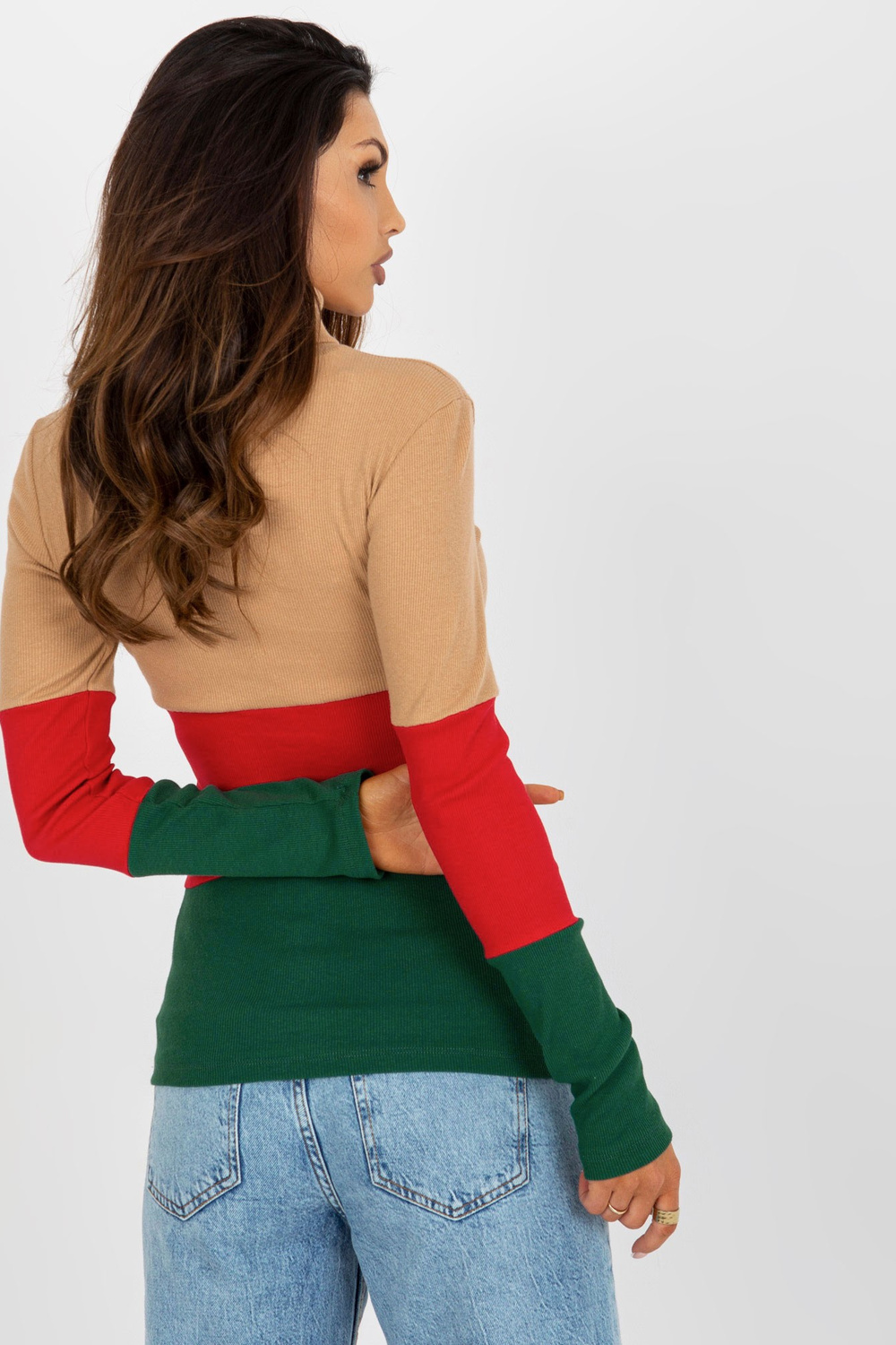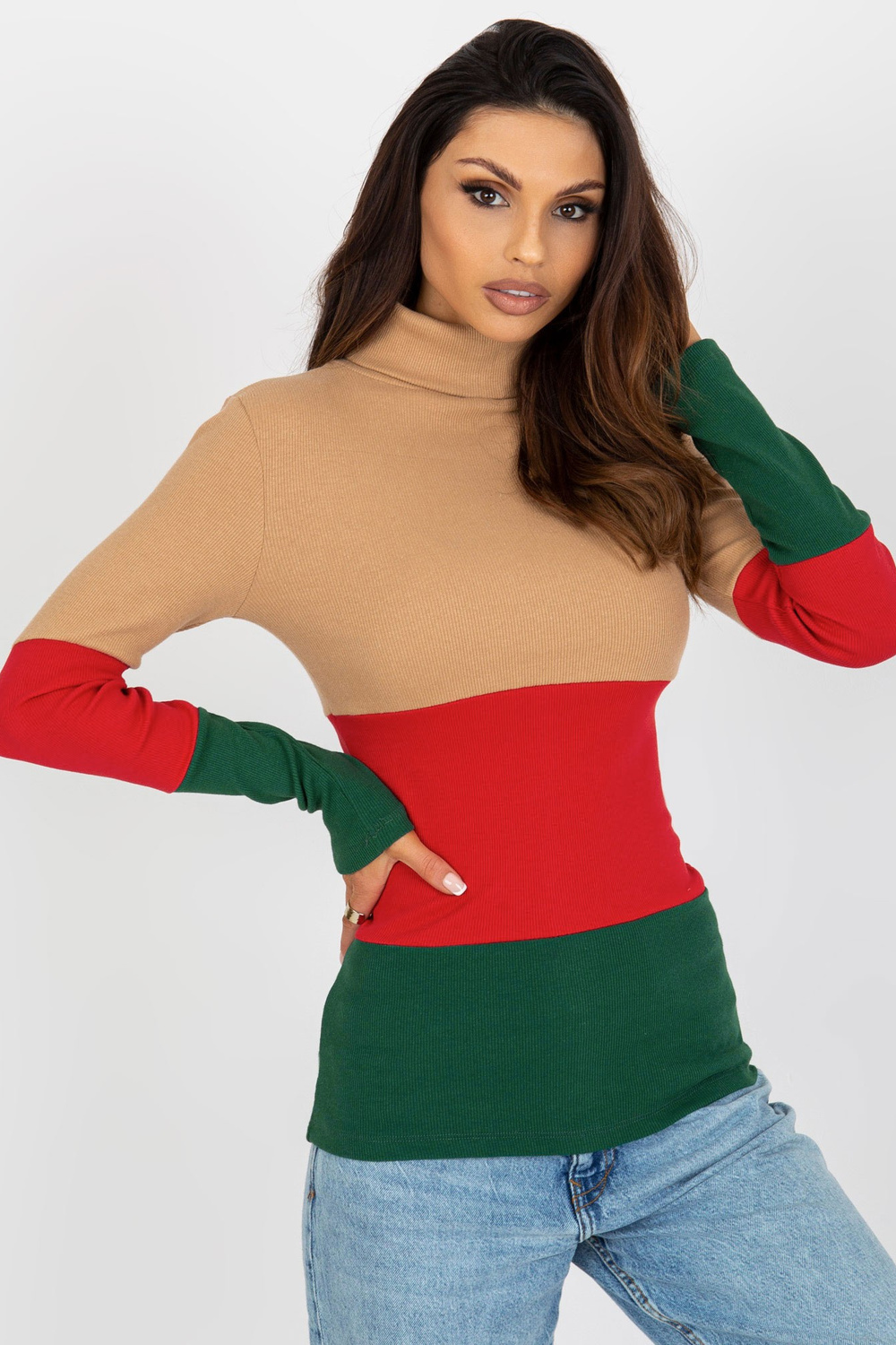 Gaiša kamieļa un tumši zaļa rievota pamata blūze ar bruņurupuču apkakli.