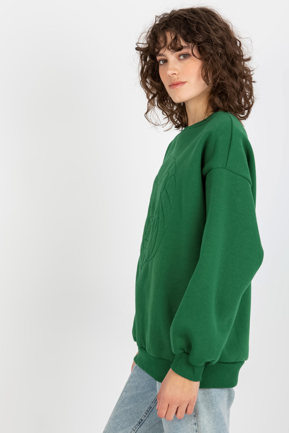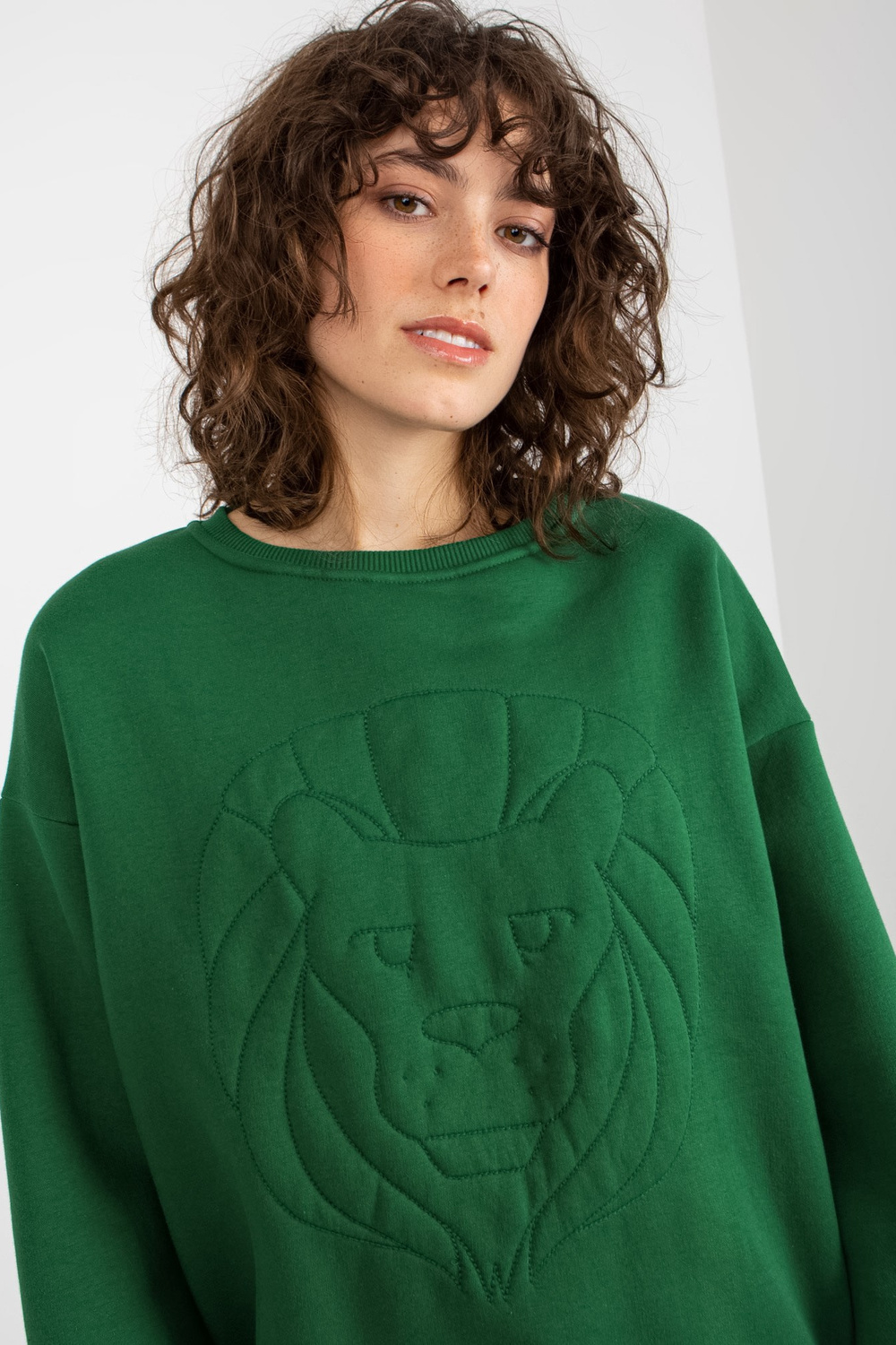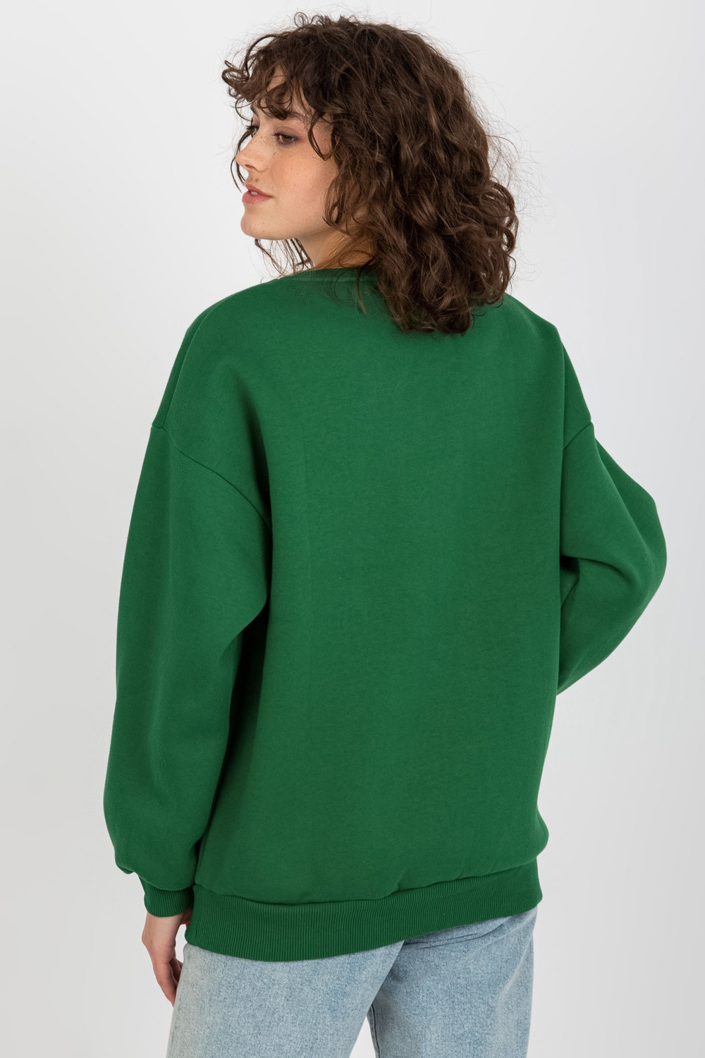 Tumši zaļš sporta krekls bez kapuces ar izšuvumu. Preces kods: EM-BL-617-4.41P Dominējošais raksts: gluds Stils: ikdienišķs Notikums: ikdienišķs, darbam, pilsētai Modele valkā viena izmēra izmēru. Modeļa izmēri: augums 177 cm, krūtis 84 cm, viduklis 62