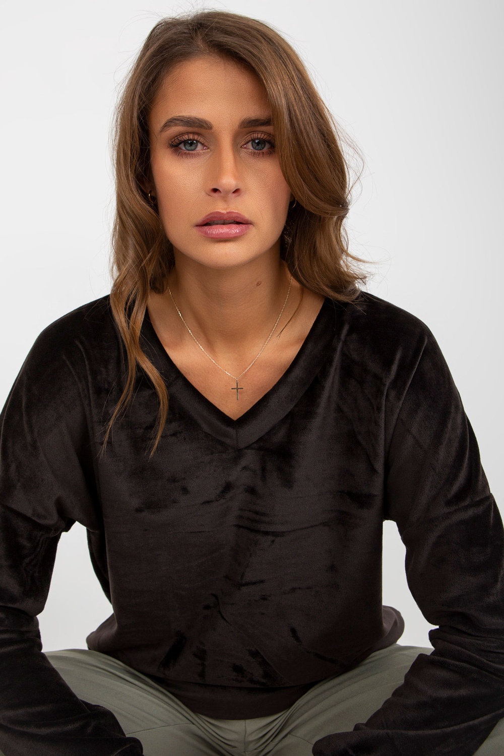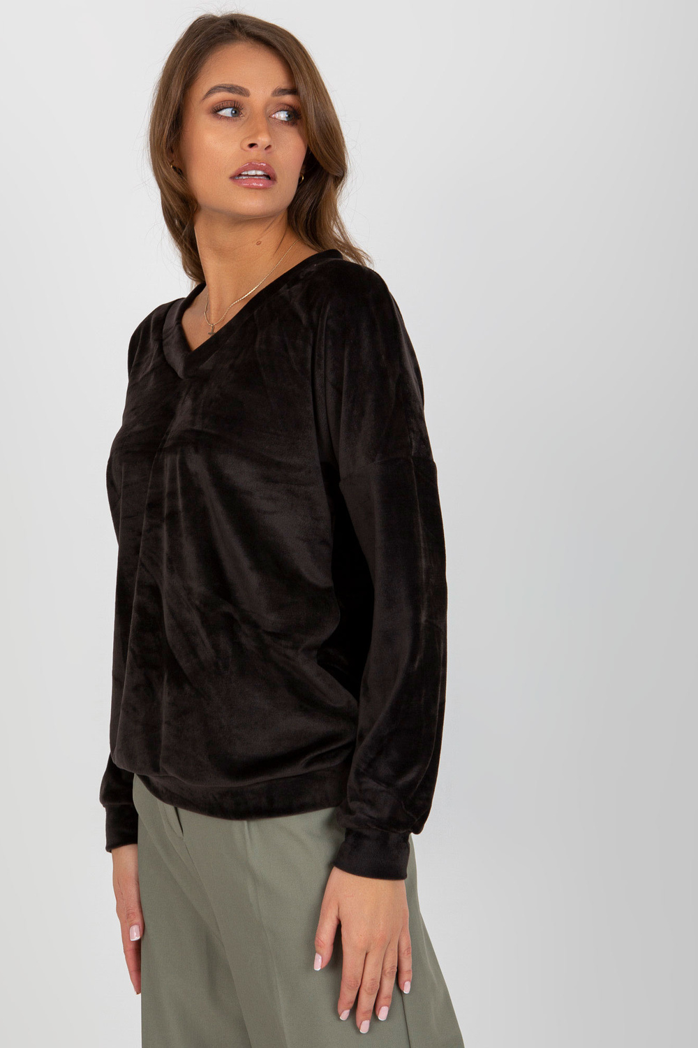 Melna velūra sporta krekls bez kapuces V veida kakla izgriezumā.