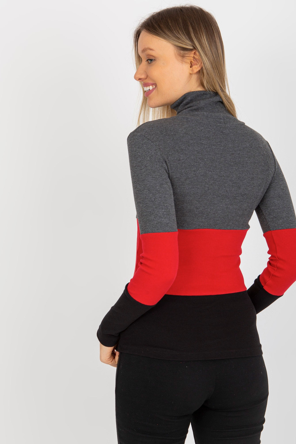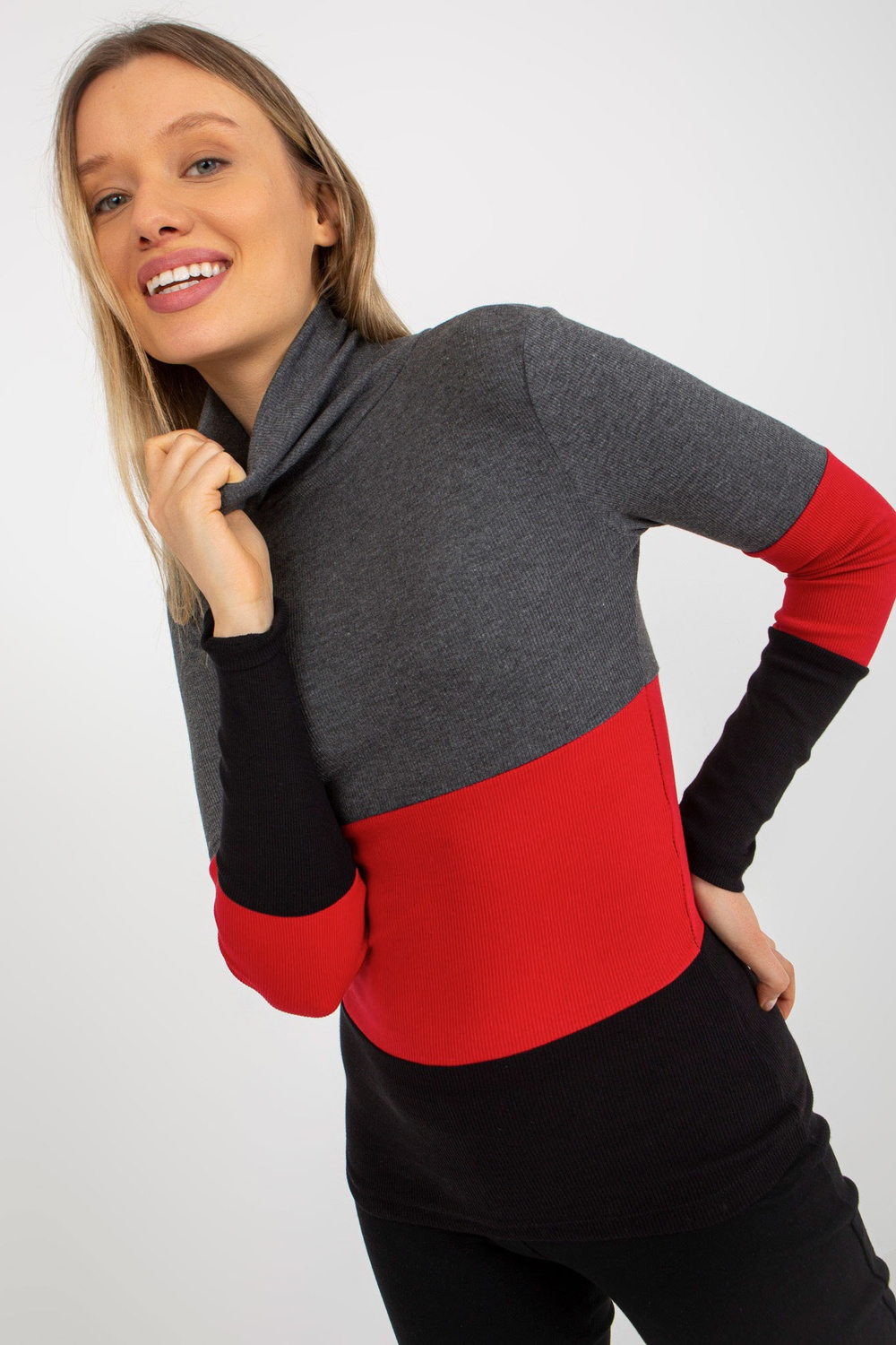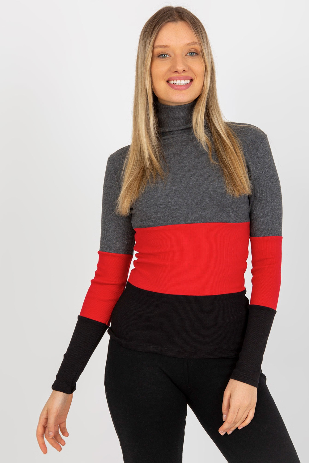 Tumši pelēki melna sieviešu rievota blūze ar bruņurupuču apkakli.