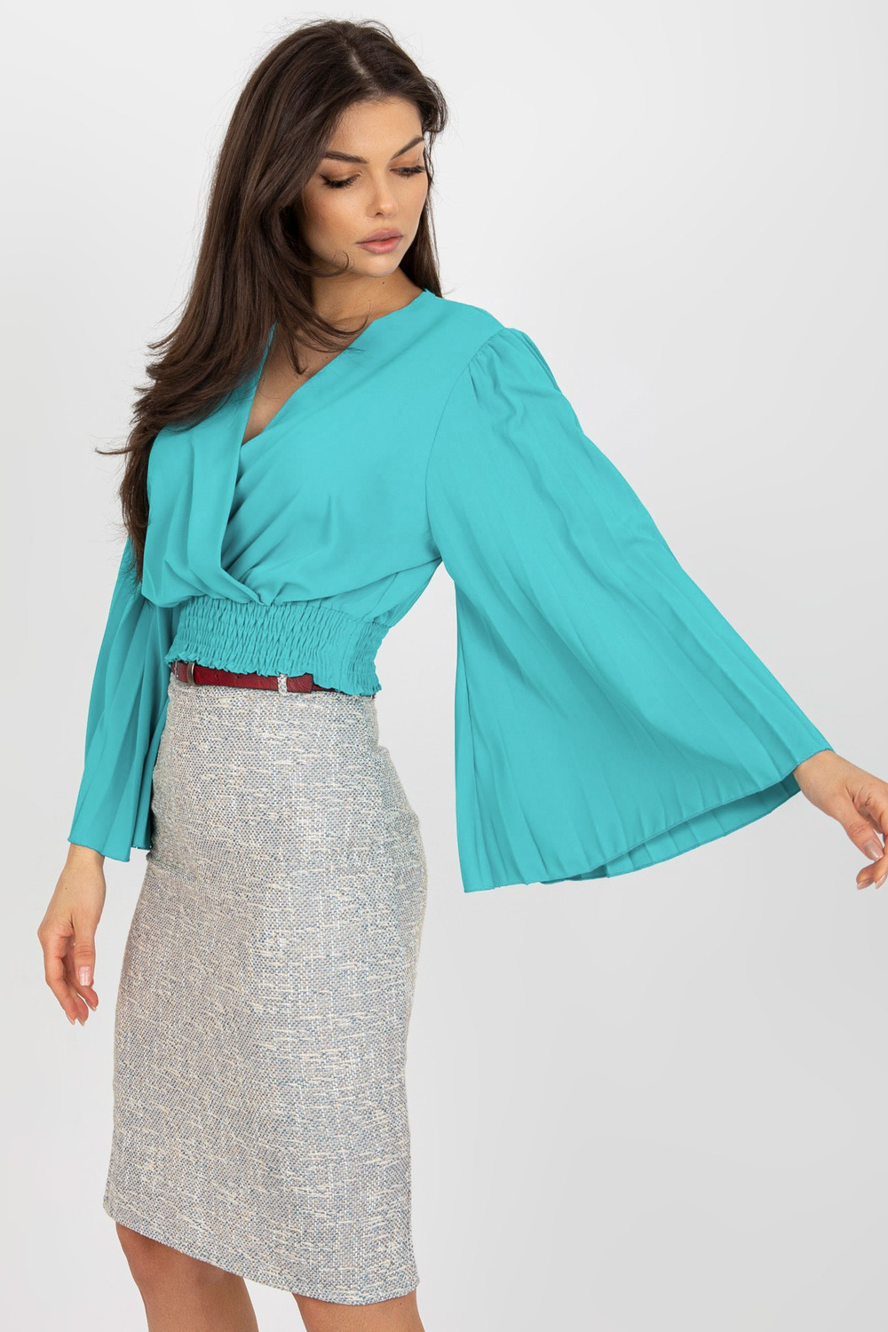 Zila, īsa svinīga blūze ar kroku piedurknēm.