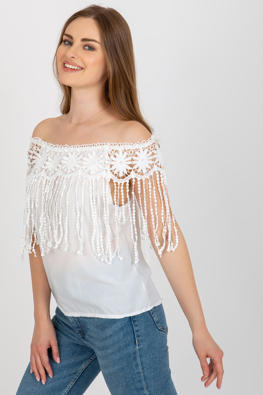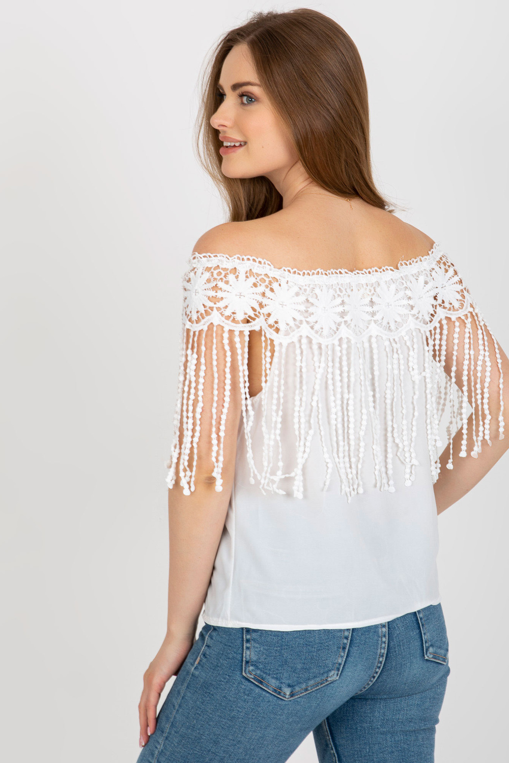 Balta sieviešu spāņu blūze ar bārkstīm.