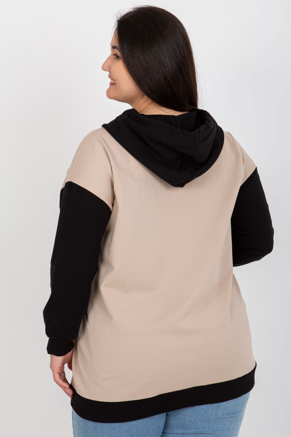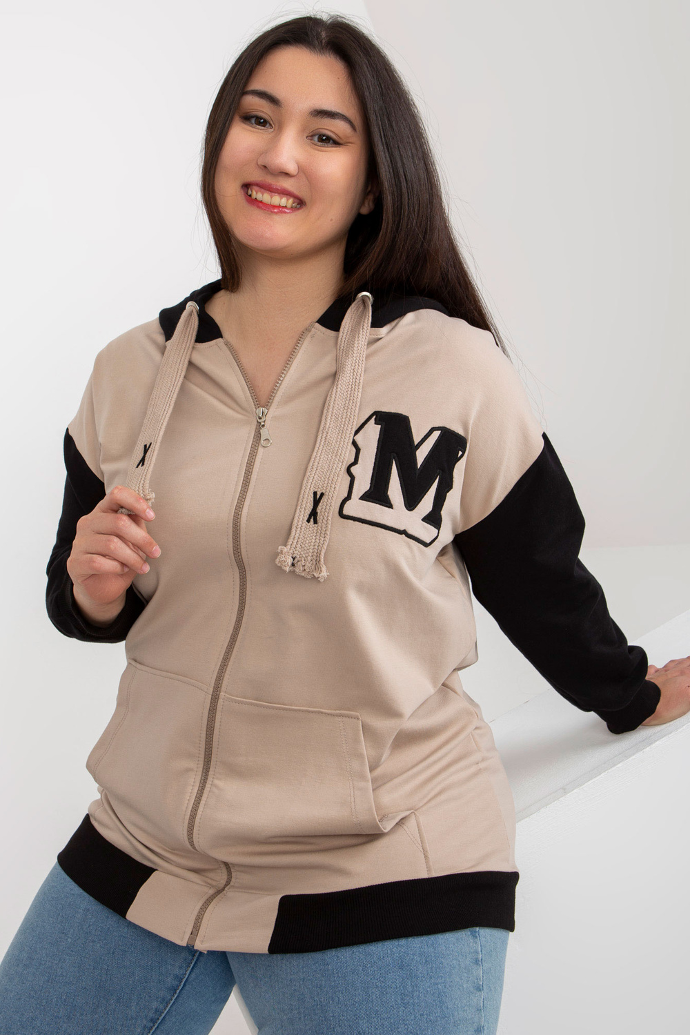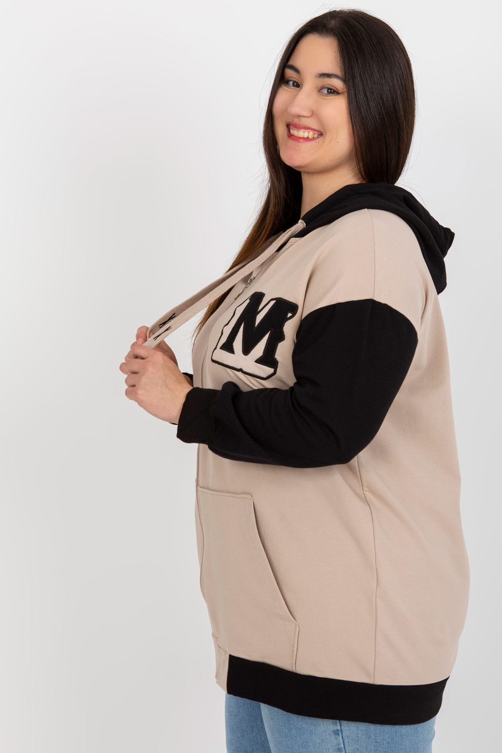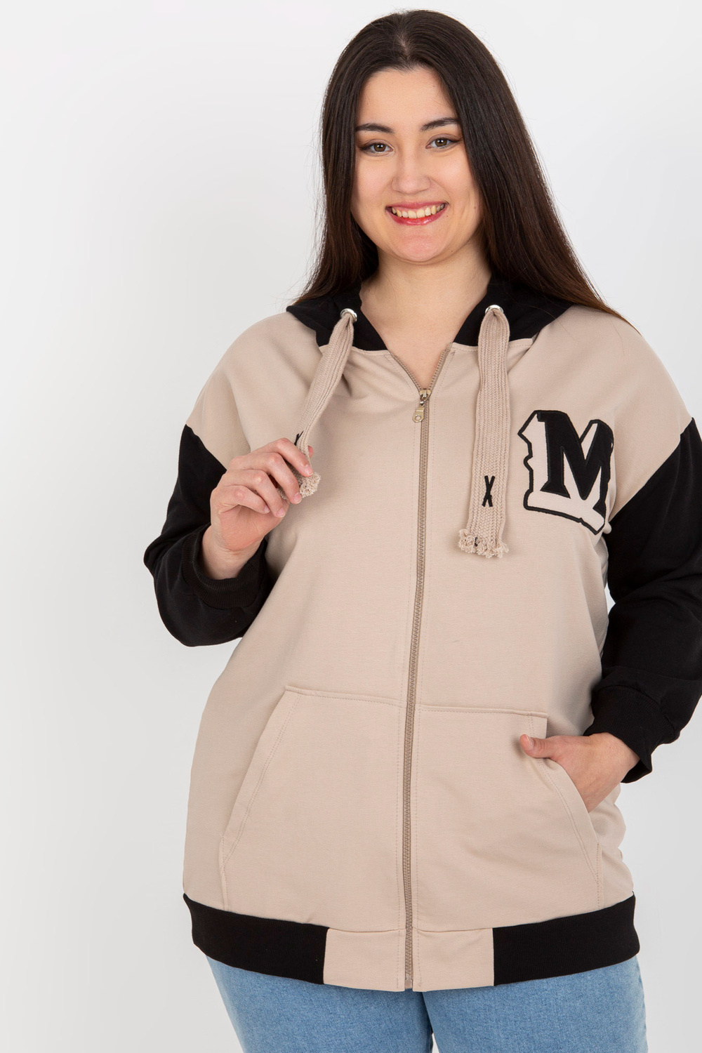 Bēša un melna lielizmēra jakas ar kapuci.