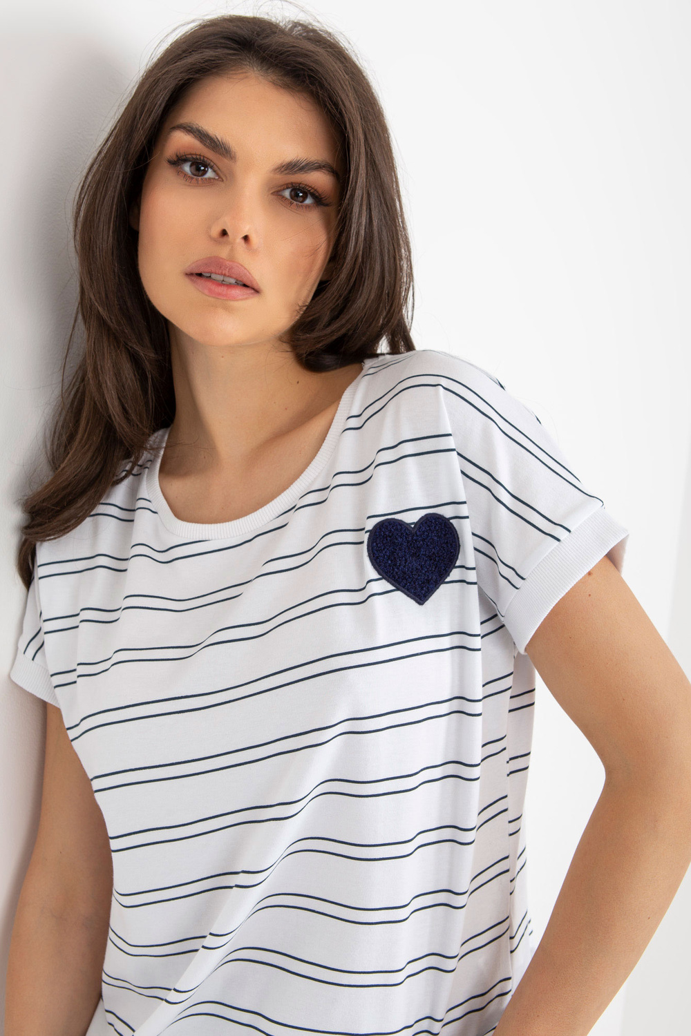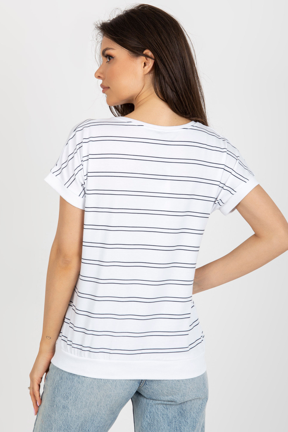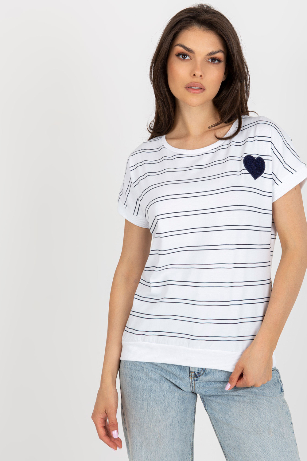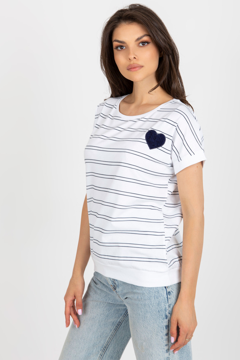 Balta un tumši zila sieviešu svītraina blūze ar ielāpu.