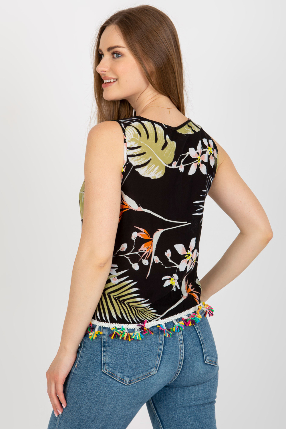Melna vasaras blūze ar apdruku un bārkstīm.