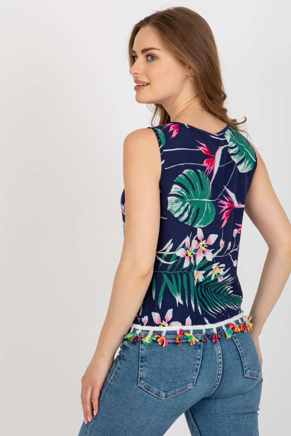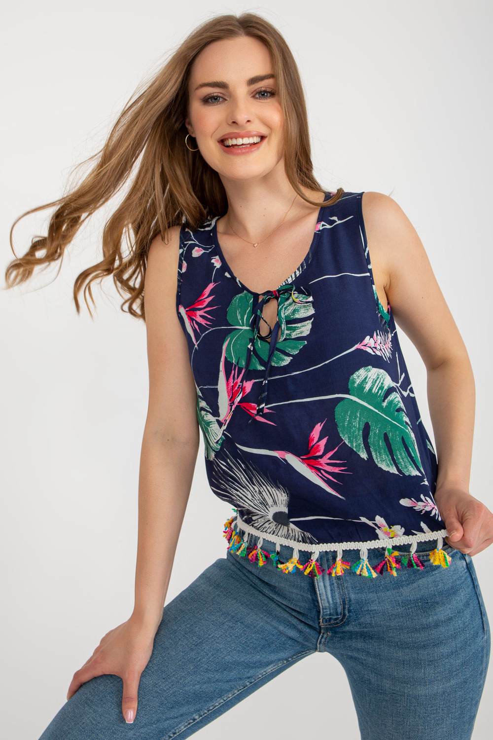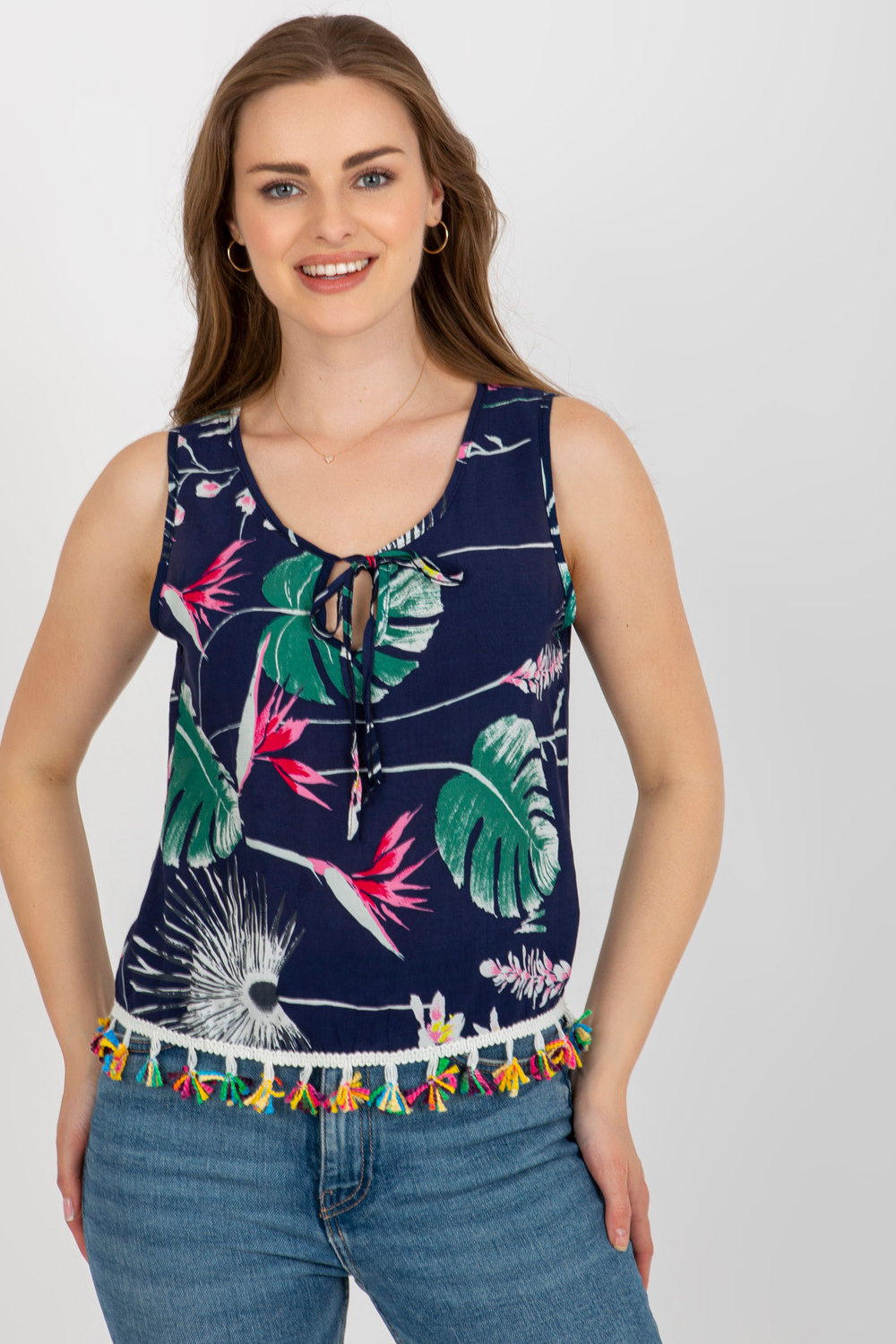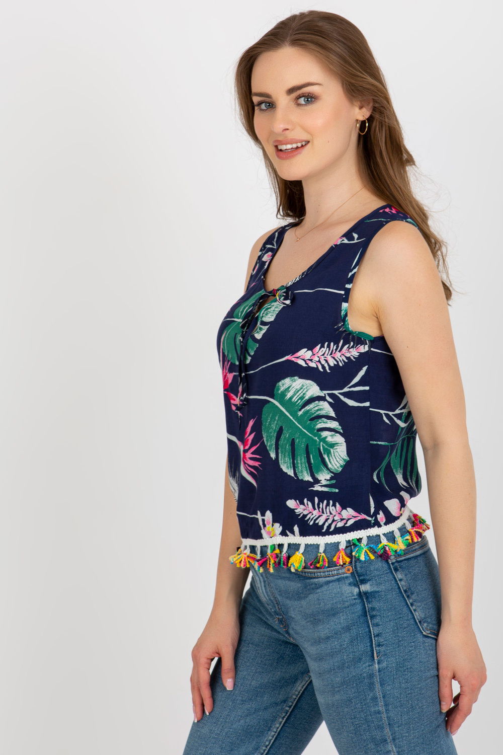 Trūši zila īsa blūze ar apdruku bez piedurknēm.