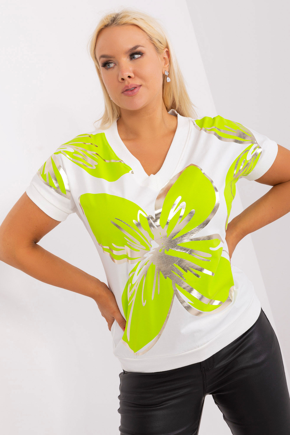 Modele valkā viena izmēra izmēru. Modeļa izmēri ir: augums 172 cm, krūtis 103 cm, viduklis 73 cm, gurni 103 cm.
