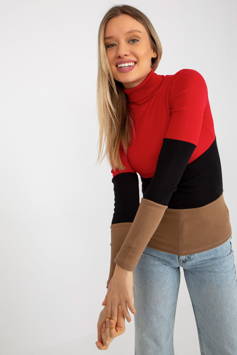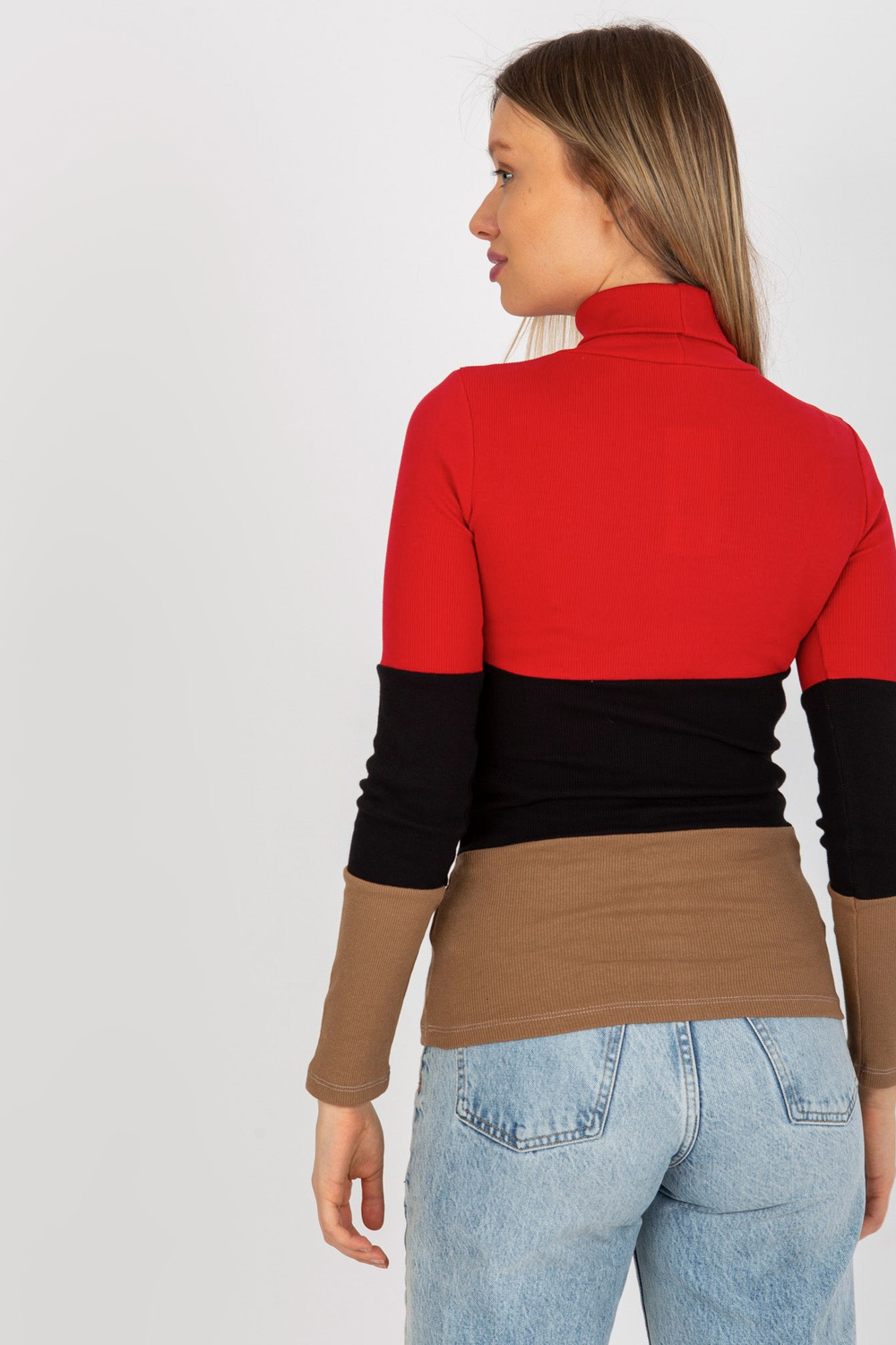 Sarkana un tumša kamieļu rievota blūze ar bruņurupuču apkakli.