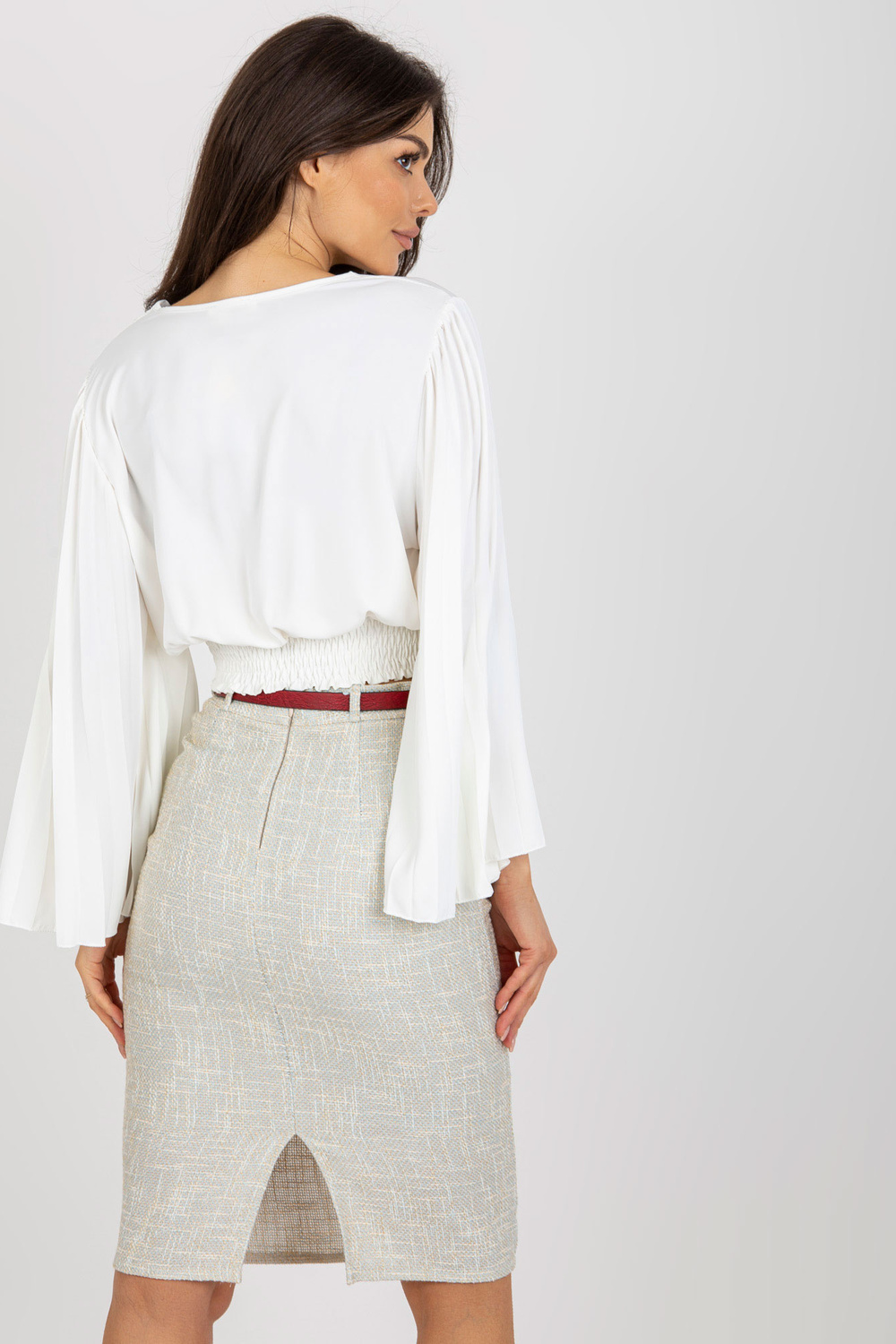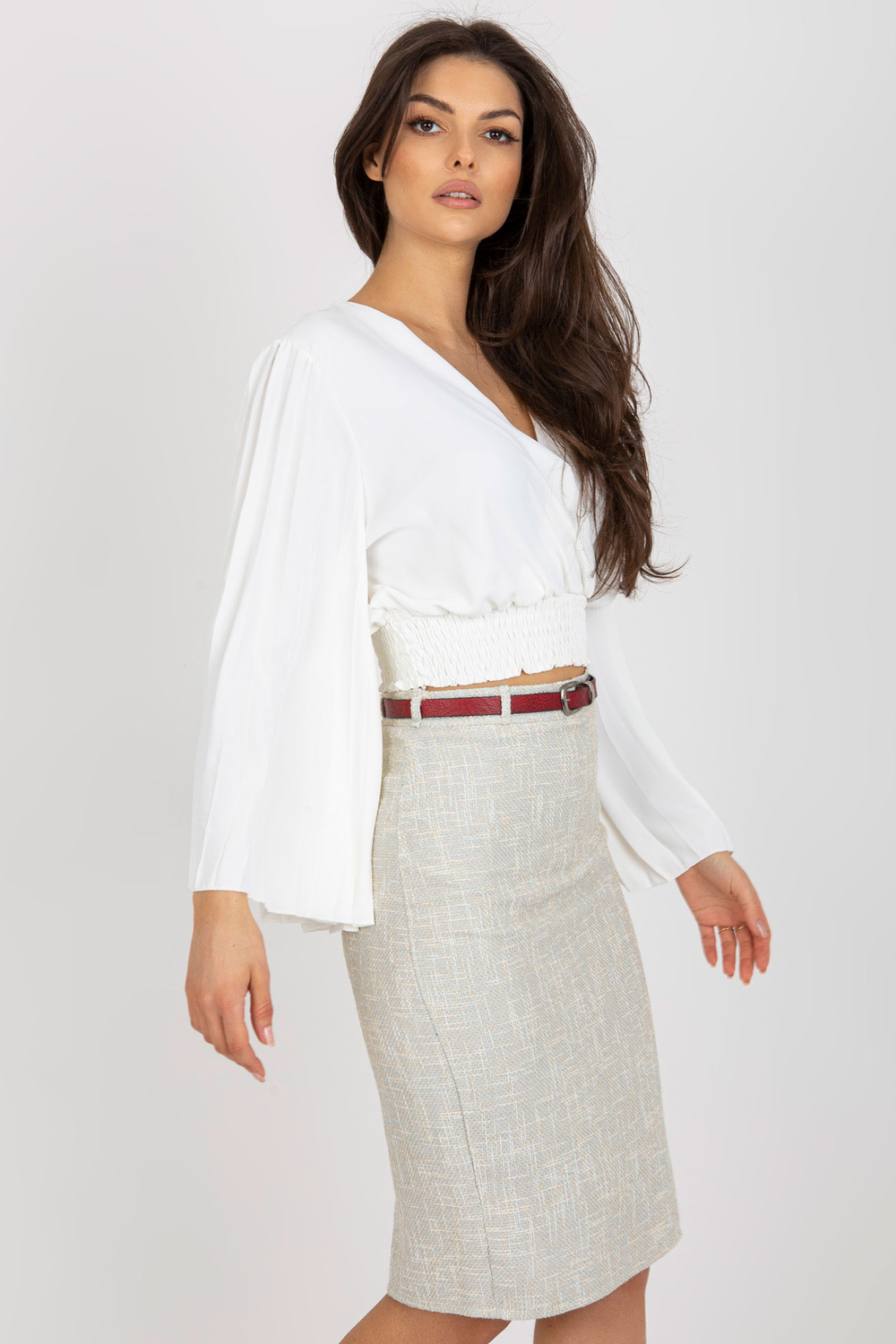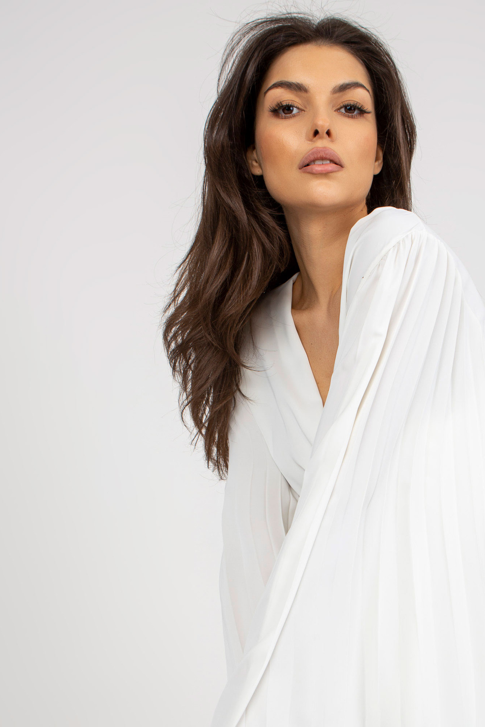Ecru wrap svinīga blūze ar volāniem. Produkta kods: DHJ-BZ-16503.30X Dominējošais raksts: gluds Stils: Elegants gadījums: ikdienišķs, darbam, randiņam, ballītei Modele valkā viena izmēra izmēru. Modeļa izmēri: augstums 173 cm, krūtis 85 cm, viduklis 62 cm,