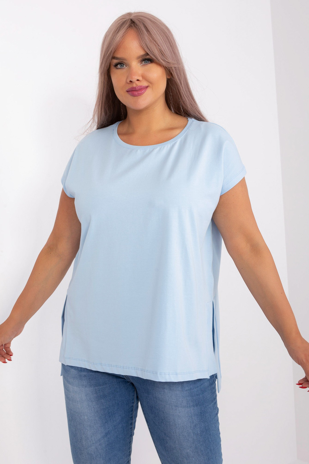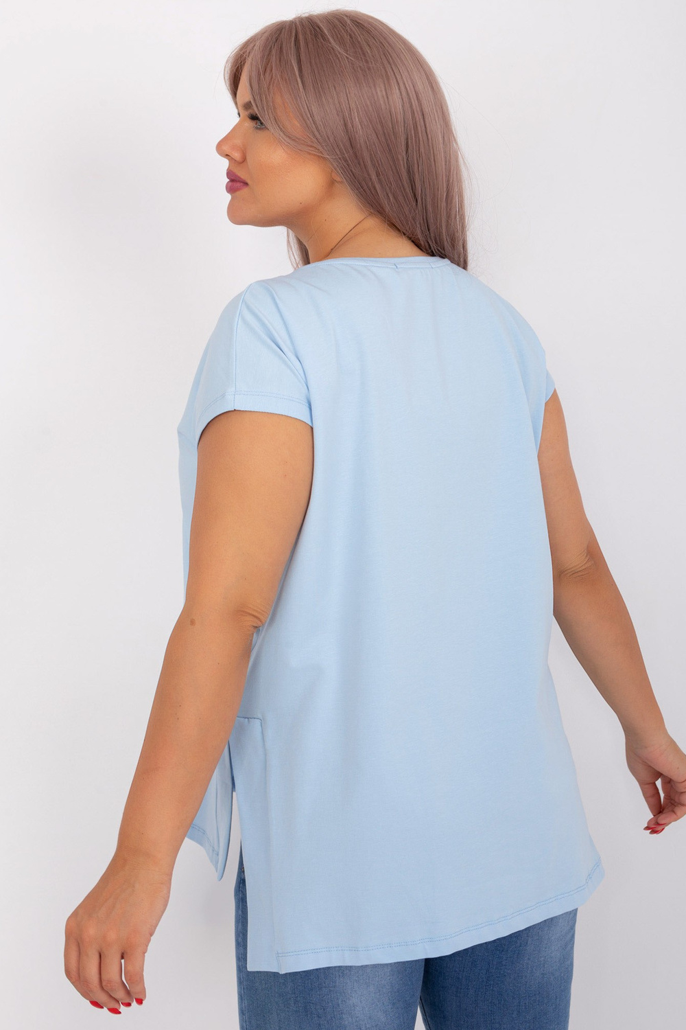 Modeles izmēri viena izmēra blūze, mērot plakana: platums zem rokām - 60 cm, kopējais garums: priekšā - 68 cm, aizmugurē - 77 cm.