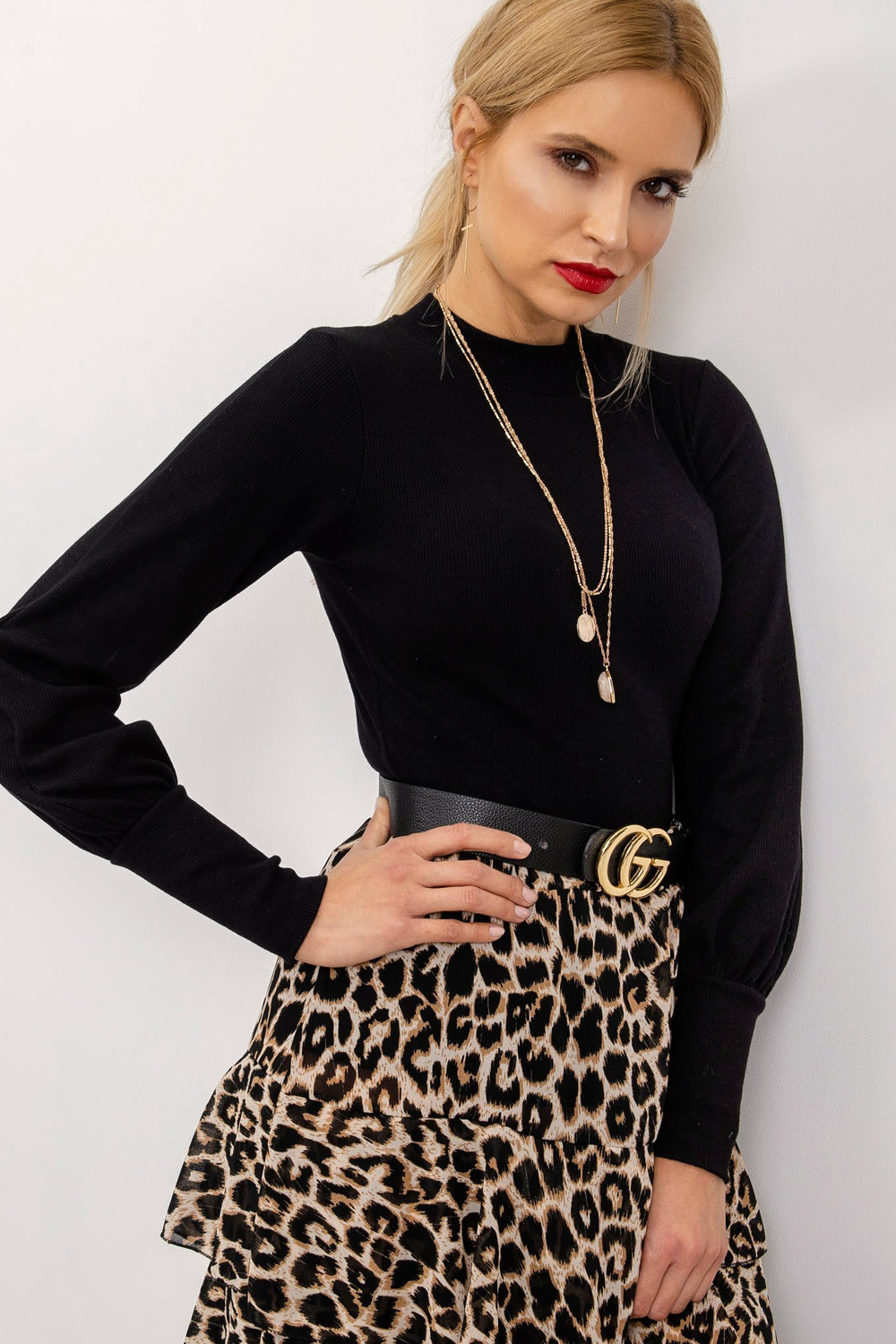 RUEPARIS Melna blūze Lauren. Gluda blūze no rievota auduma ir īsts must have daudzu sieviešu garderobē. Ja meklējat modernu dizainu, kas ir mūžīgs un piemērots daudziem gadījumiem, izmēģiniet šo pamata modeli. Šai sieviešu blūzei ir unikāls piegriezums, ko piešķir modernas pufīgas piedurknes ar daiviņām un nedaudz vairāk izbūvēts kakla izgriezums ar nelielu stāvapkakli. Pateicoties tam, blūze izskatās ļoti šiki un eleganti, un tajā pašā laikā tā būs piemērota daudziem un dažādiem gadījumiem gan ikdienā, gan vairāk sākuma situācijās. Blūze ir izgatavota no augstas kvalitātes materiāliem, kas padara to ļoti patīkamu pieskārienu un labi izstieptu, pateicoties kam to ir ērti valkāt un lieliski pielāgojas figūrai. Sieviešu melnā blūze lieliski izskatās valkāta ar džinsa biksēm vai elegantām cigarelēm.