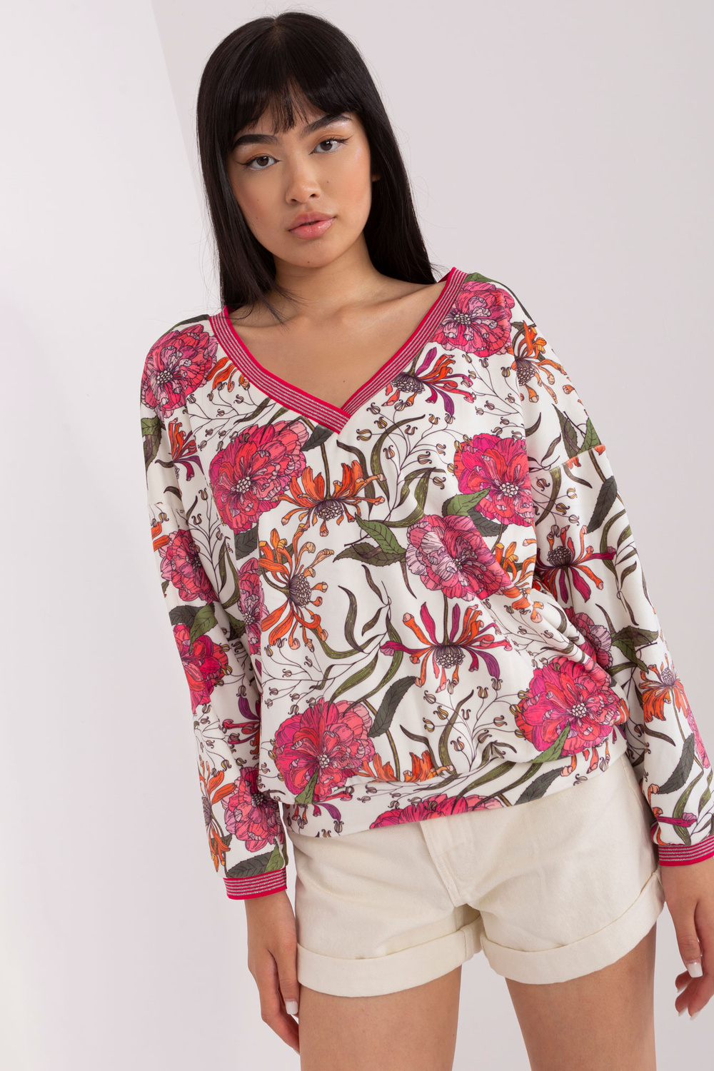 Modeles izmēri blūze S/M izmērā izmērīta plakana: paduses platums - 59 cm, piedurknes garums - 55 cm, kopējais garums - 61 cm.