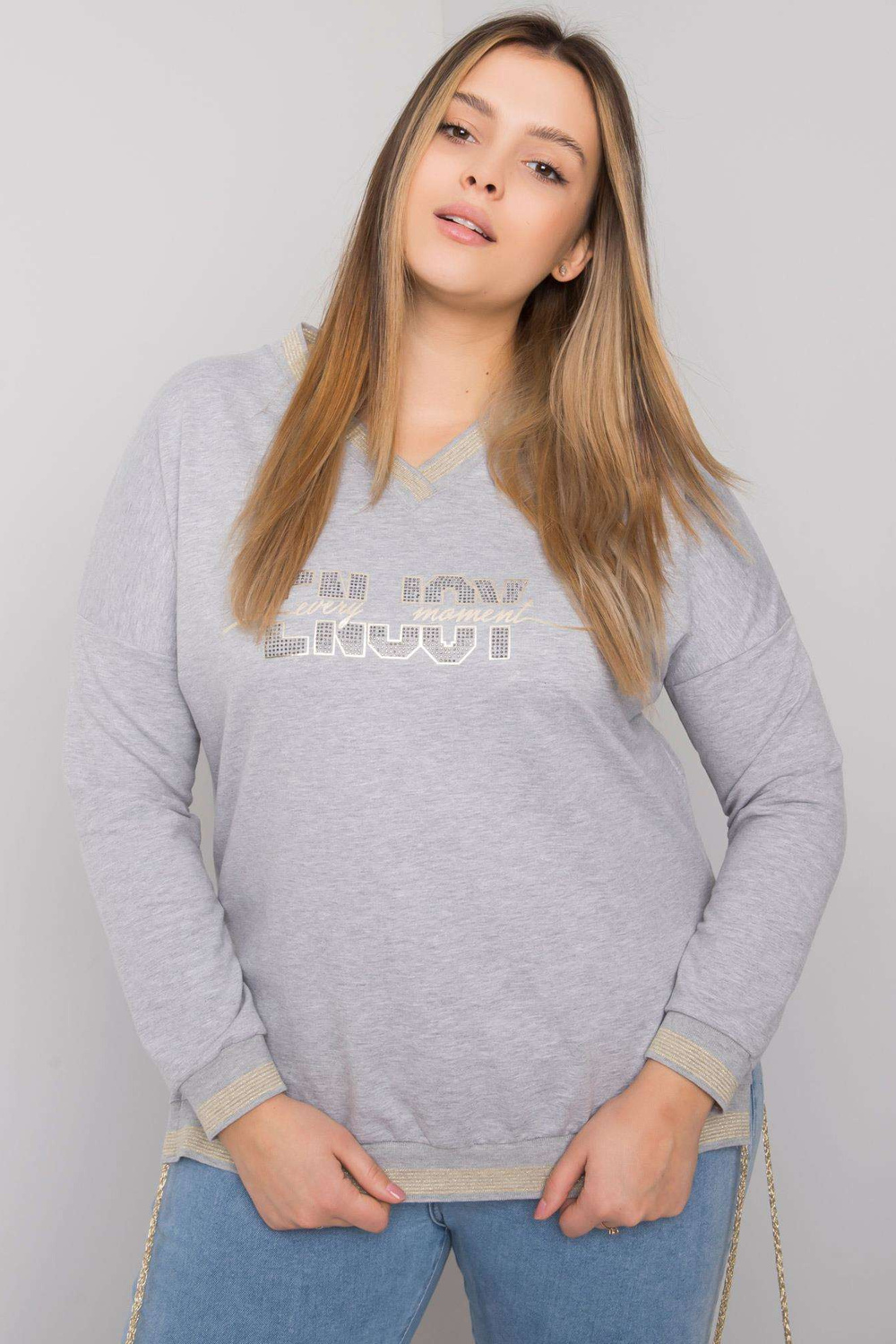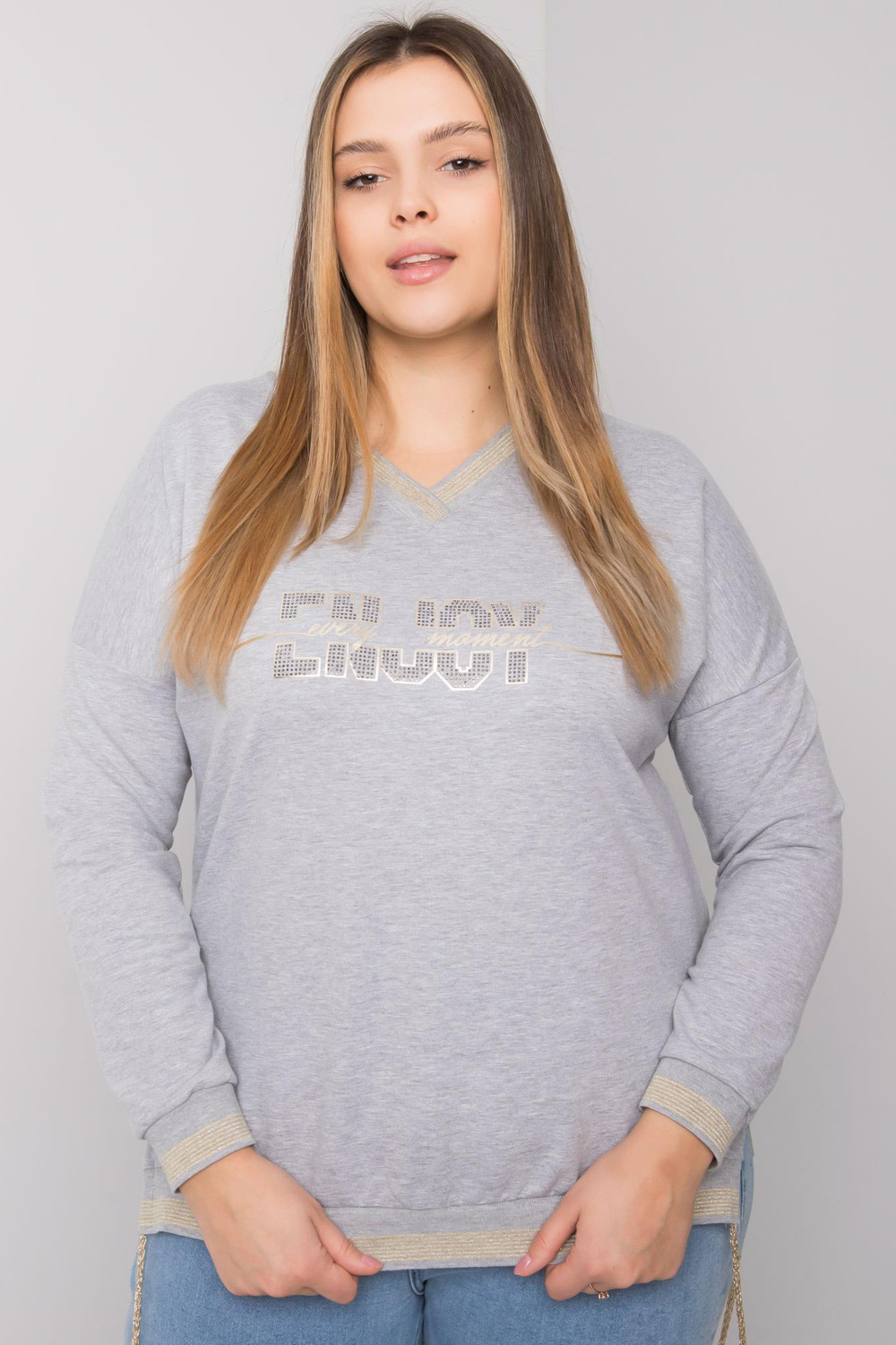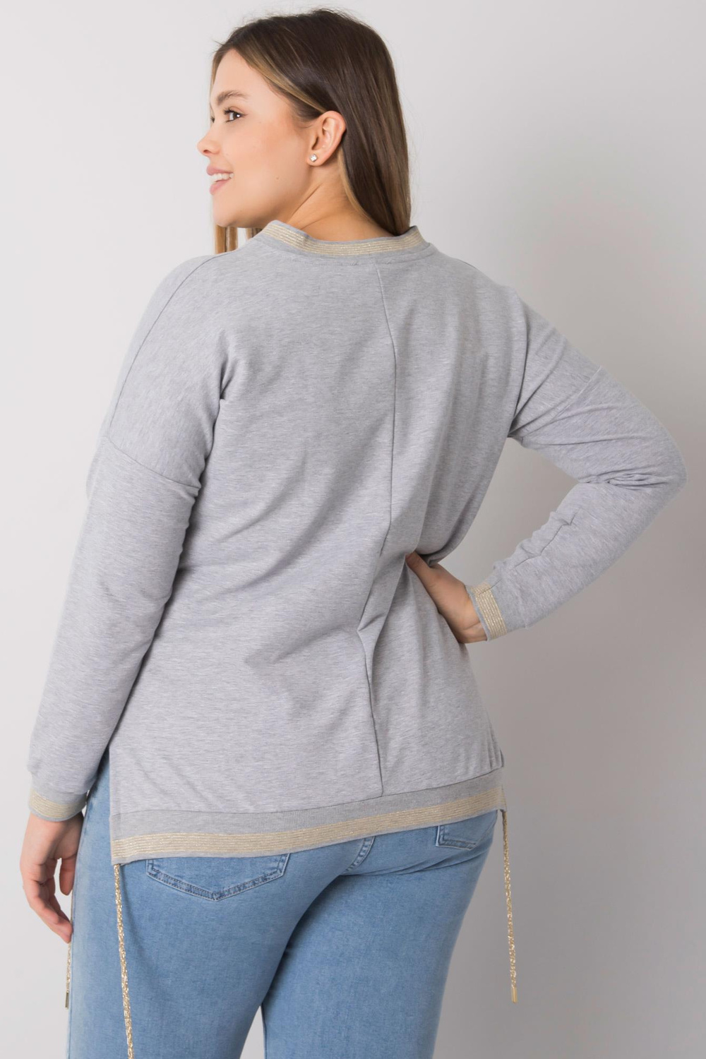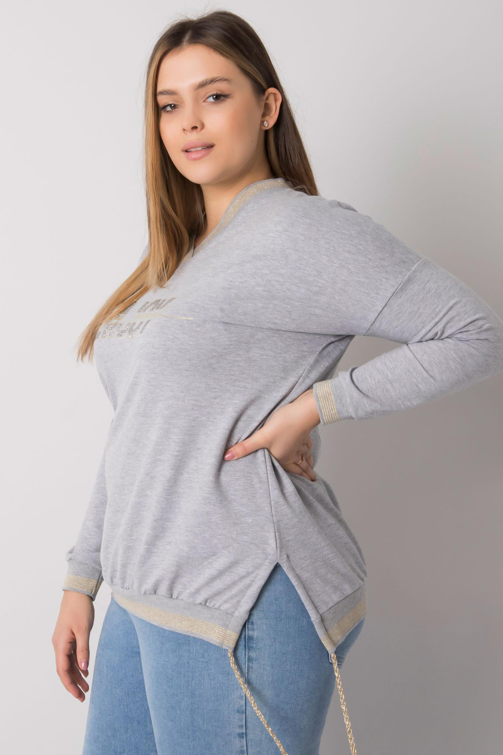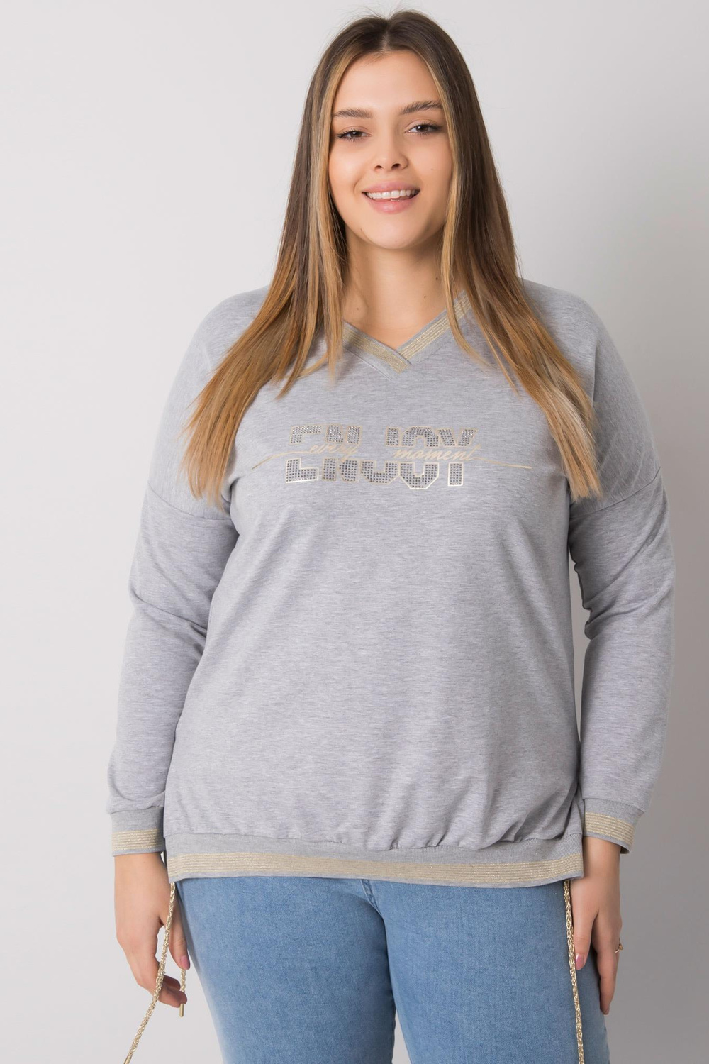 Greymelange liela izmēra blūze ar ceriņu aplikāciju.