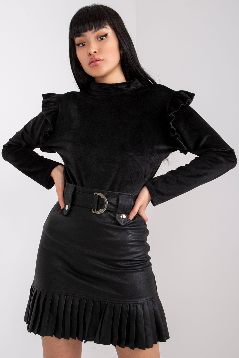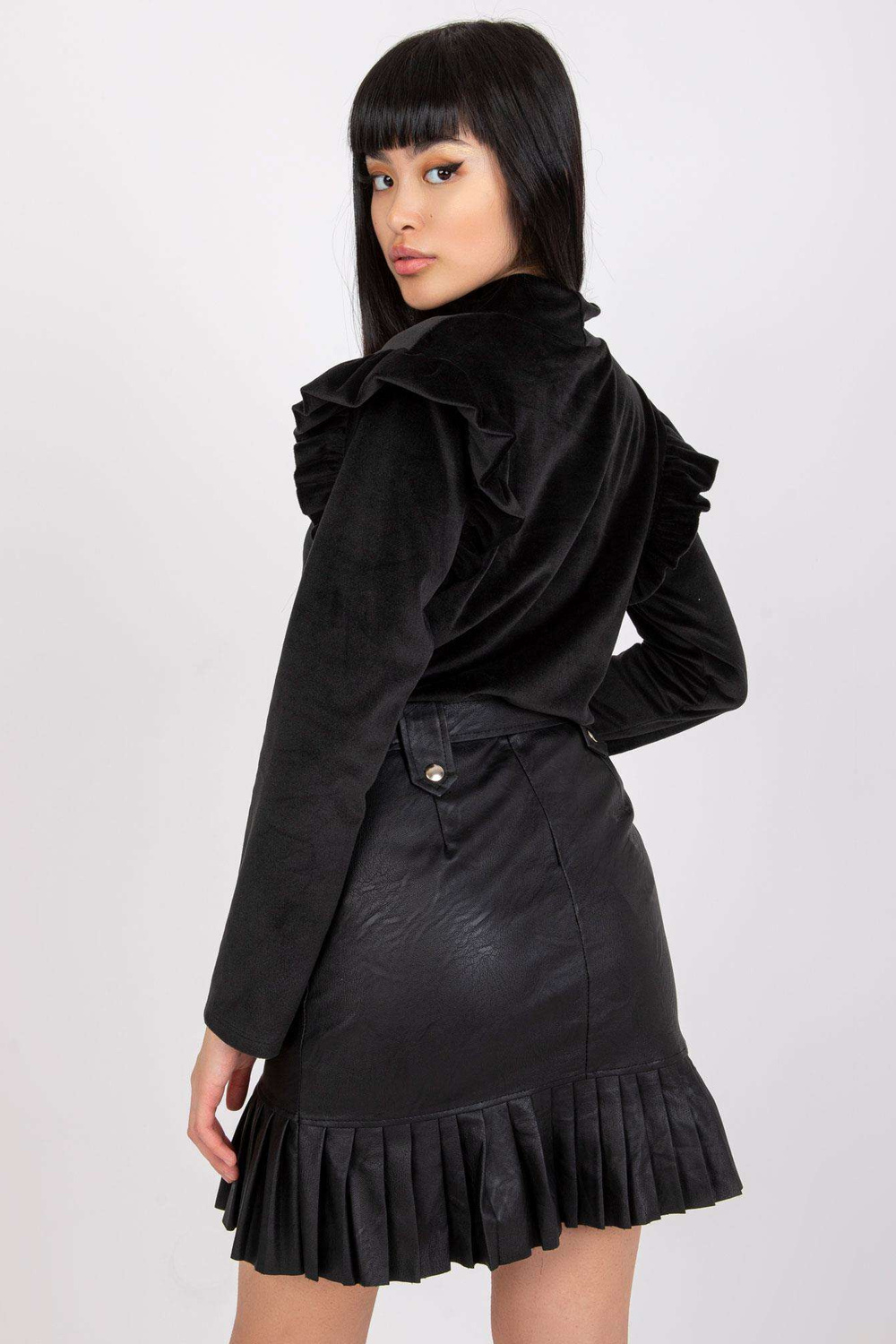 Eugenie melna velūra blūze ar volāniem.