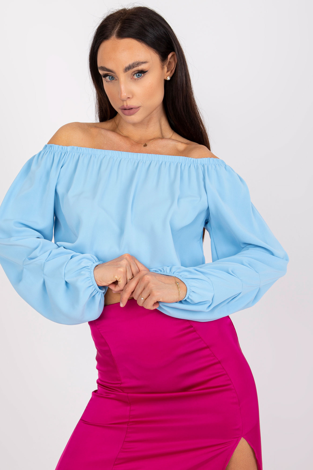Nineli gaiši zila gluda spāņu blūze ar garām piedurknēm.