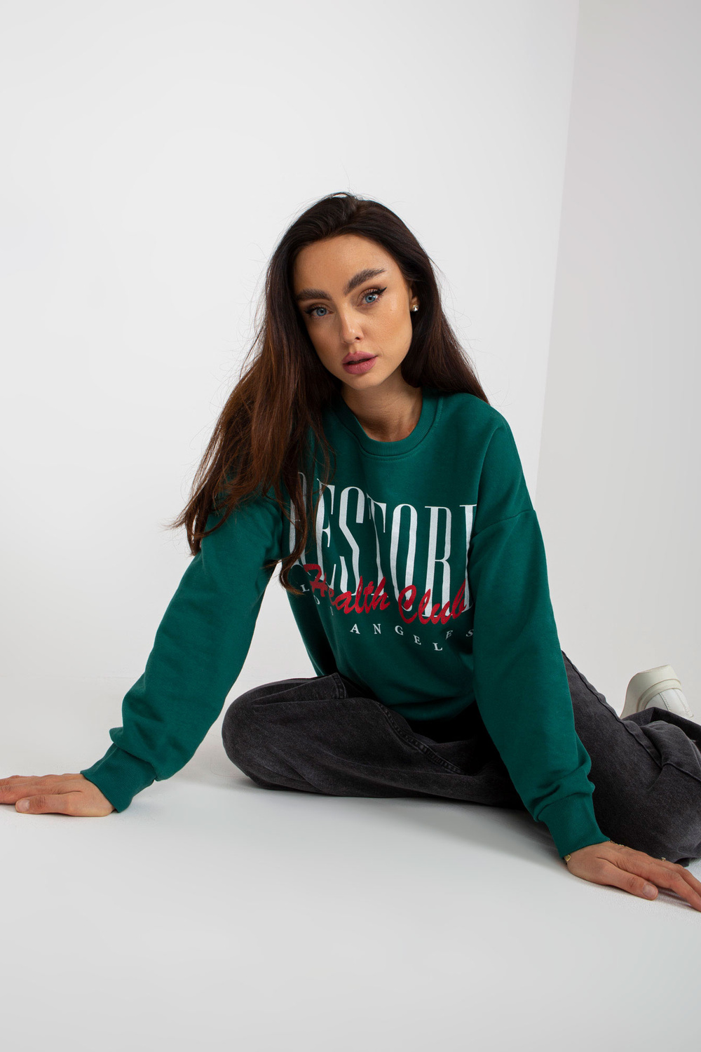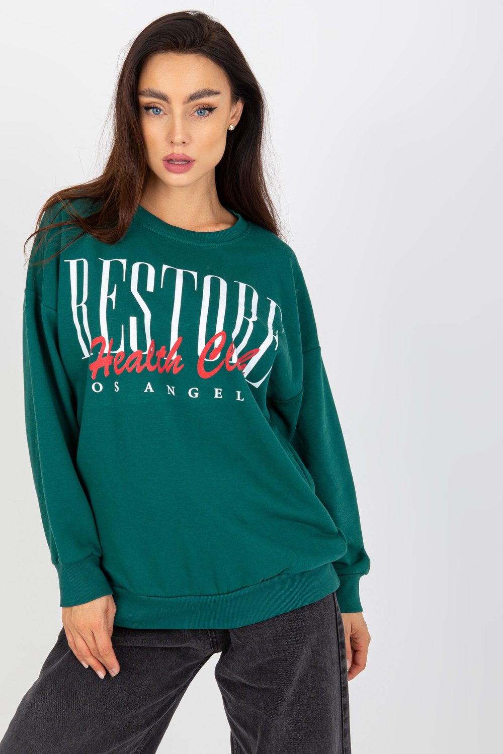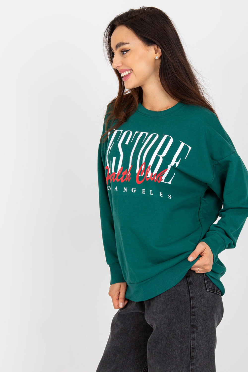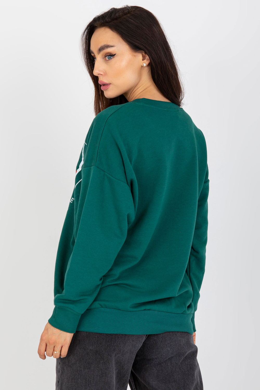 Tumši zaļš kokvilnas sporta krekls ar apdruku.