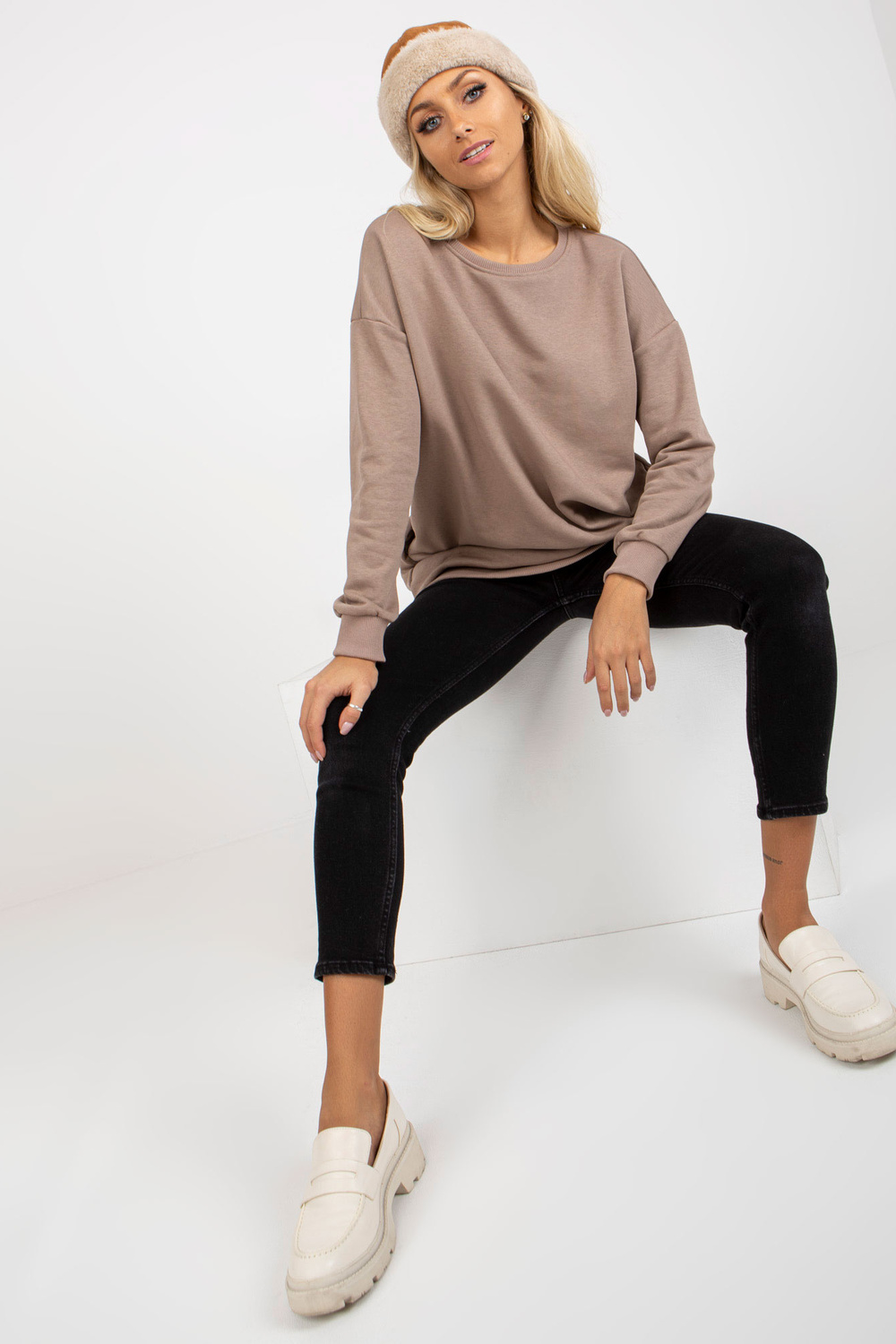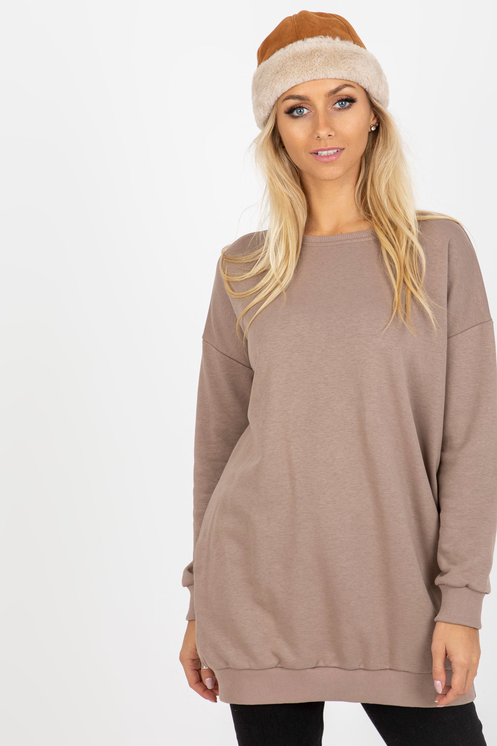 Dunkelbeiges langes Džemperis ar Rundhalsausschnitt. Produkta kods: RRV-BL-8310.60 dominantes Muster: glatt Stils: lässig Anlass: lässig, für einen Spaziergang, in die Stadt, zur Arbeit Das Model trägt eine Einheitsgröße. Maße des Models: Höhe 174 cm, Büs