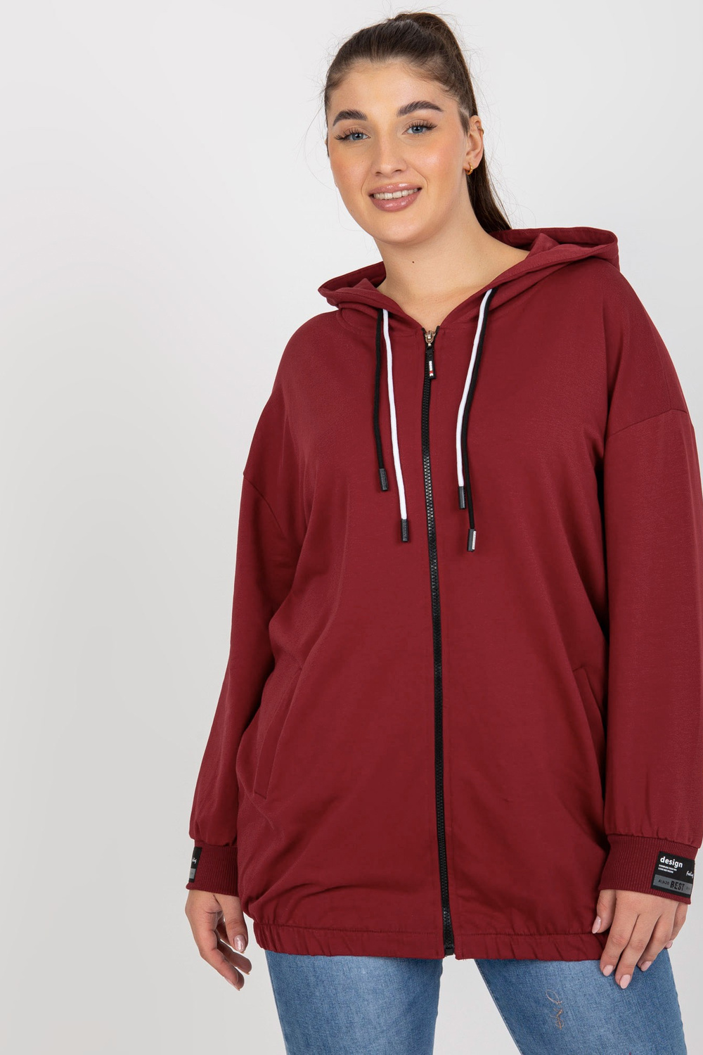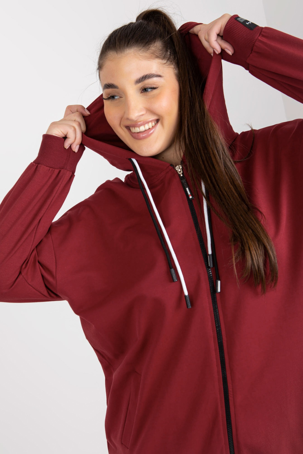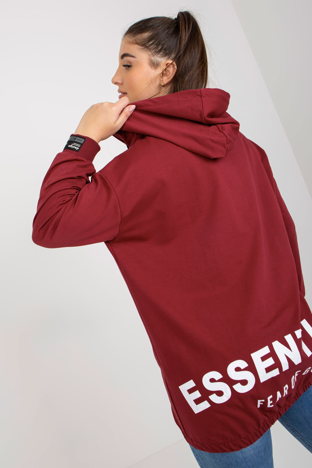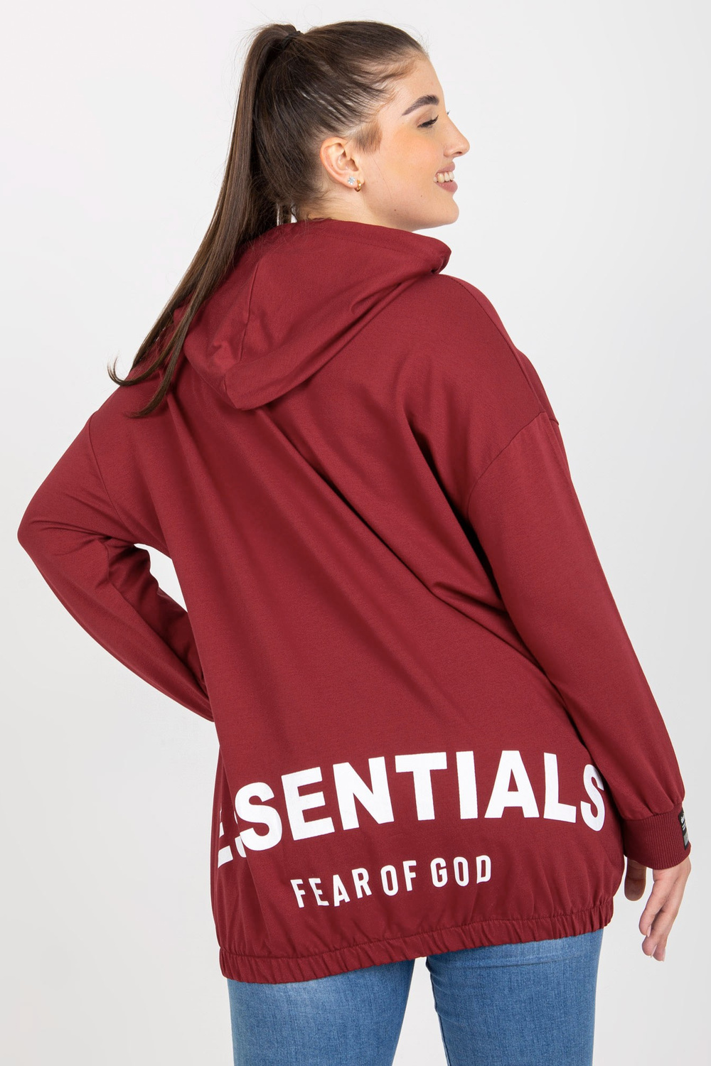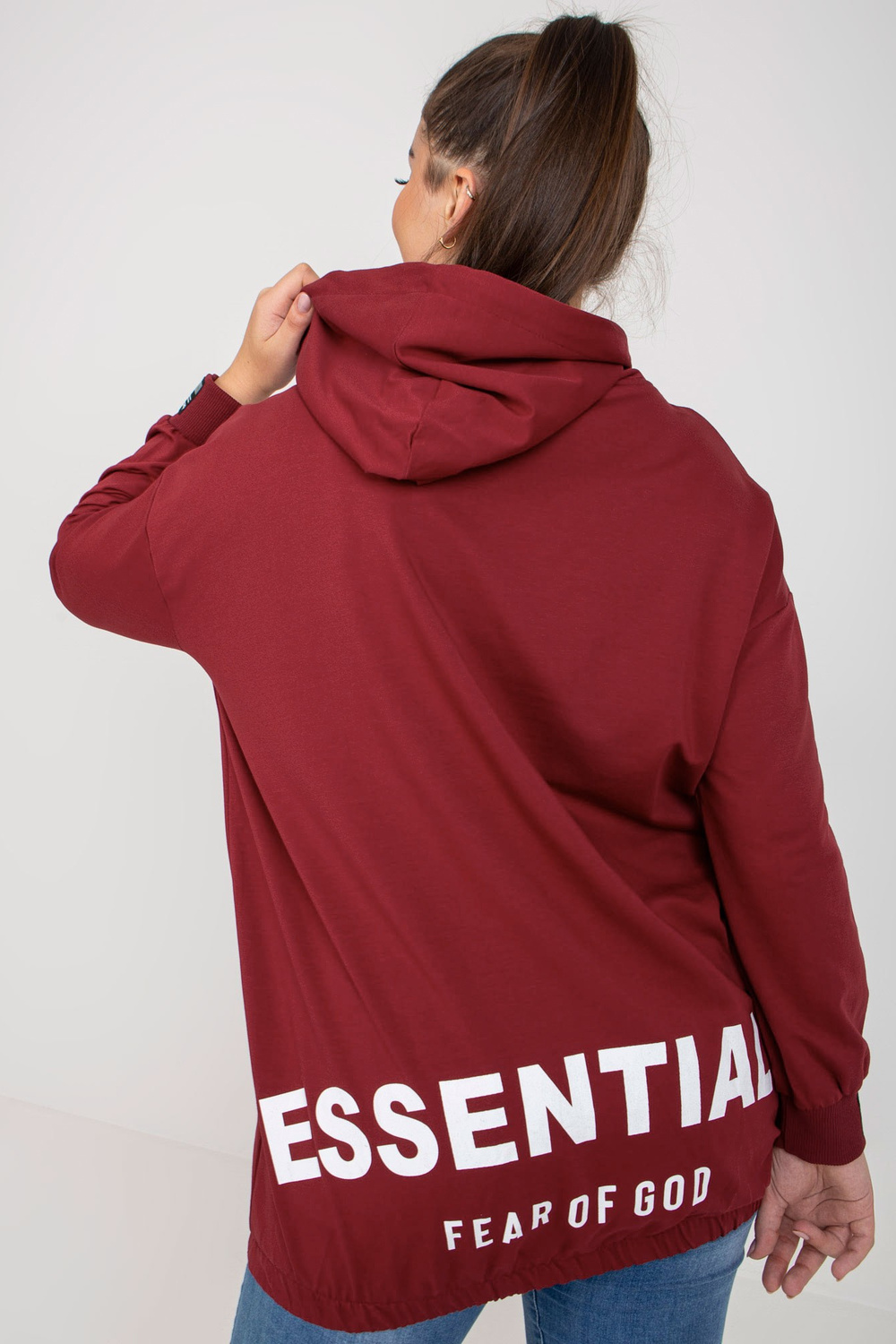 Burgundijas liela izmēra sporta krekls ar uzrakstiem aizmugurē.