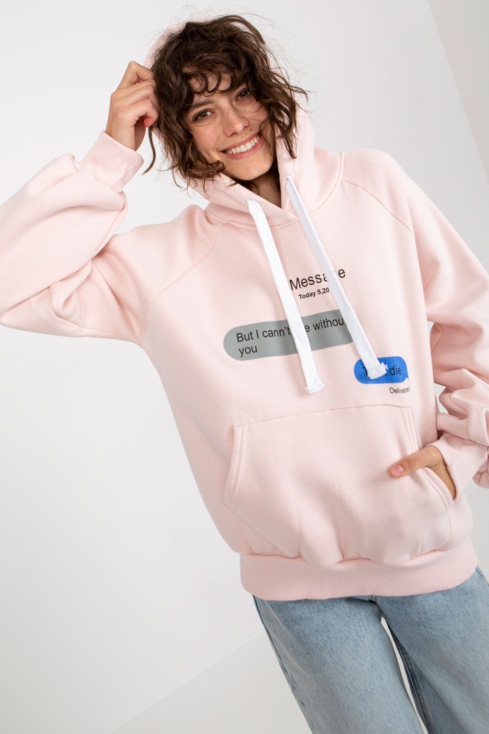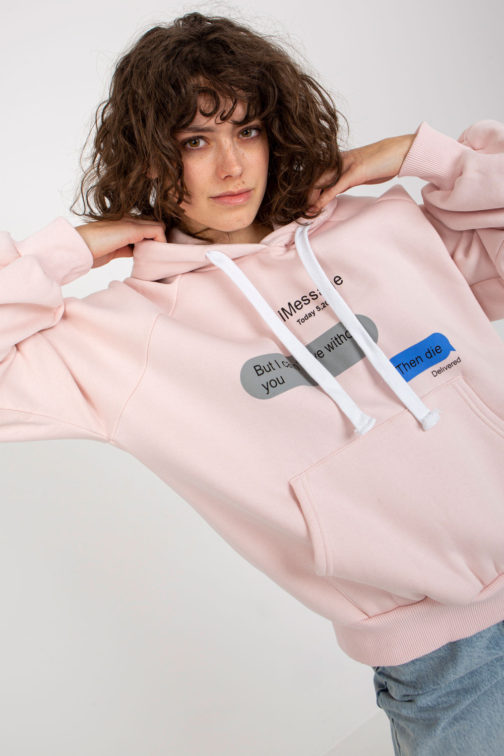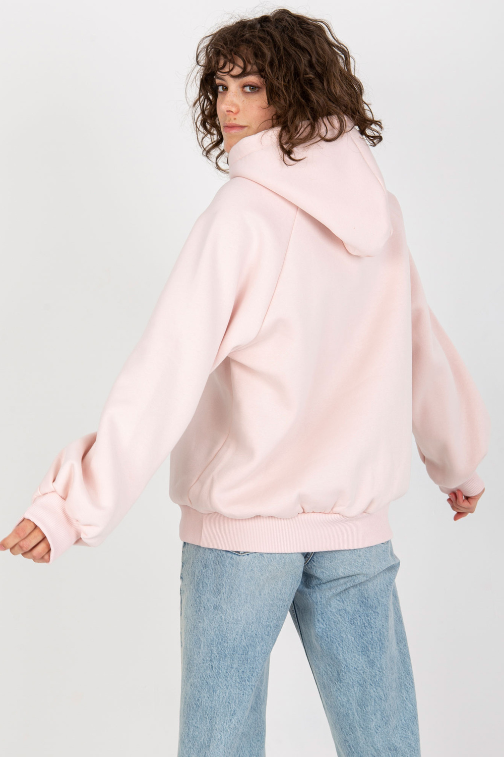 Gaiši rozā sporta krekls ar apdruku un kapuci.