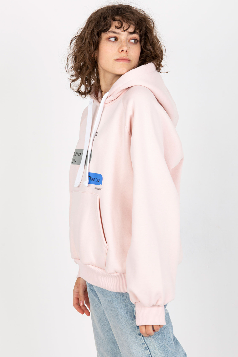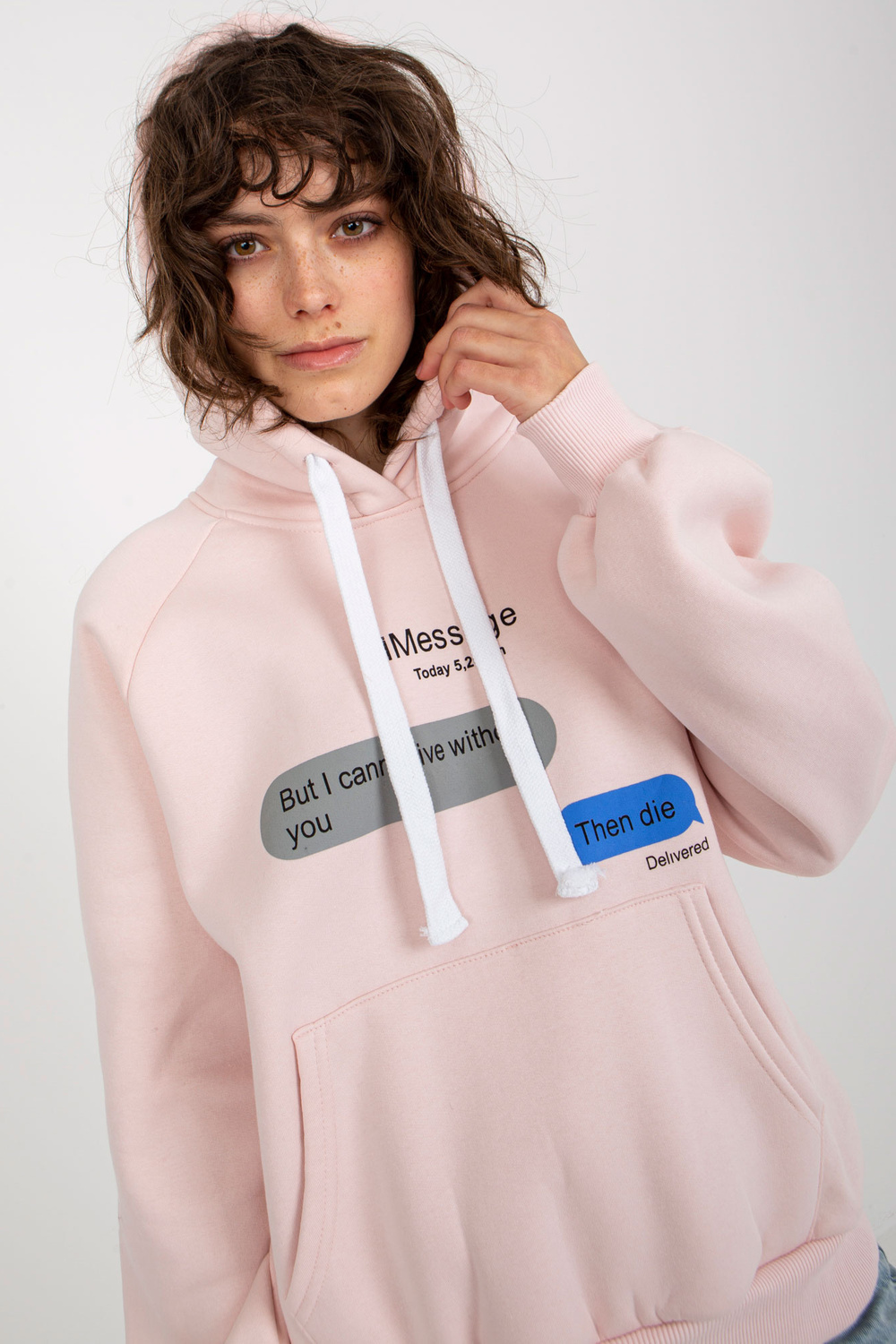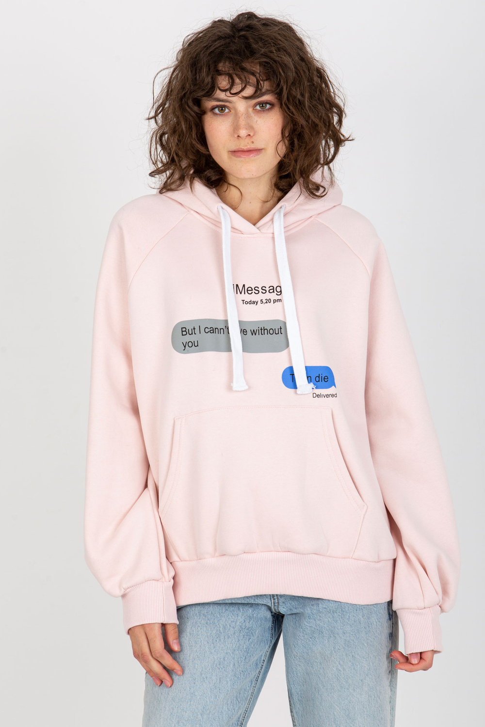 Gaiši rozā sporta krekls ar apdruku un kapuci.