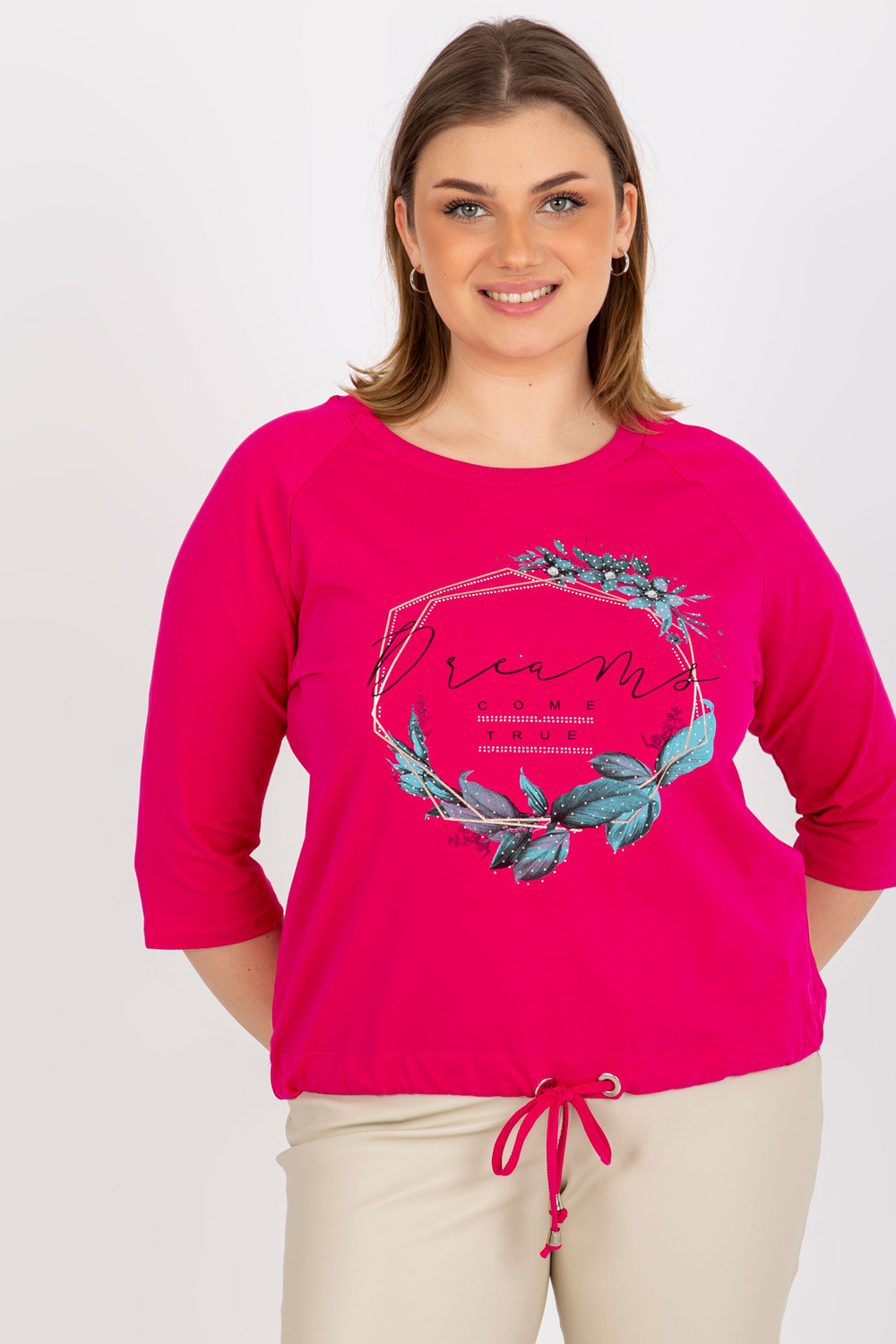Fuksijas lielizmēra blūze ar uzrakstu un rhinestones aplikāciju.