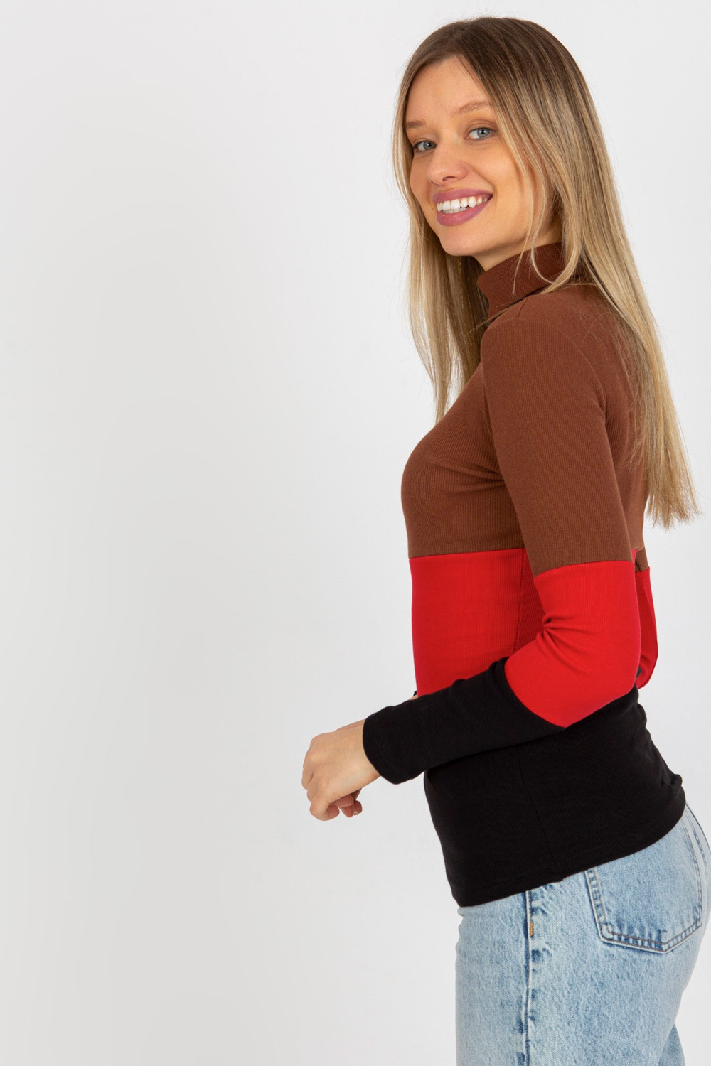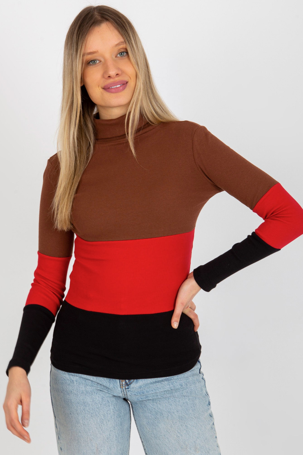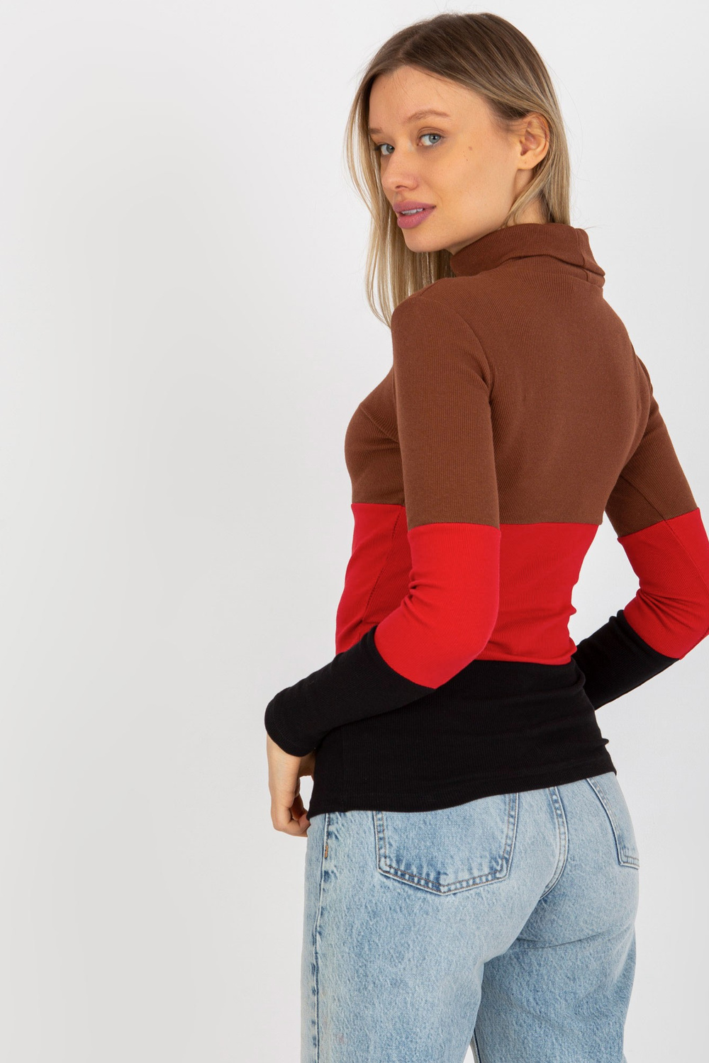Tumši brūna un melna rievota blūze ar bruņurupuču apkakli.