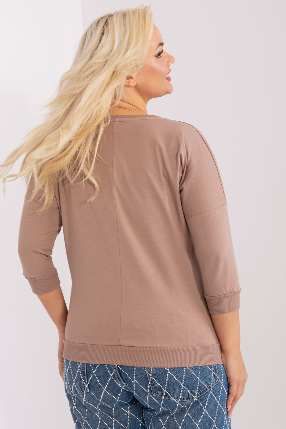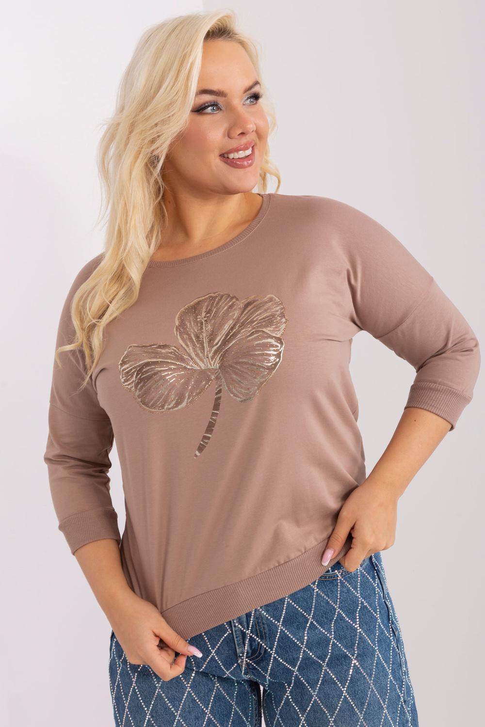 Tumši bēša sieviešu lielā izmēra blūze ar 3/4 piedurknēm .