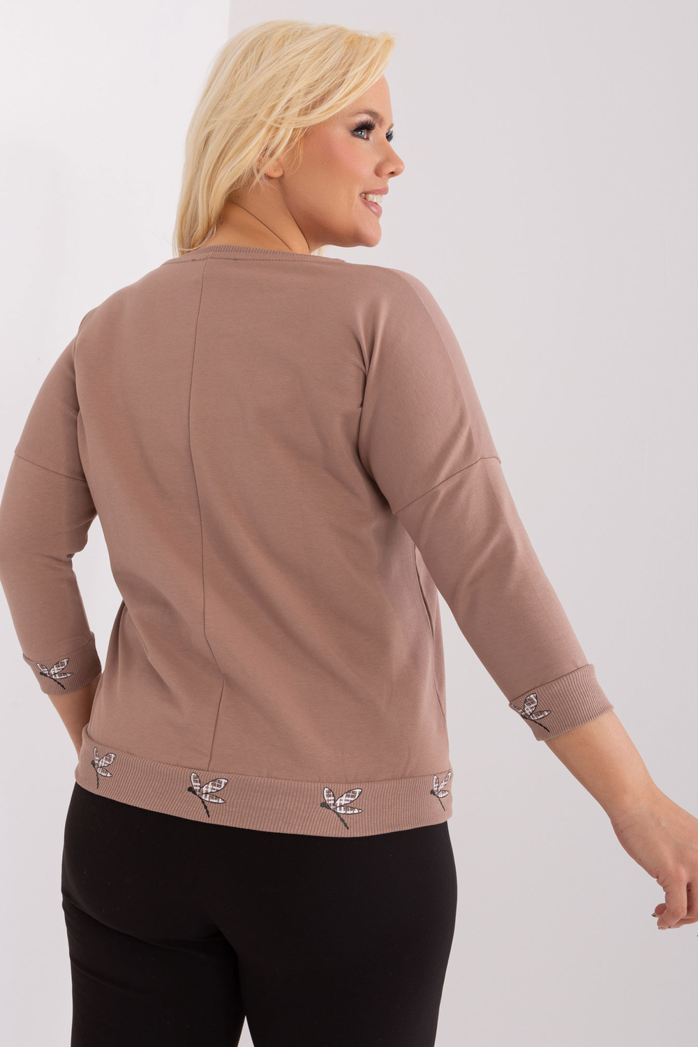Blūzes izmēri viena izmēra izmērā, mērot plakaniski: paduses platums - 60 cm, kopējais garums - 63 cm, piedurknes garums - 42 cm