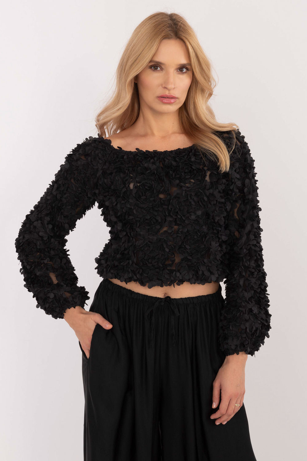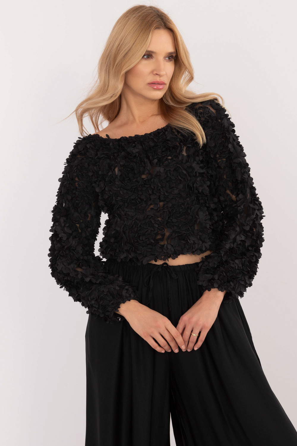 Vienizmēra blūzes izmēri mērīti plakani: paduses platums - 46 cm, piedurknes garums - 58 cm, kopējais garums - 43 cm.
