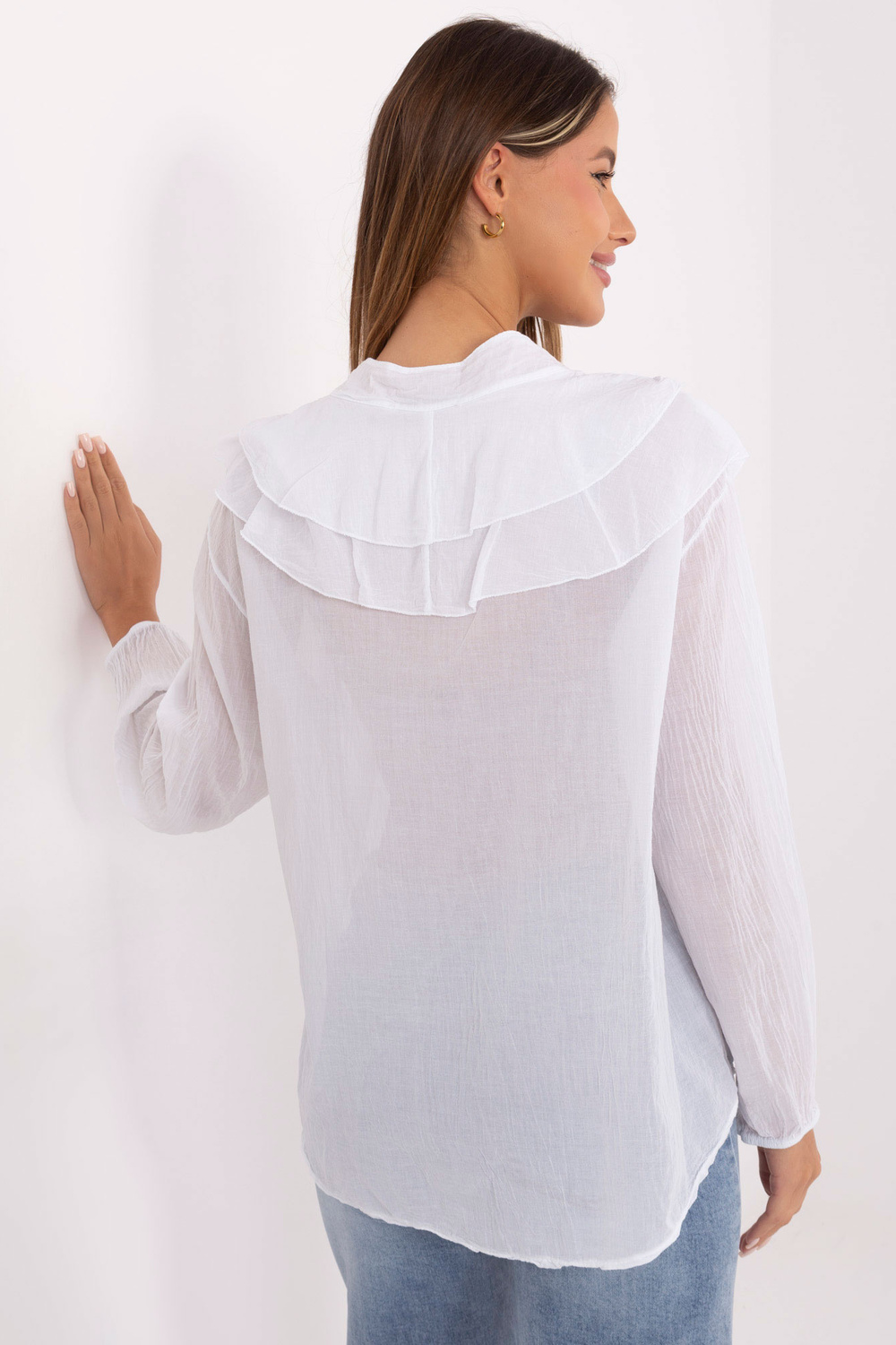 Viens izmērs blūzei, mērīts guļus stāvoklī: platums zem padusēm – 60 cm, piedurknes garums – 56 cm (no šuves), platums gurnu daļā – 61 cm, kopējais garums – 67 cm.