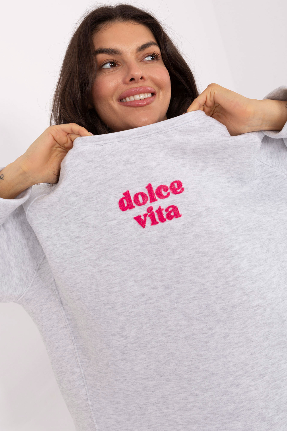 Modelis valkā one size izmēra apģērbu. Modeļa izmēri: augums 173 cm, krūtis 85 cm, viduklis 62 cm, gurni 95 cm.